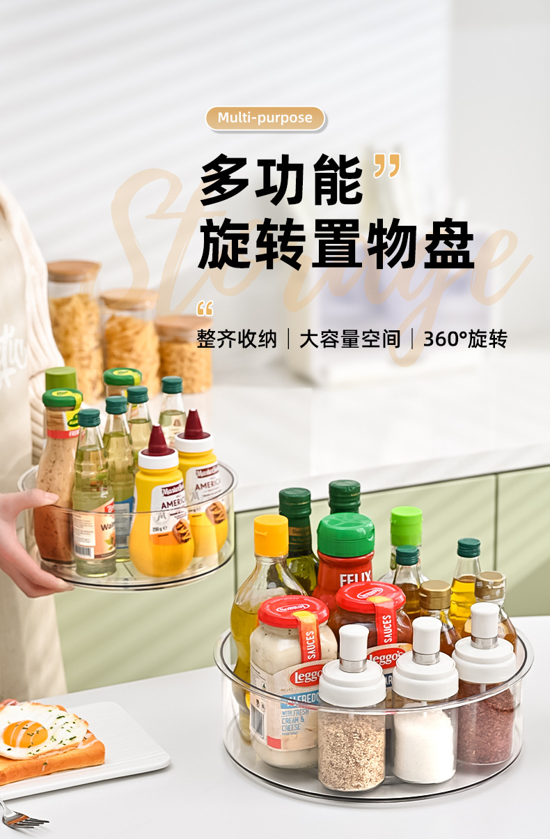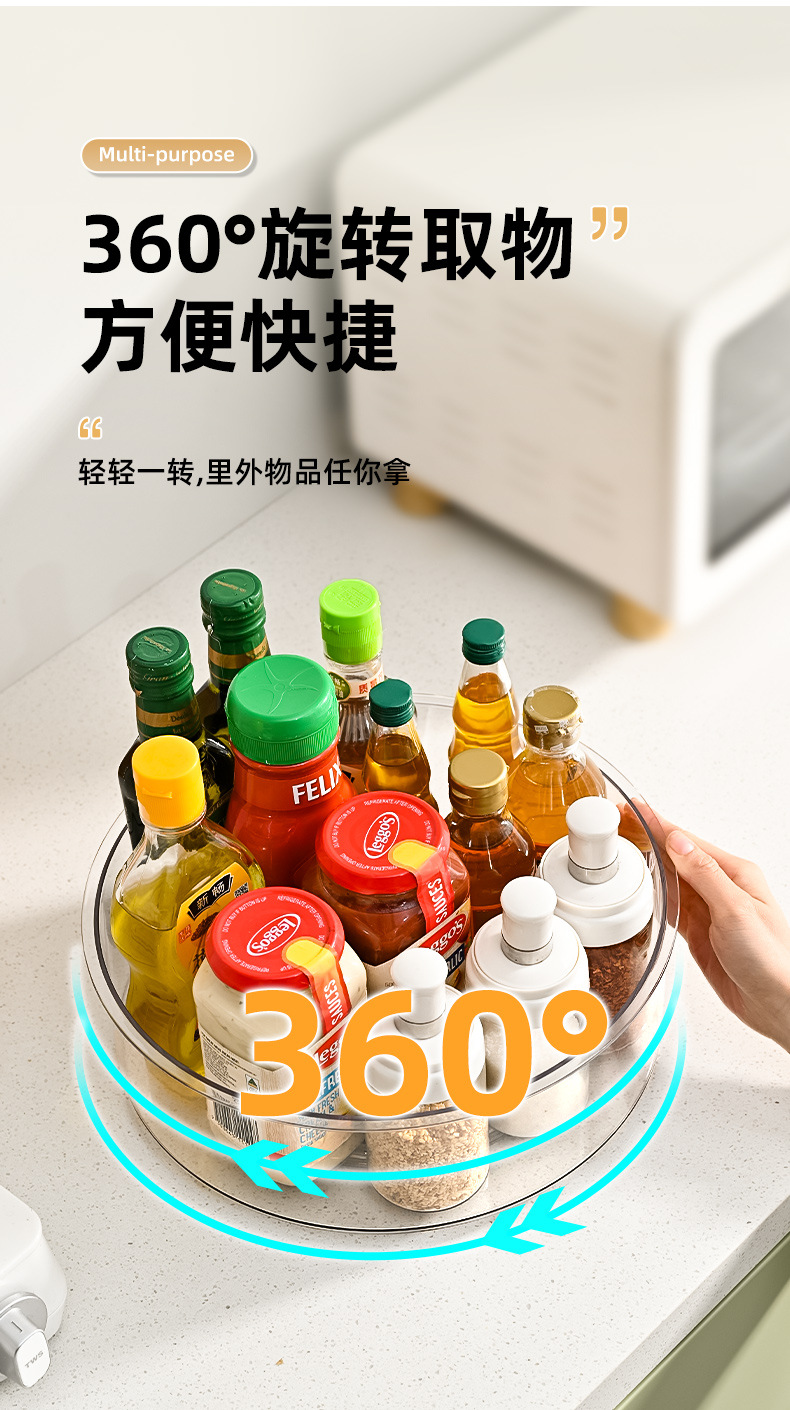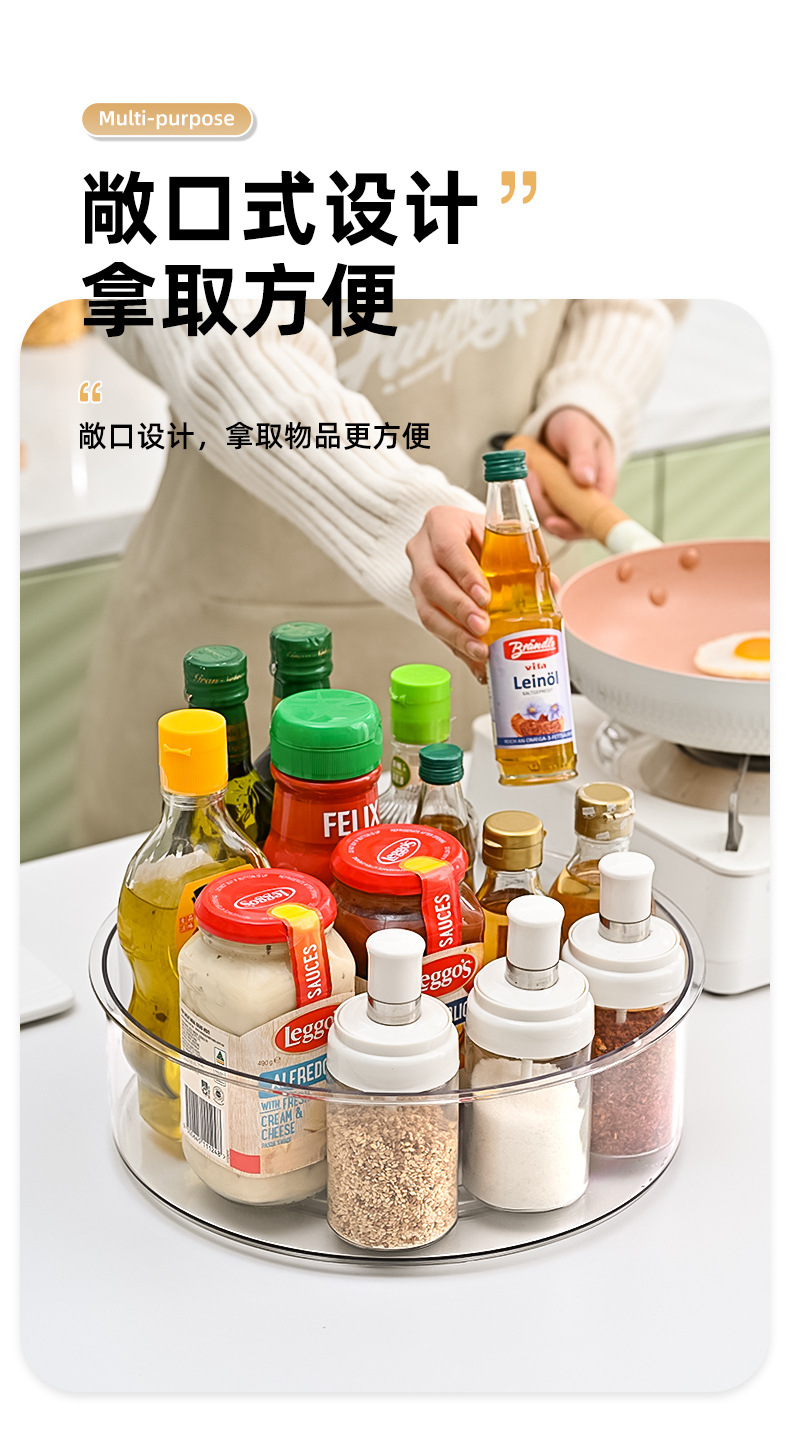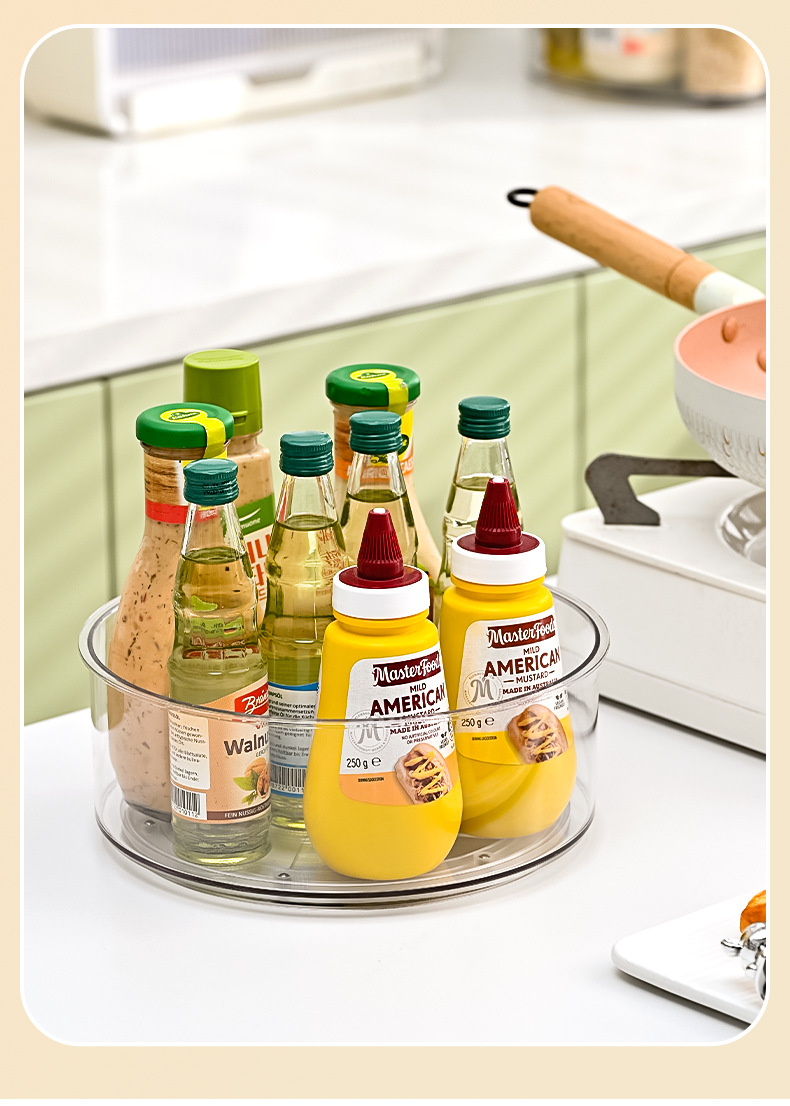 Estante de cocina doméstico multifuncional, transparente PET, giratorio 360°, para condimentos, frutas o escritorio.
