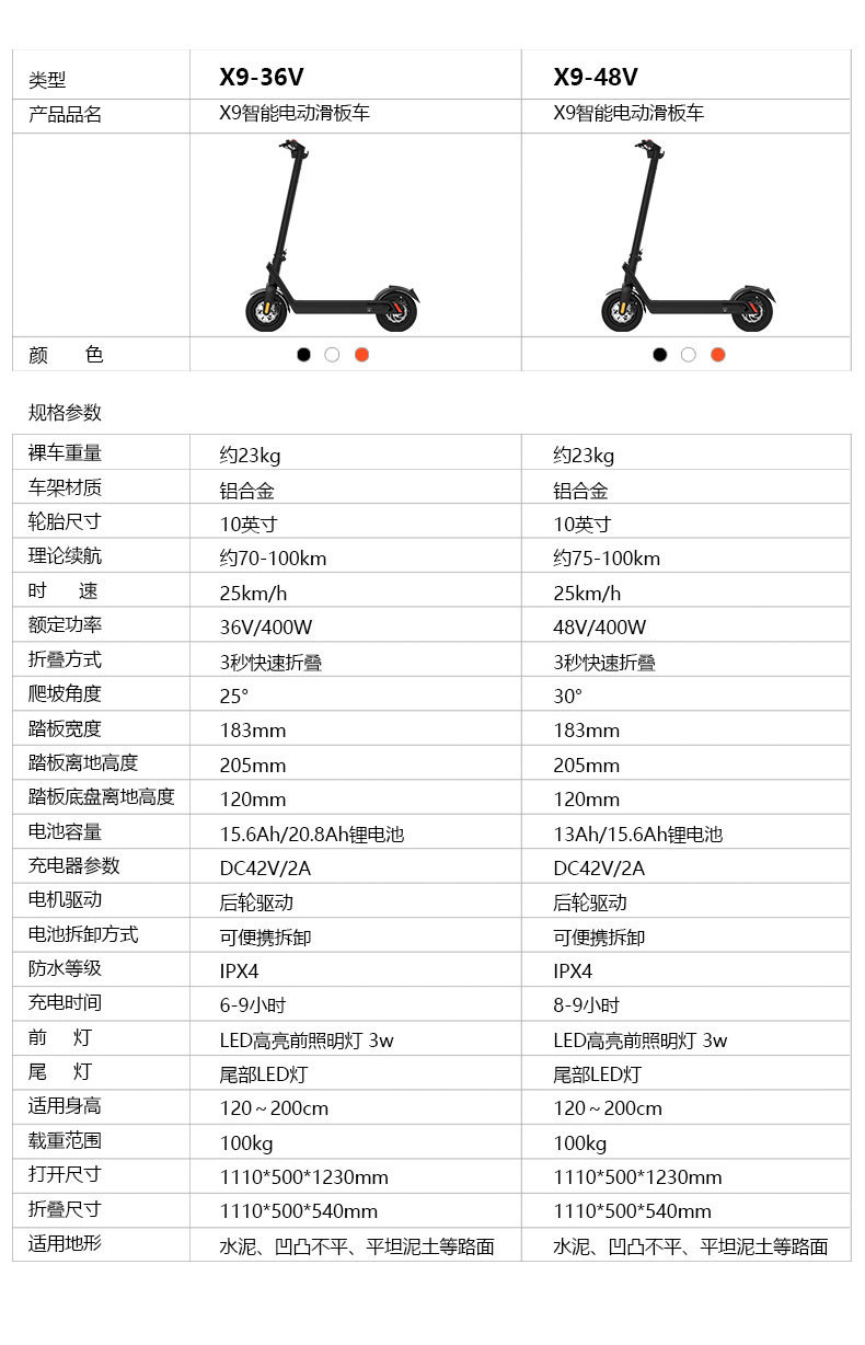 | Colores | Negro/X10 GT/amortiguador/doble tracción delantera y trasera/48V/18.2Ah/batería de 100km,X9Pro Max/48V/15.6Ah/100km,Naranja/X9 Plus/36V/15.6Ah/60km,X8{10 pulgadas/36V1 0Ah/350W/30-40km,X7/10 pulgadas/36V 5.0Ah/350W/20km,Negro/X9 Plus/36V/15.6Ah // 60km |
