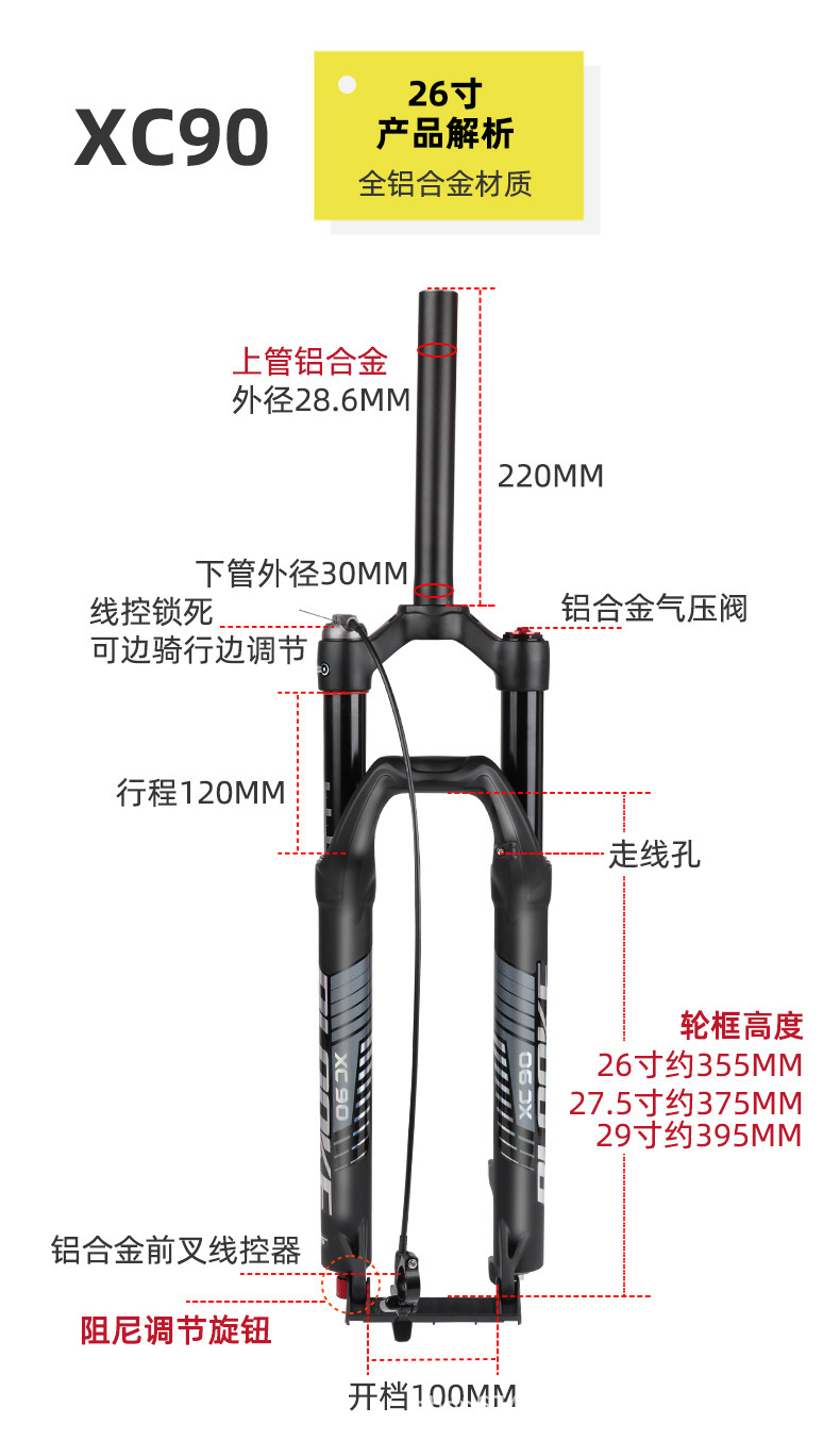 Horquilla de aire XC90-27.5-inch controlada por cable negro mejorada con amortiguación