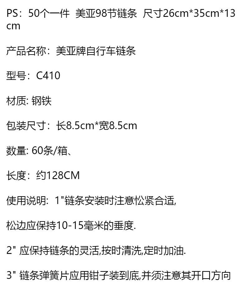 Meiya 98-Sección bicicleta plegable de una sola velocidad de tensión de cadena 800kg Cadena de volante de una sola pieza de vehículo eléctrico autopropulsado