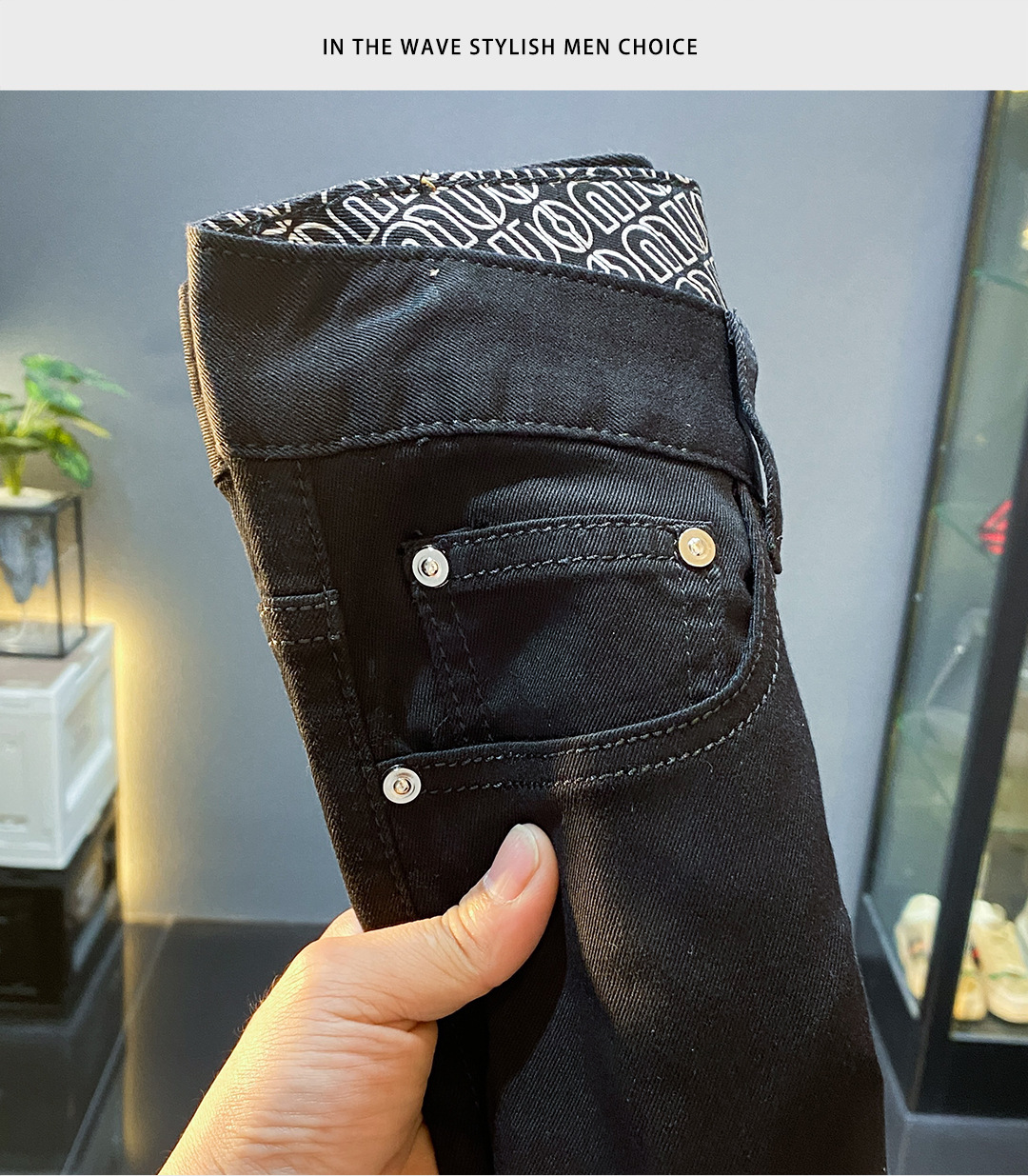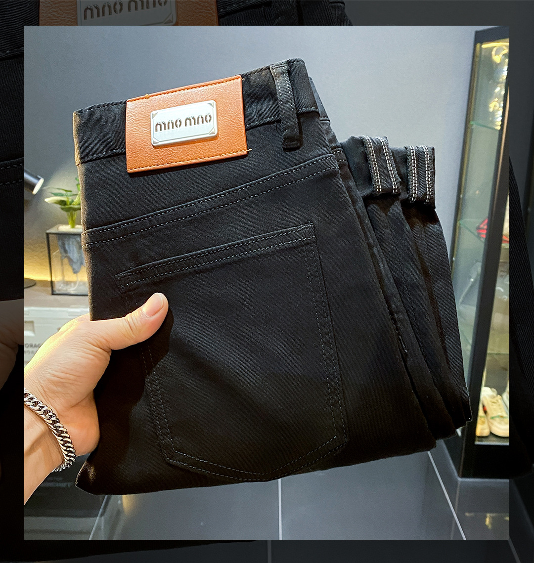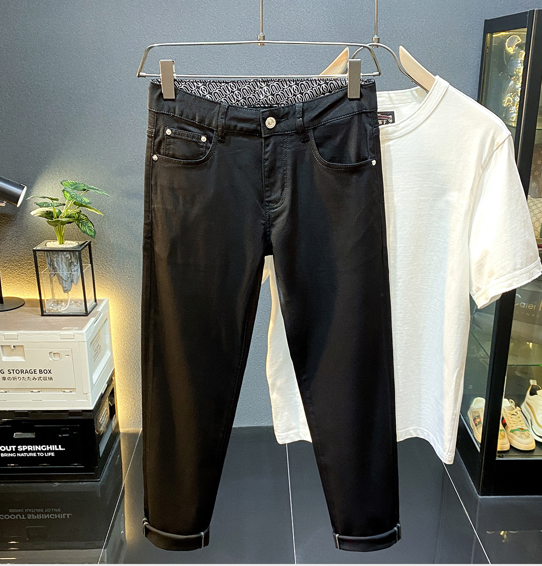 High-end Lesel verano delgado puro negro jeans hombre delgado pie pequeño pantalones americanos de calzado de calzado