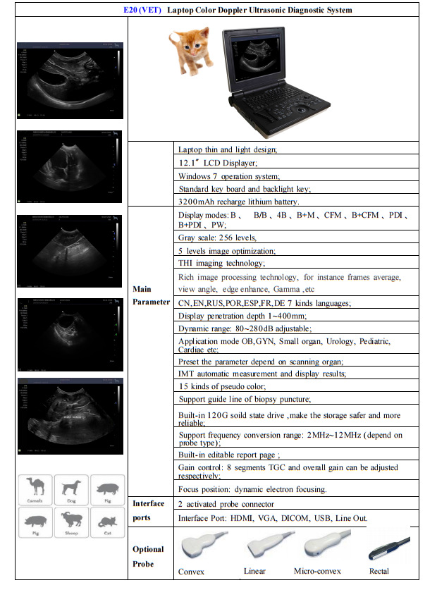 EspecificacionesMáquina portátil de ultrasonido en color para animales de comercio exterior 20 host, sonda de matriz convexa, sonda lineal, sonda microviaguda, sonda rectal, software 3D