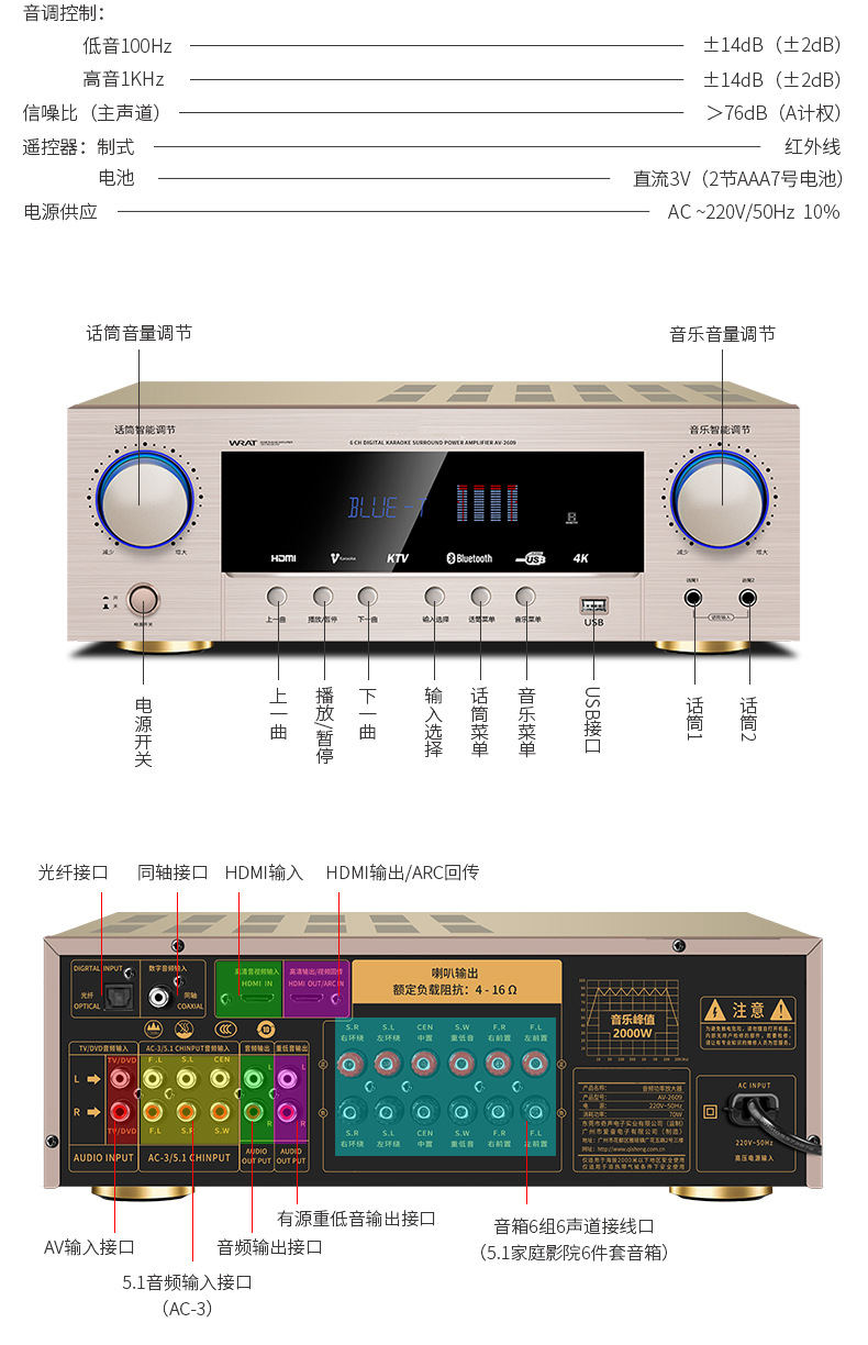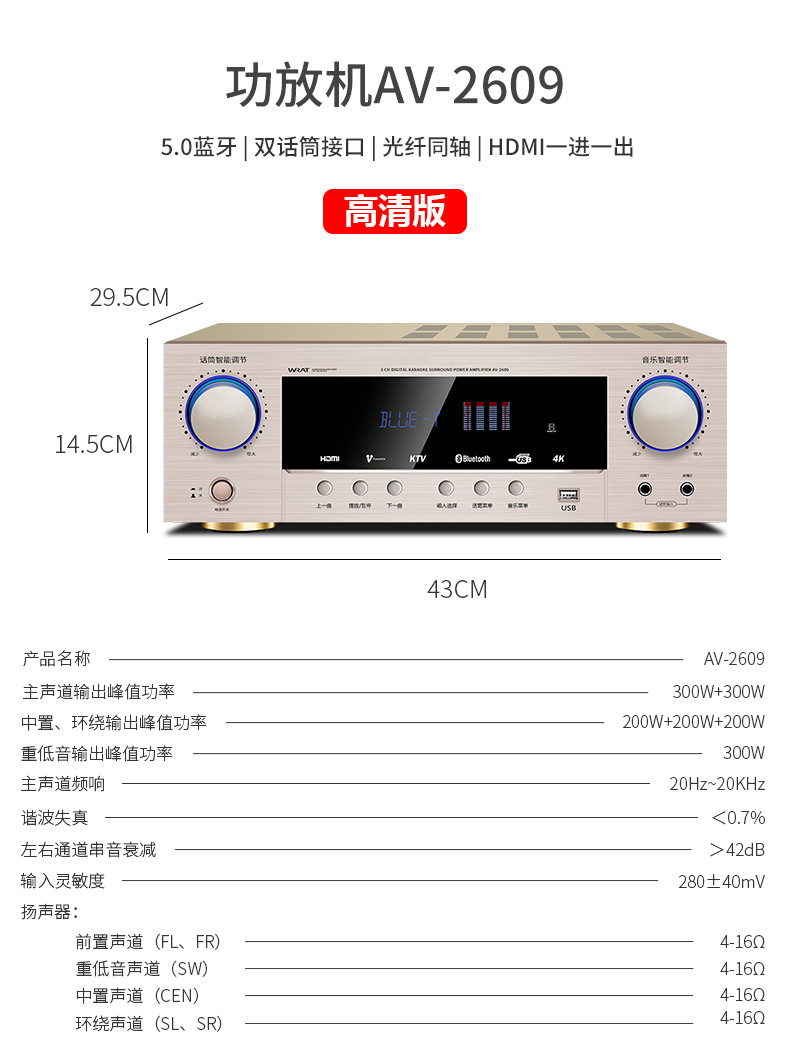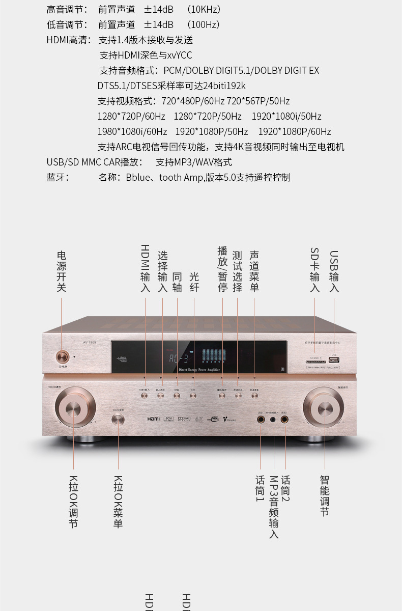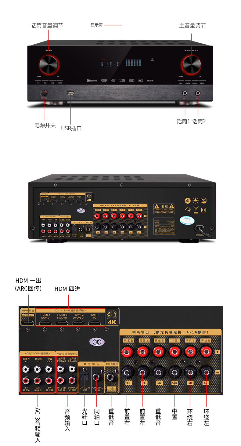 HD HDMI profesional de alta potencia 5,1 canales 4K hogar karaoke Bluetooth karaoke DTS amplificador de potencia