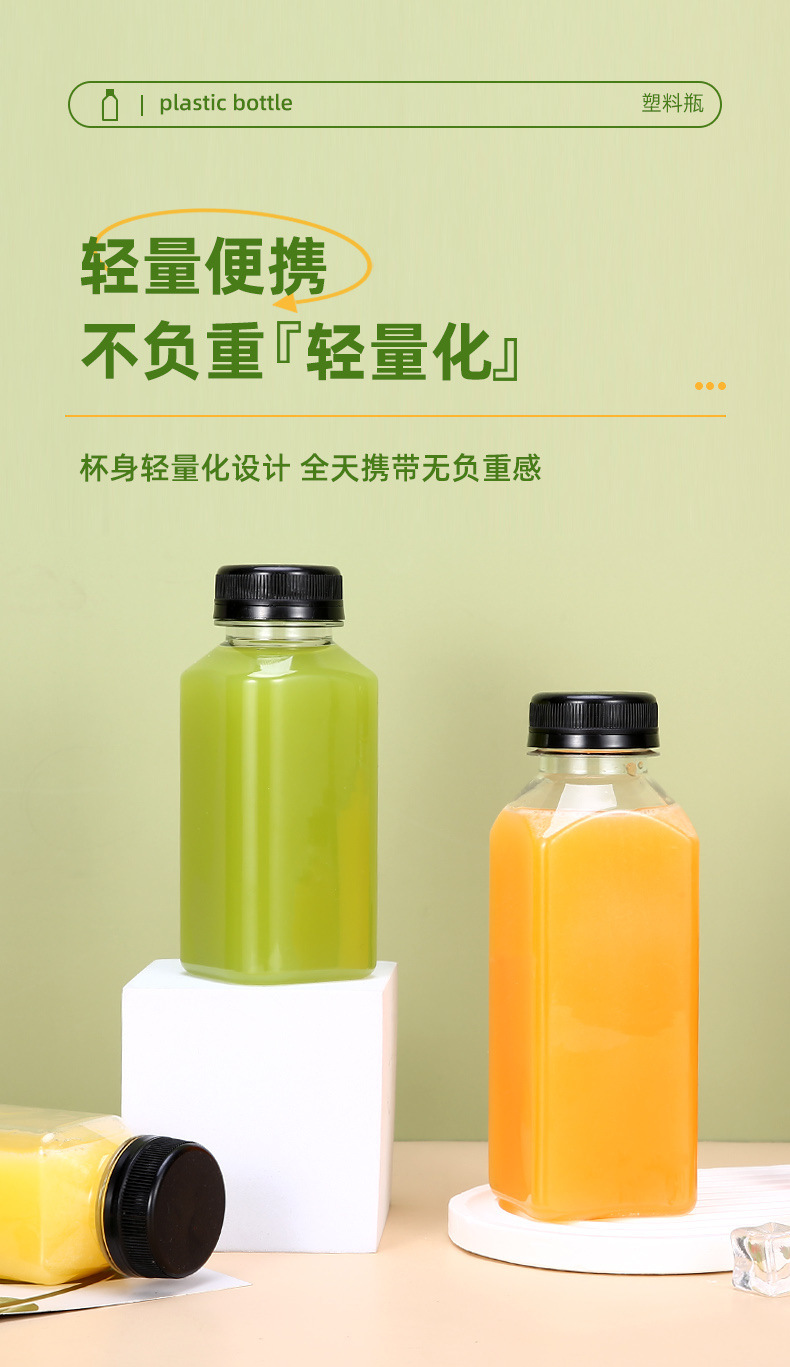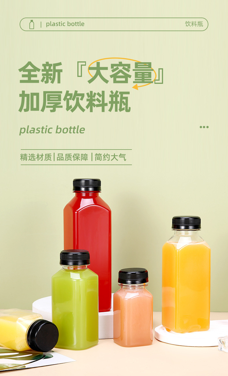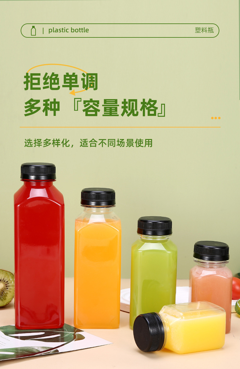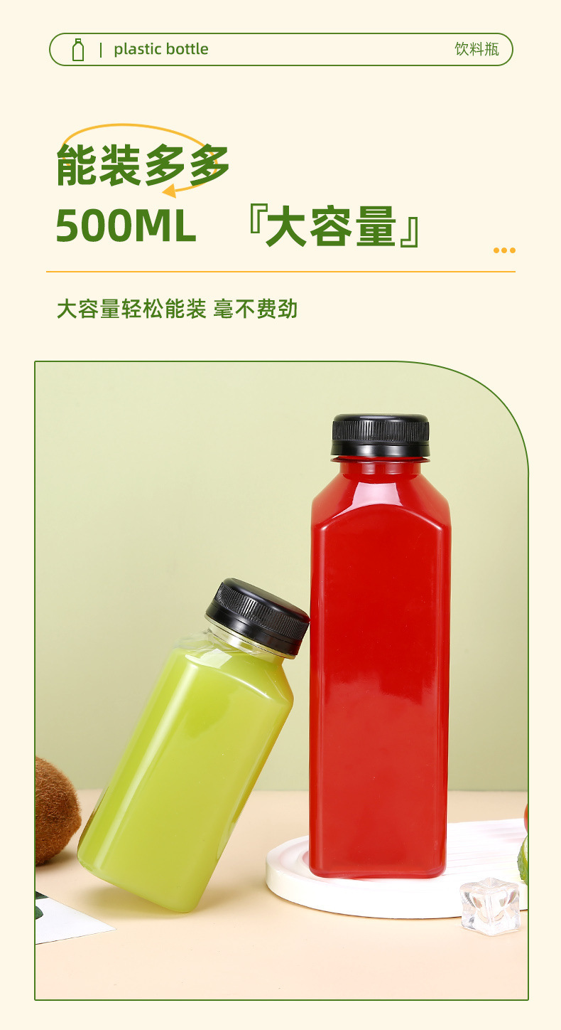 Fabricante spot 38 botella de té de leche cuadrada botella de bebida transparente de plástico con tapa botella vacía de jugo de red de grado alimenticio