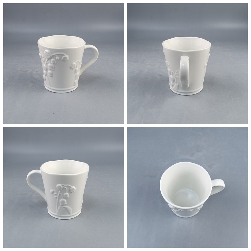 Taza de agua de lirio de los valles en relieve blanco puro simple Taza de cerámica creativa de temperatura media Taza de café elegante de oficina