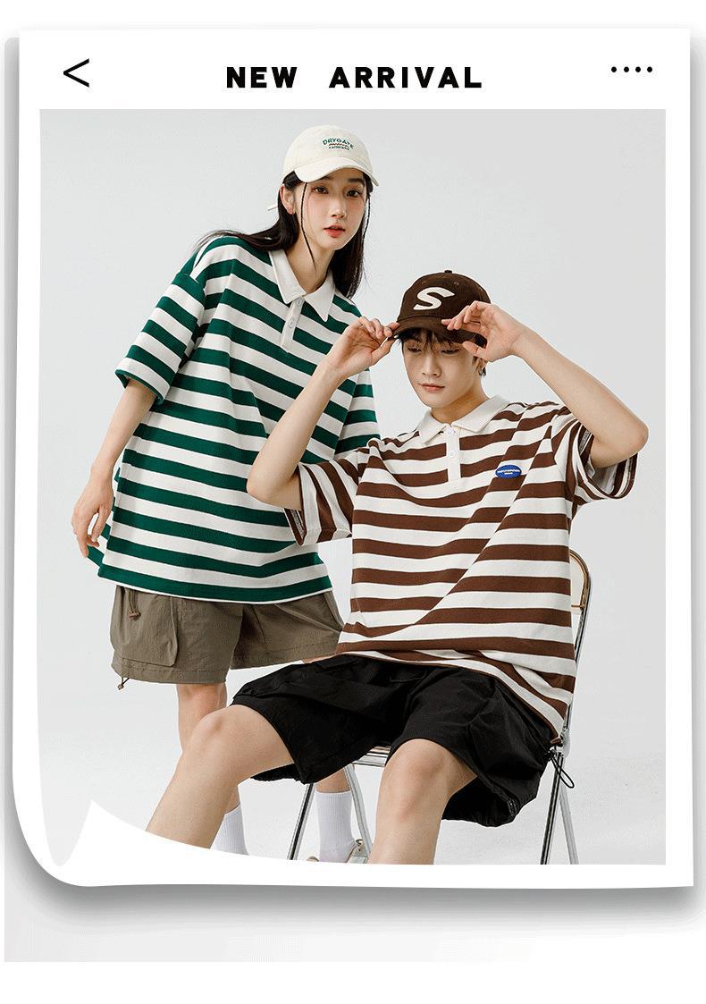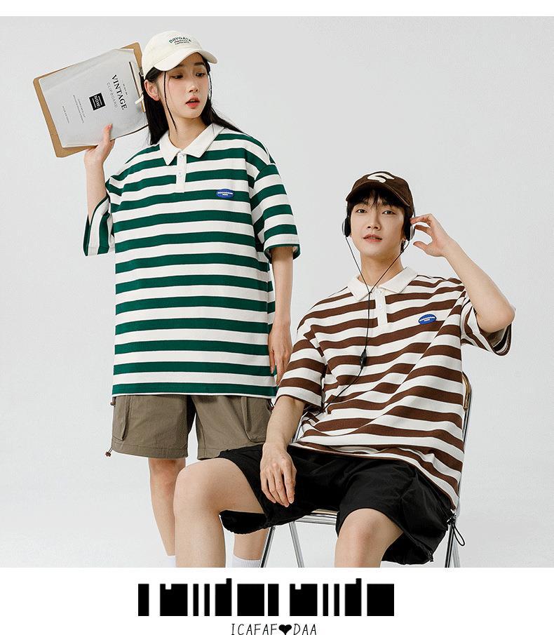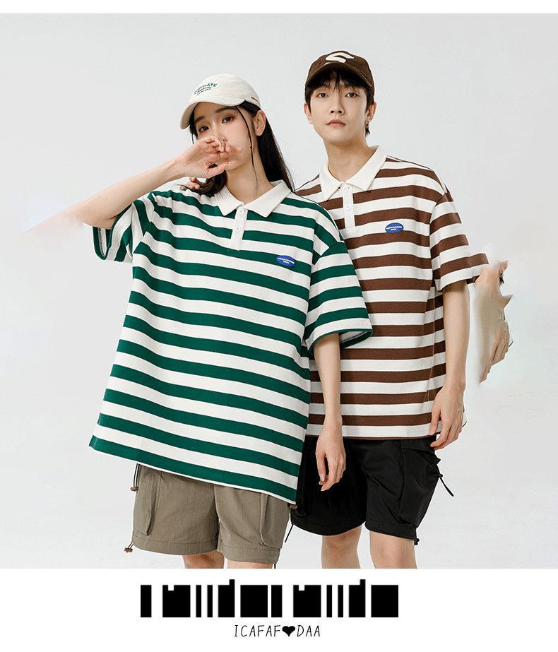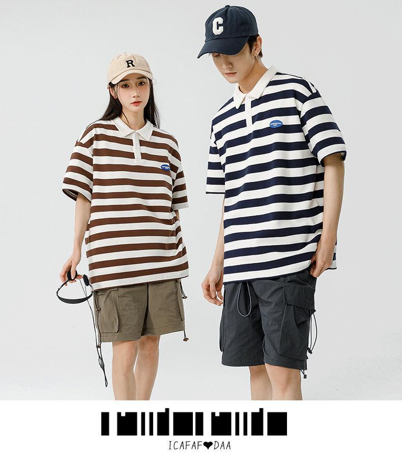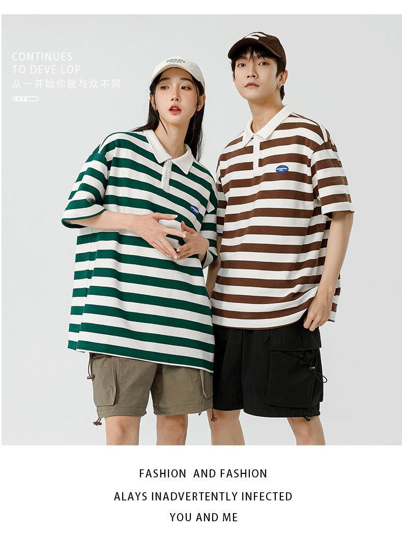 Polo camiseta de manga corta para hombres verano nuevo suelto camiseta de rayas pareja de moda de Hong Kong marca con solapa chaqueta media manga
