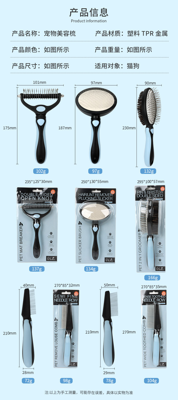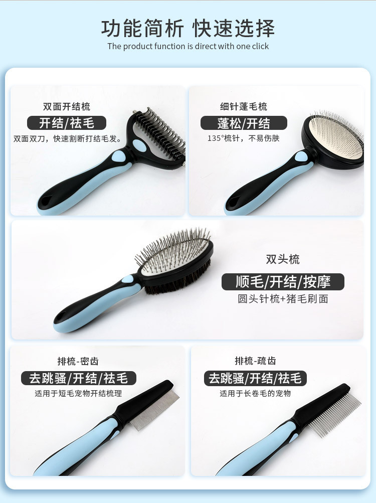 | Especificaciones | Peine de nudo abierto,Peine de aguja,Peine de dientes densos,Peine de dientes dispersos,Peine de doble cara,Cuchillo pequeño,Cuchillo de pelo grande |