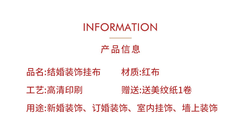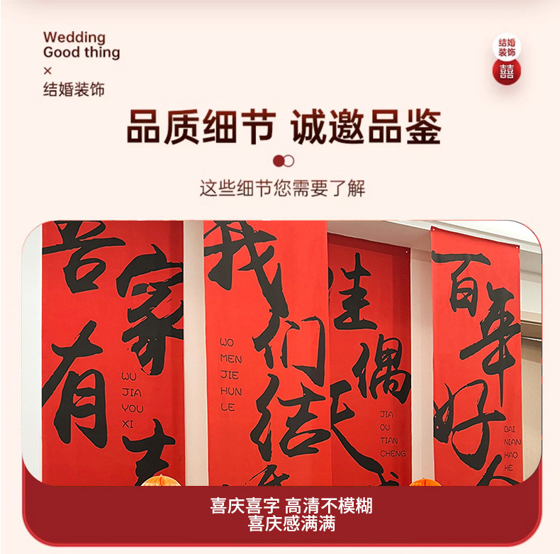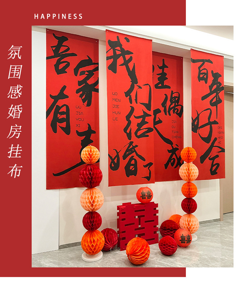 | Color | Cien años de pancartas 50 * 145 cm 4, pancartas de buena suerte 50 * 145 cm 4, tres comidas de pancartas de cuatro estaciones 50 * 145 cm 4, pancartas de apariencia de lang cainu 50 * 145 cm 4, pancartas de corazón eterno 50 * 145 cm 4, pancartas de amor 50 * 145 cm 4, pancartas de alegría de mi familia 66 * 265 cm 4, pancartas de boda 66 * 265 cm 4, pancartas de alegría de caligrafía 115 * 300cm 1, nos casamos 150 * 280 cm 1, dos juegos de tela colgante de buena suerte en cien años 300cm 2 |