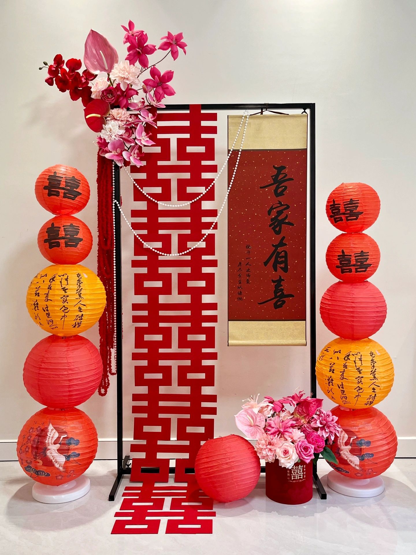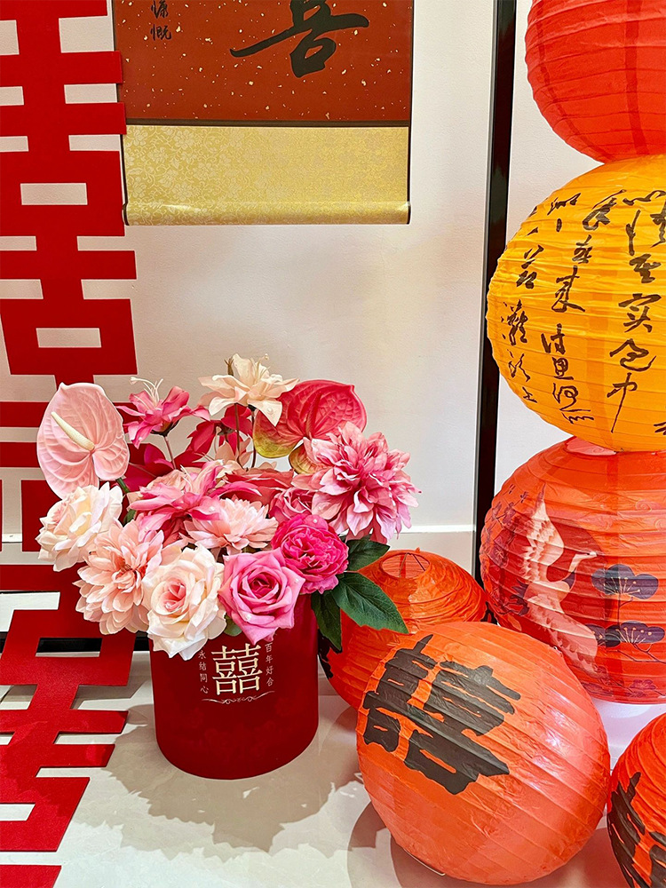 Racimo de flores chinas Mi familia tiene un pergamino feliz + columna de linterna