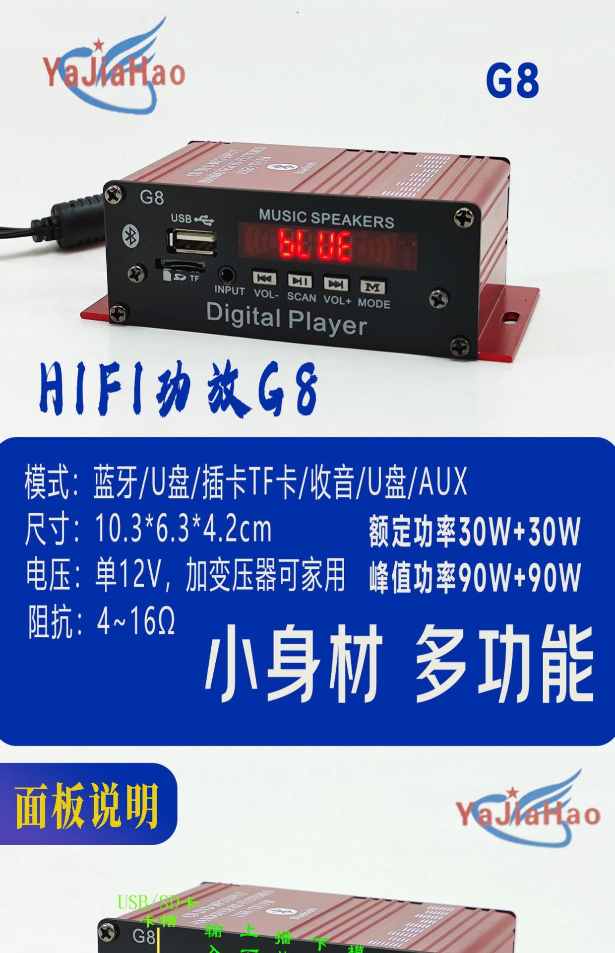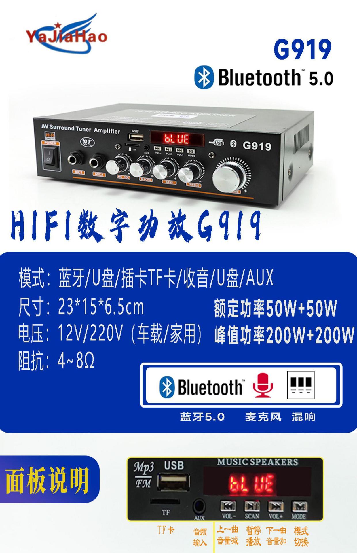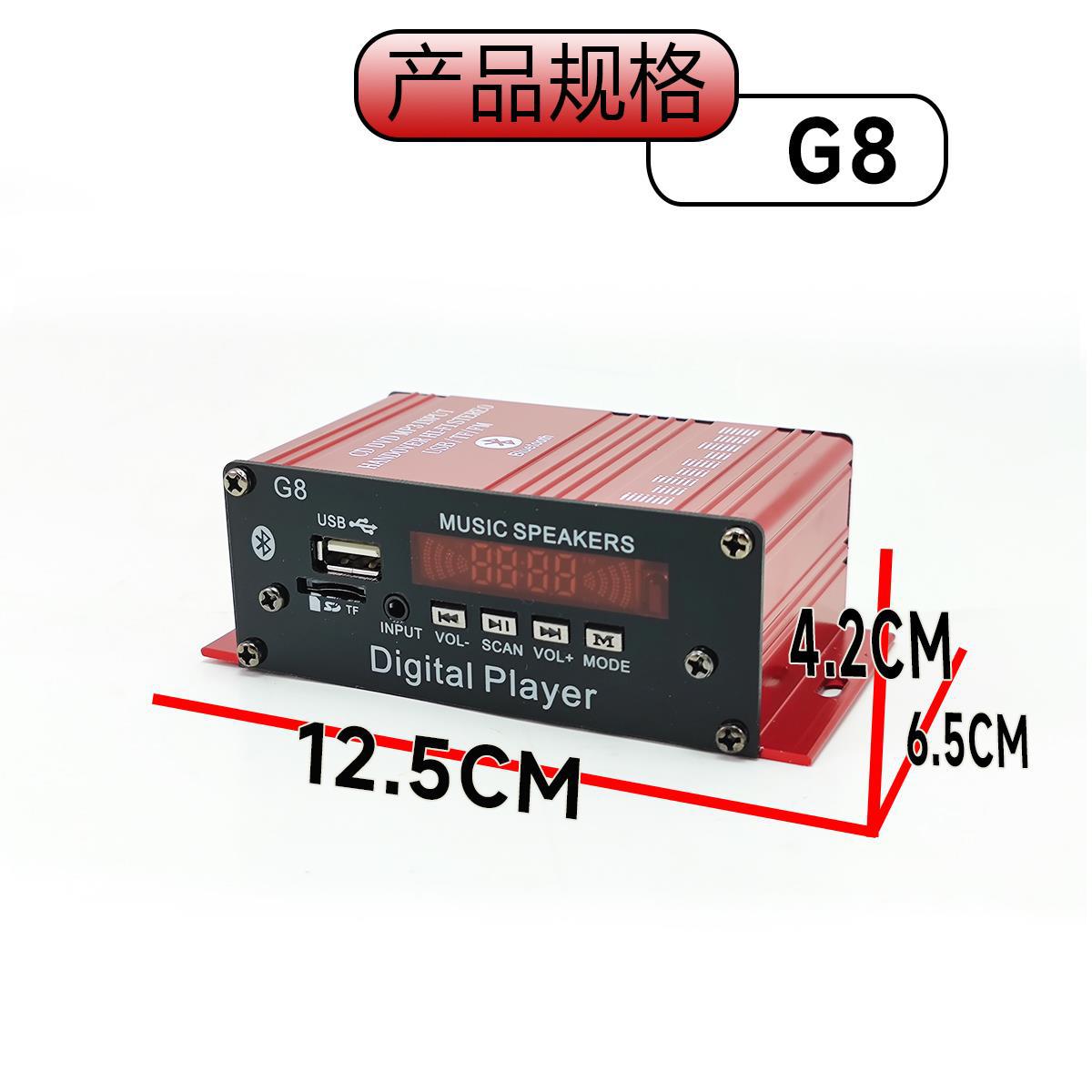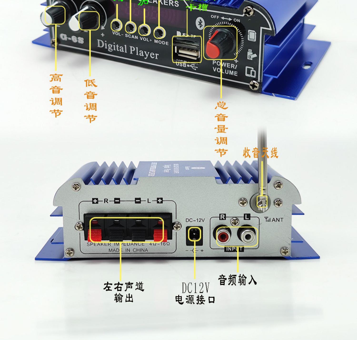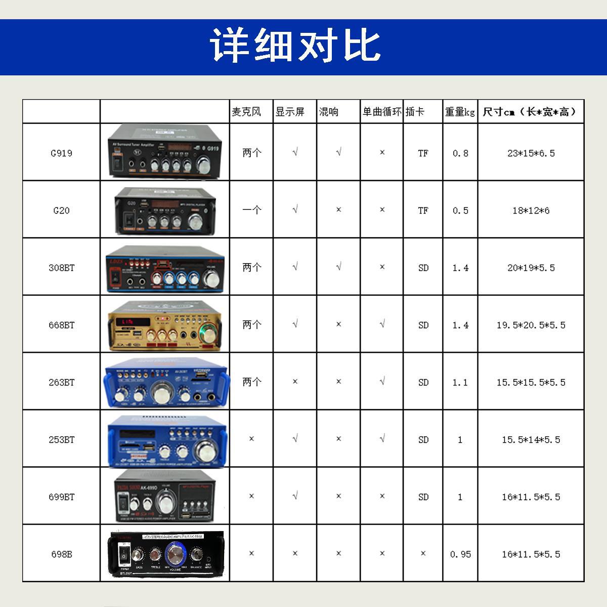 | Especificaciones del producto | Amplificador de potencia digital G919 independiente,Amplificador de potencia digital G20 independiente,253BT azul,253D único 12V azul,699BT independiente,698B-MP3 entrada de audio negro sin tarjeta,G6S independiente con control remoto,G8 independiente con control remoto,A6 individual 12V sin Bluetooth,El cableado debe comprarse por separado (cable de audio/cable de CC) |