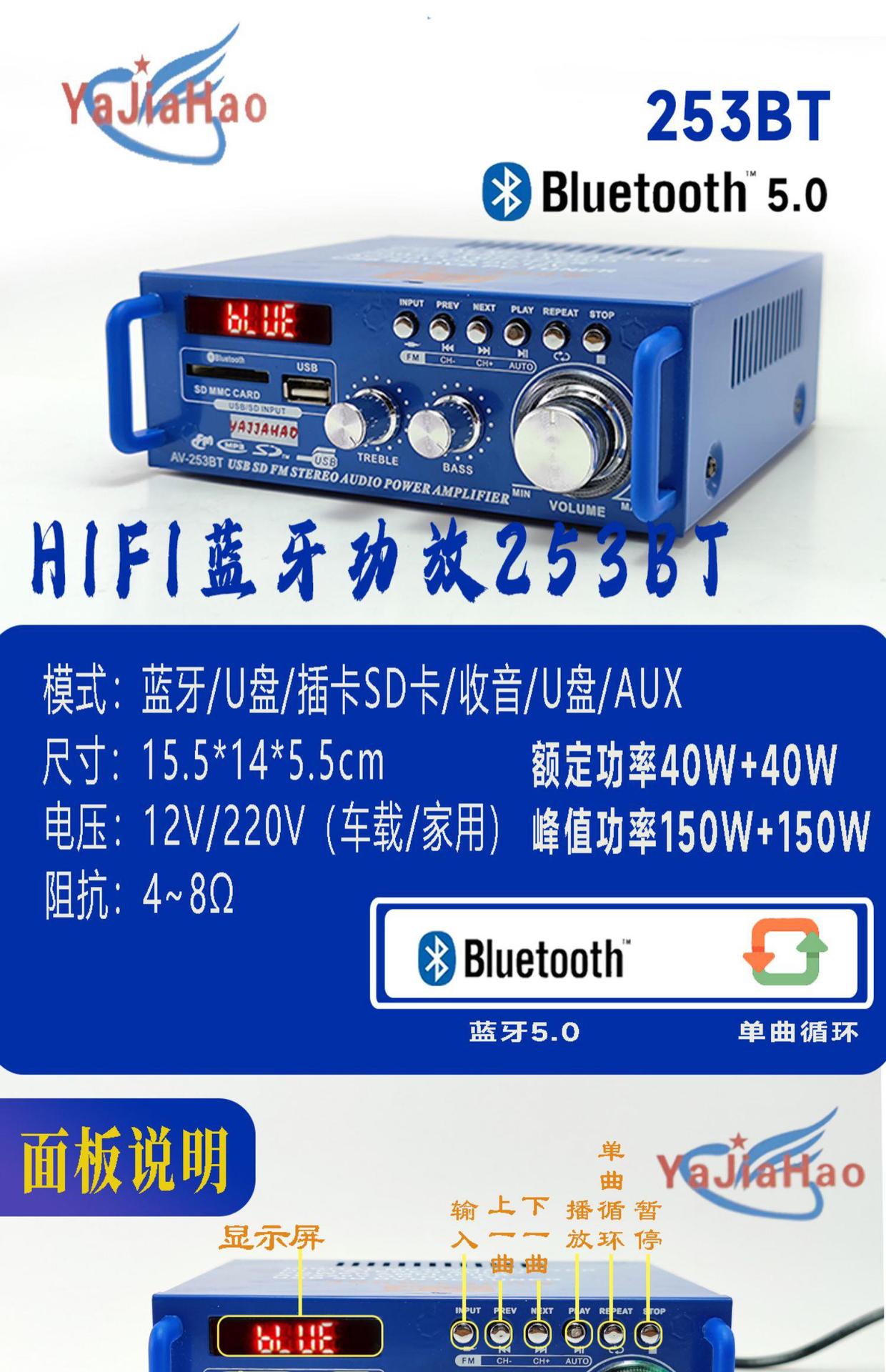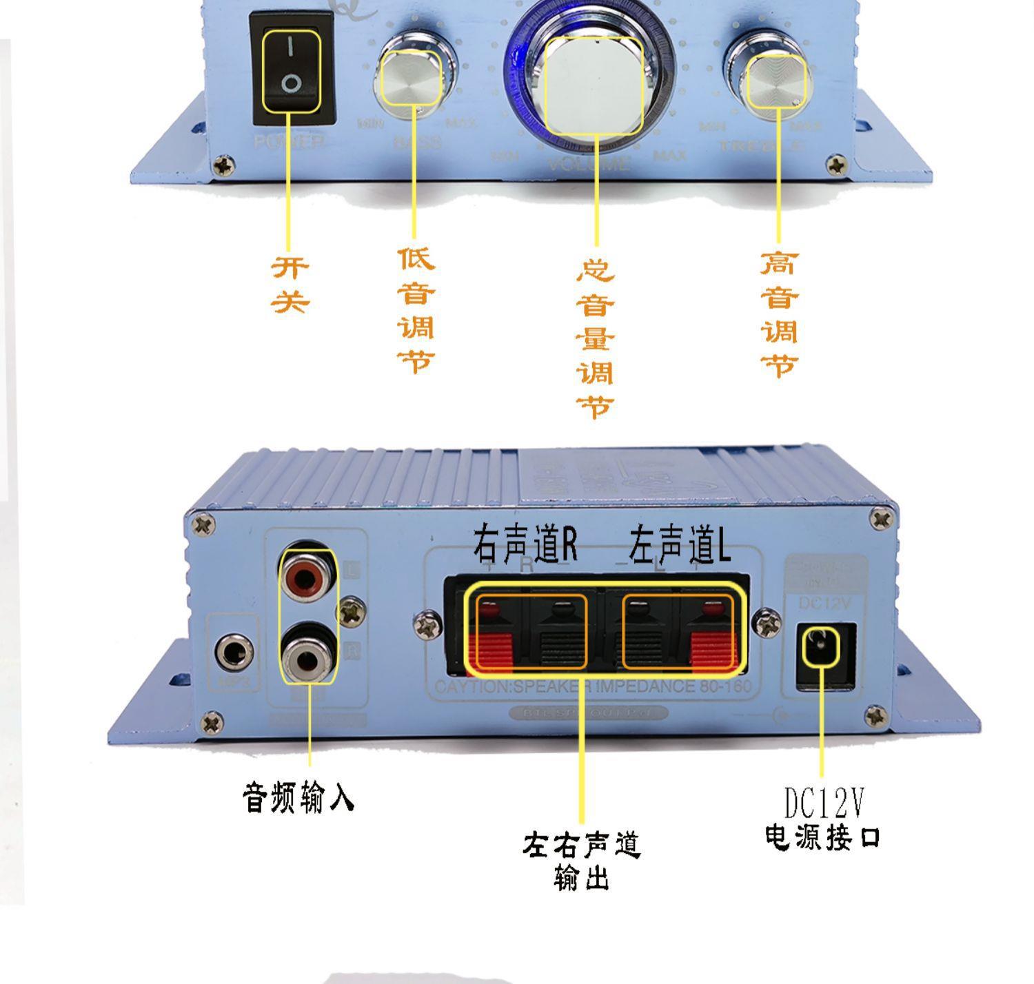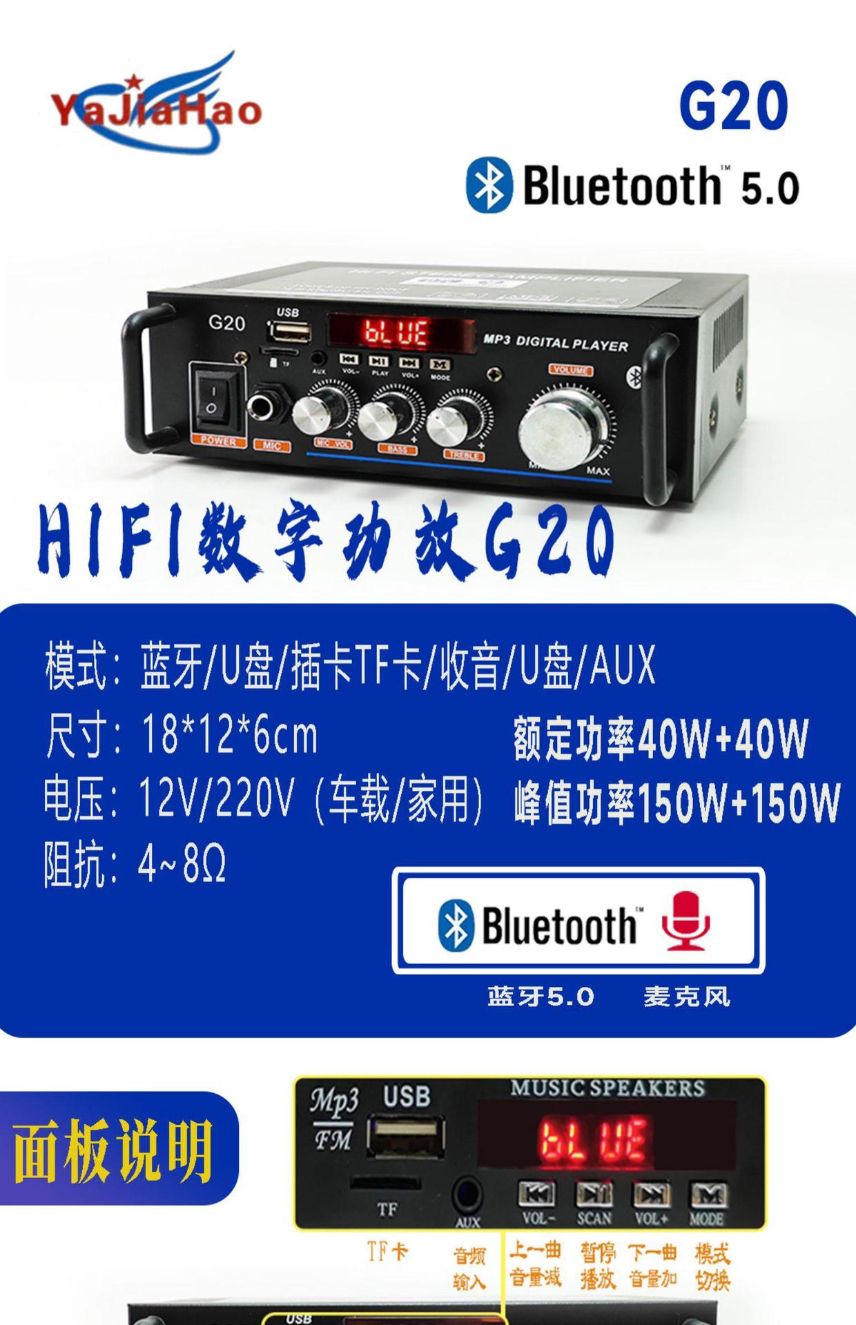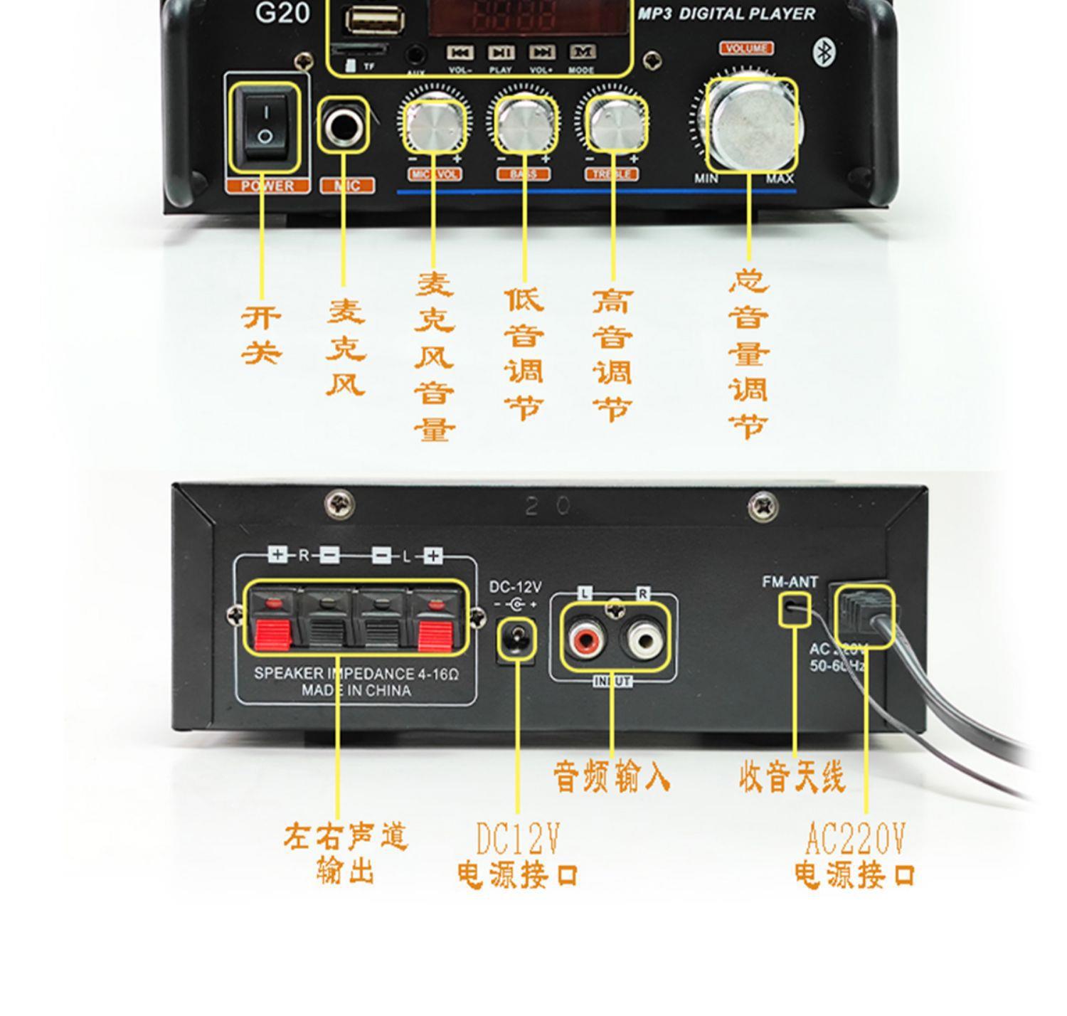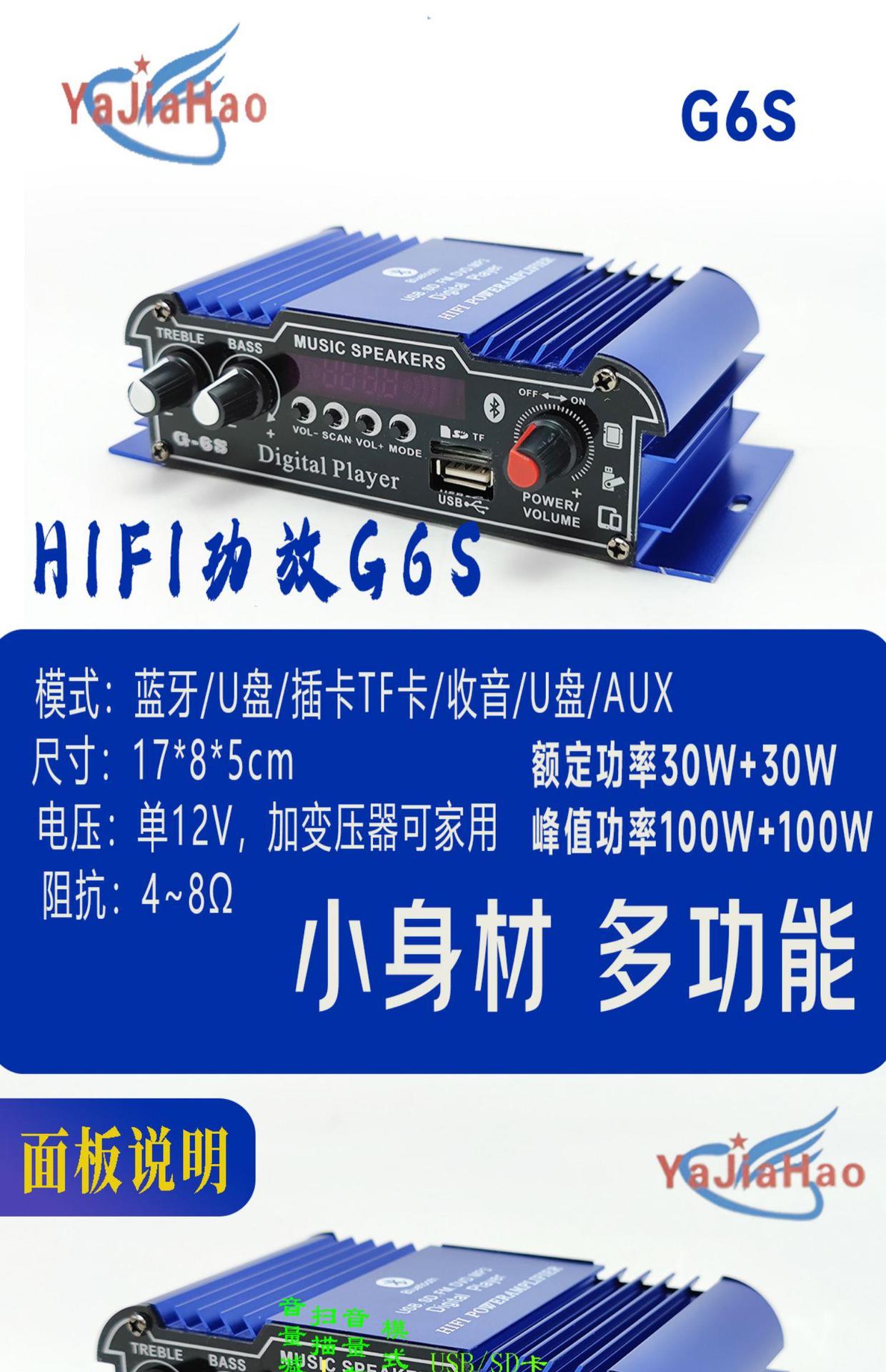 | Especificaciones del producto | Amplificador de potencia digital G919 independiente,Amplificador de potencia digital G20 independiente,253BT azul,253D único 12V azul,699BT independiente,698B-MP3 entrada de audio negro sin tarjeta,G6S independiente con control remoto,G8 independiente con control remoto,A6 individual 12V sin Bluetooth,El cableado debe comprarse por separado (cable de audio/cable de CC) |
