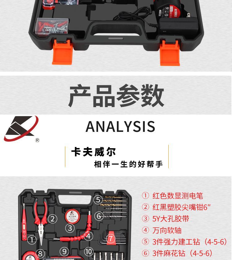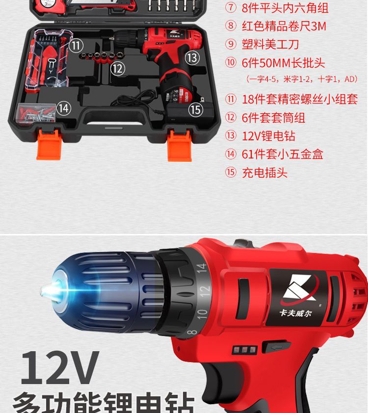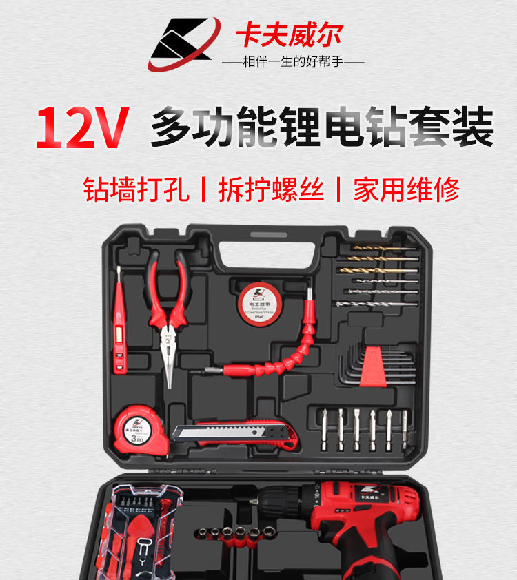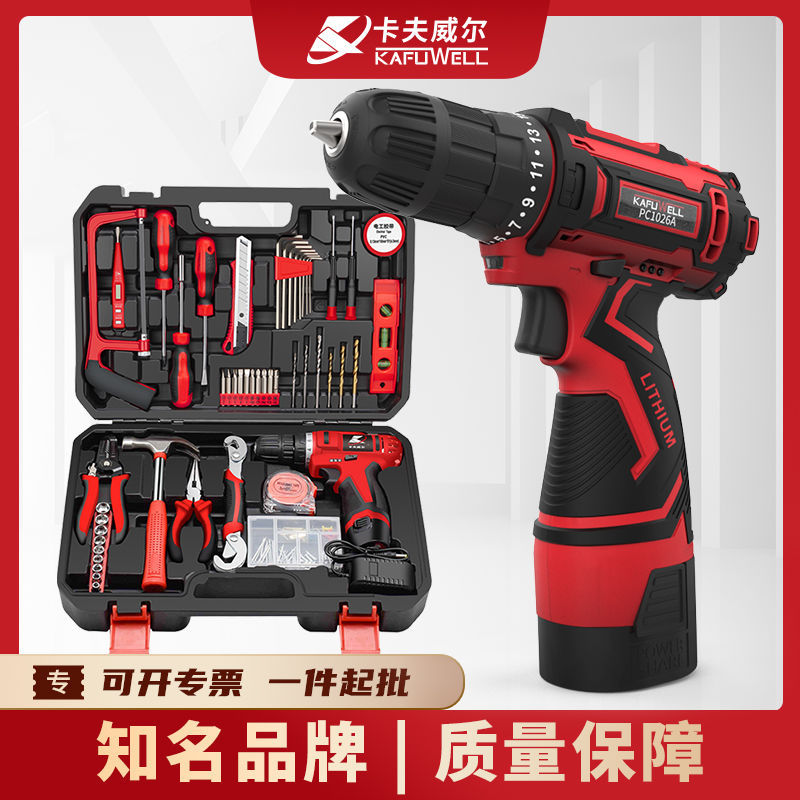 Taladro manual de 12V Kafwell, caja de herramientas para el hogar de batería de litio, un juego completo de destornilladores eléctricos de impacto para mujer
