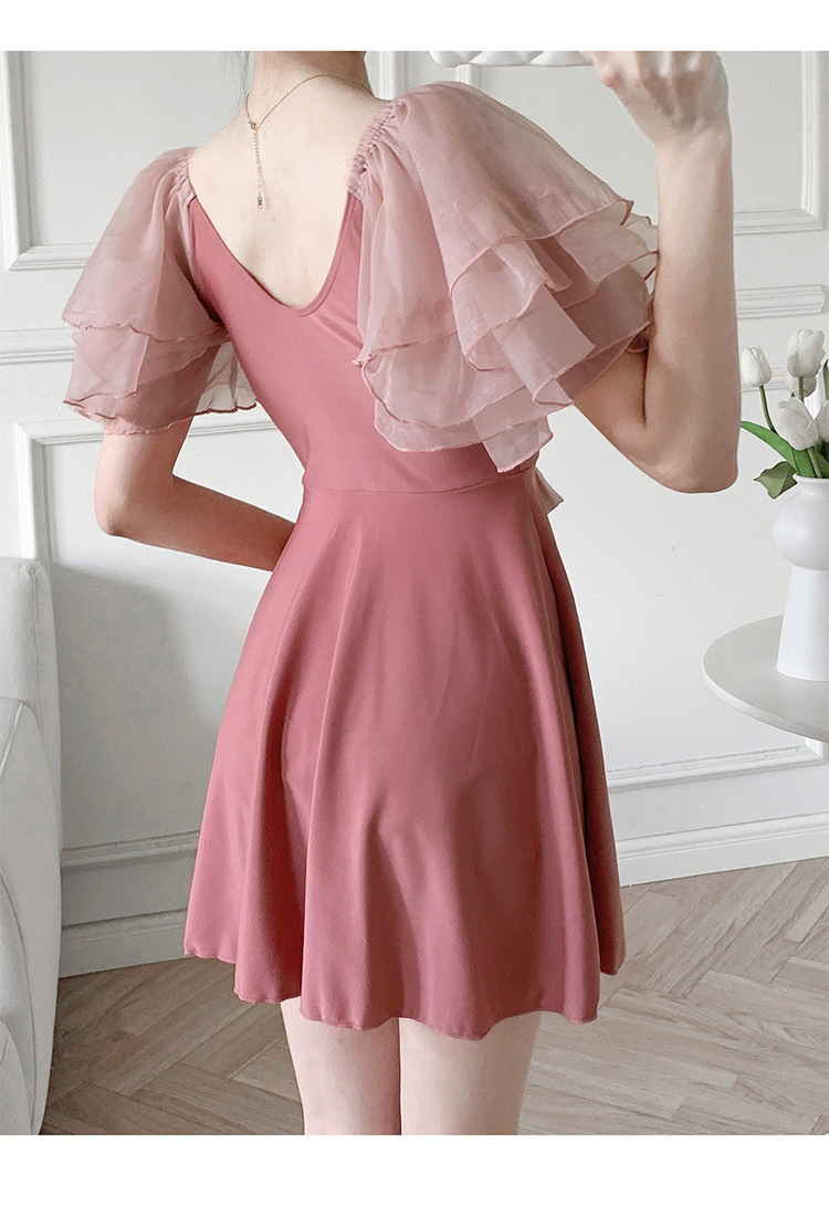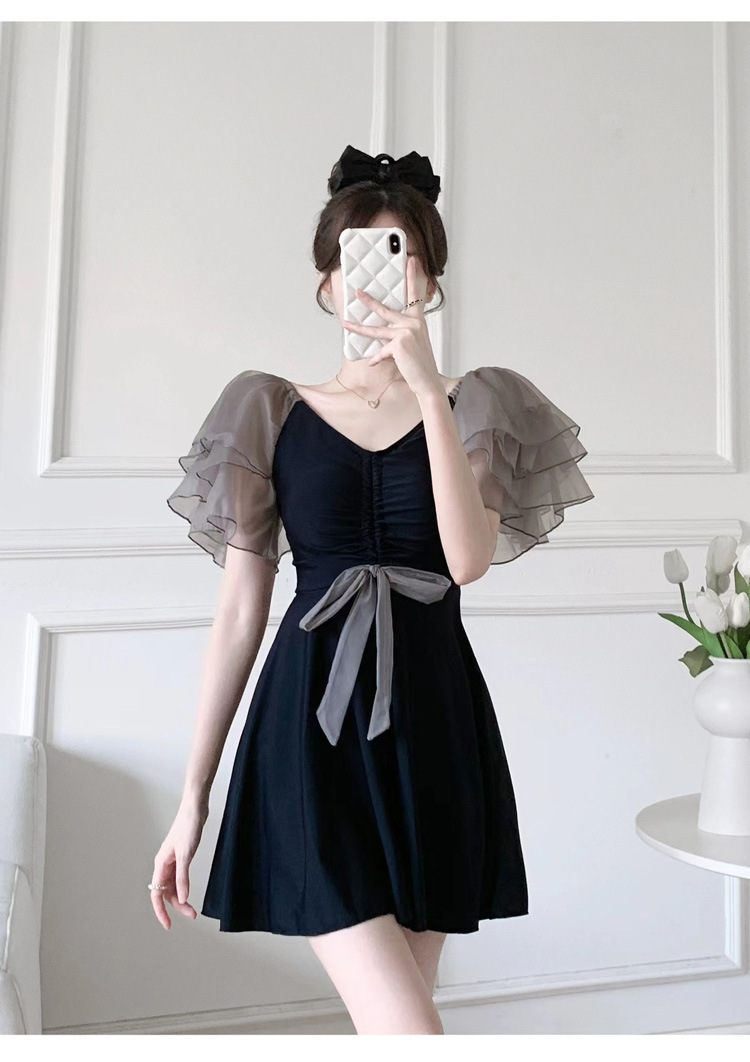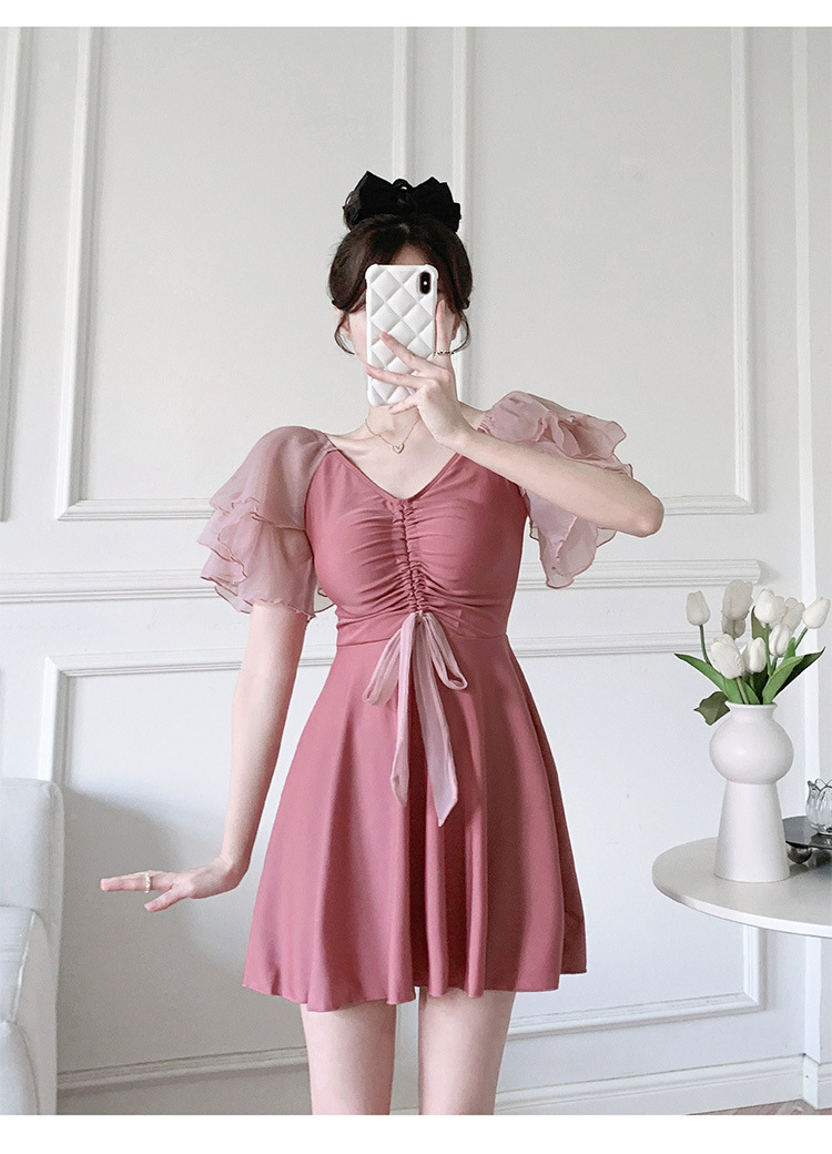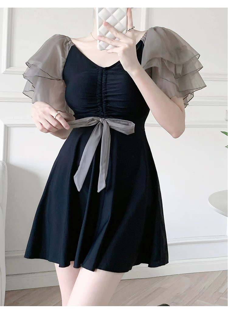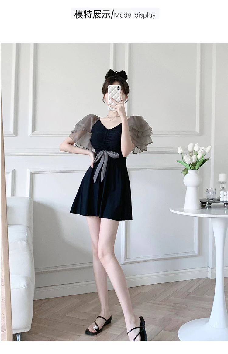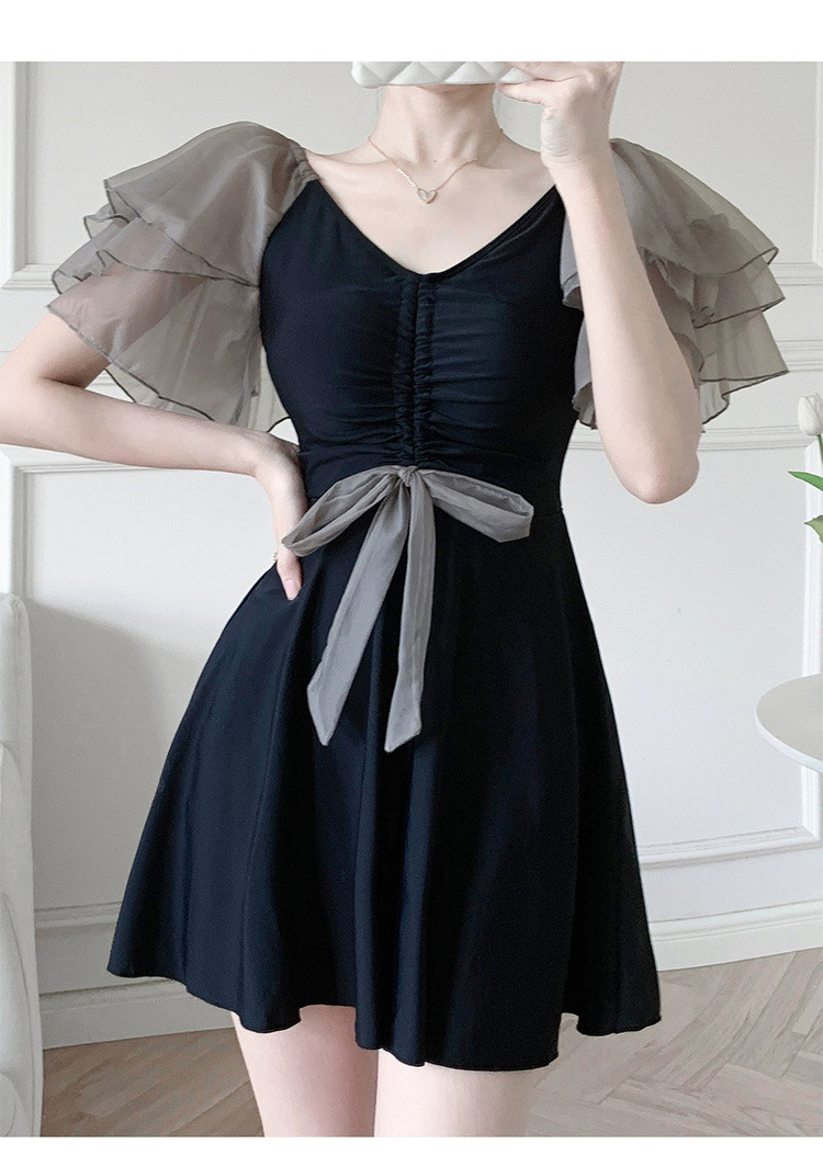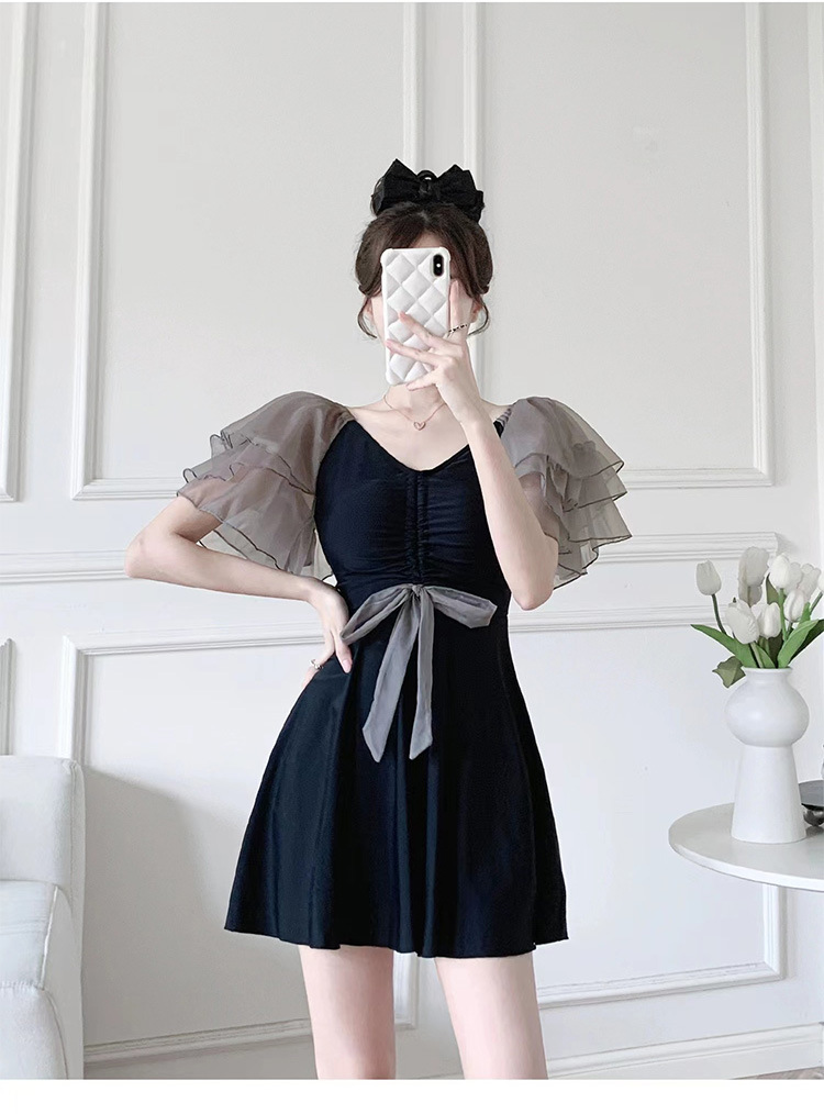 Dispositivo especial de despeje de baño unidireccional conservador para cubrir la piel delgada pecho pequeño reúnido manga de hoja de loto alta sensación de baño falso para mujeres