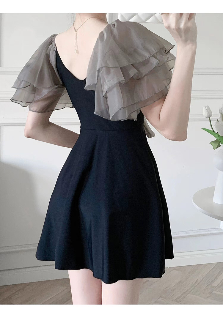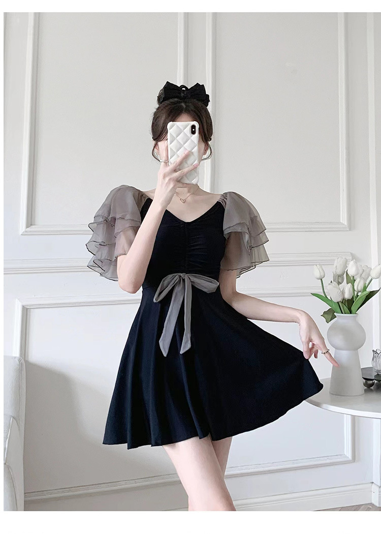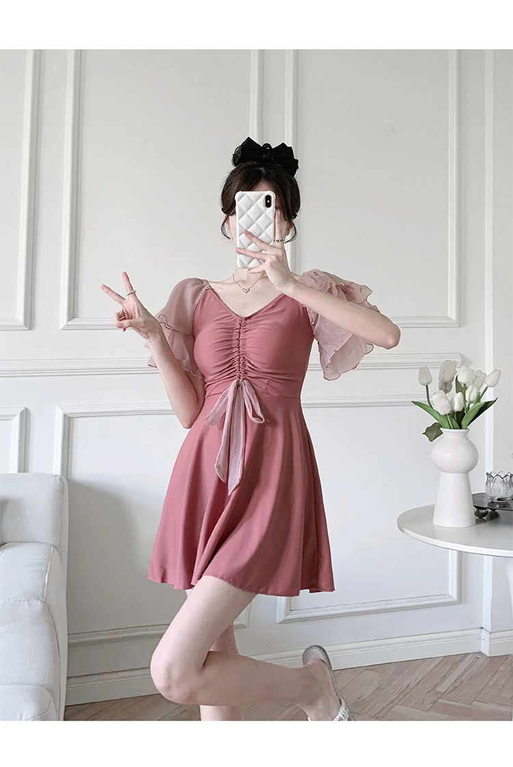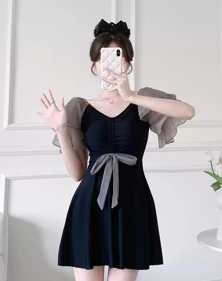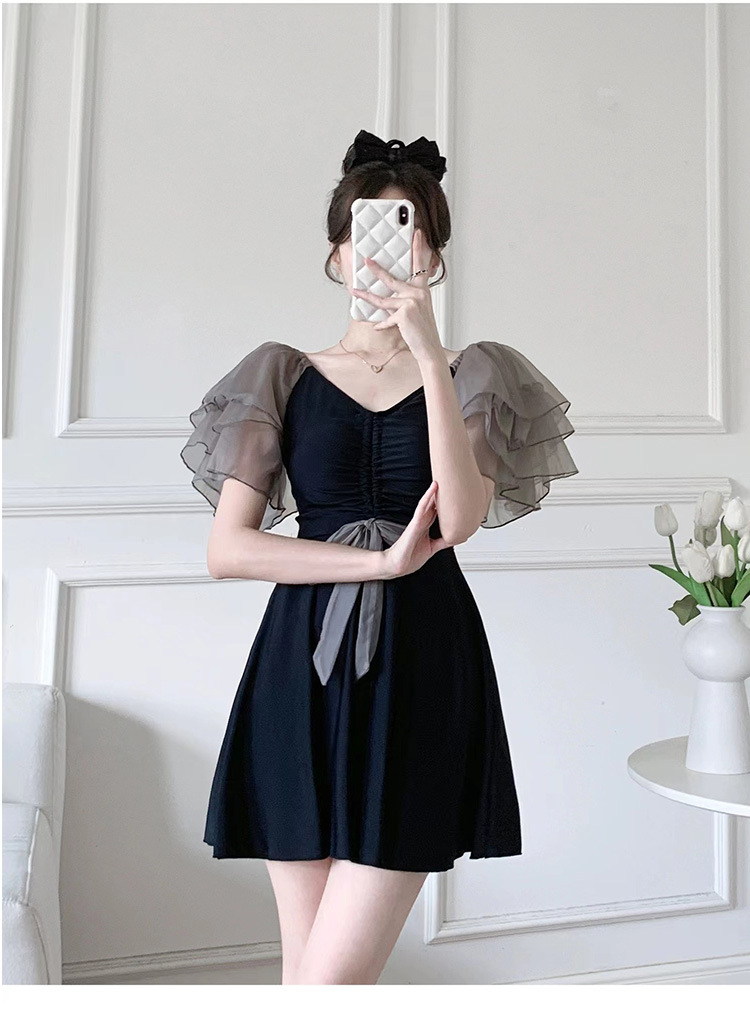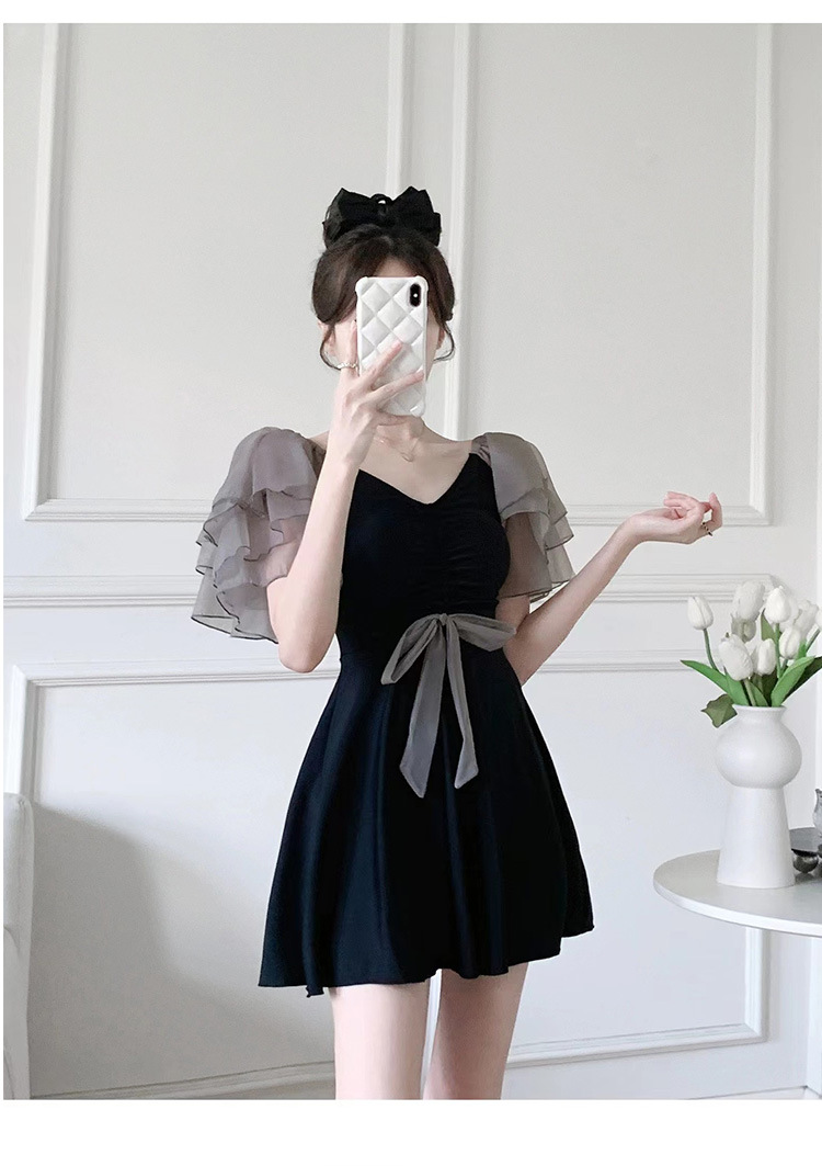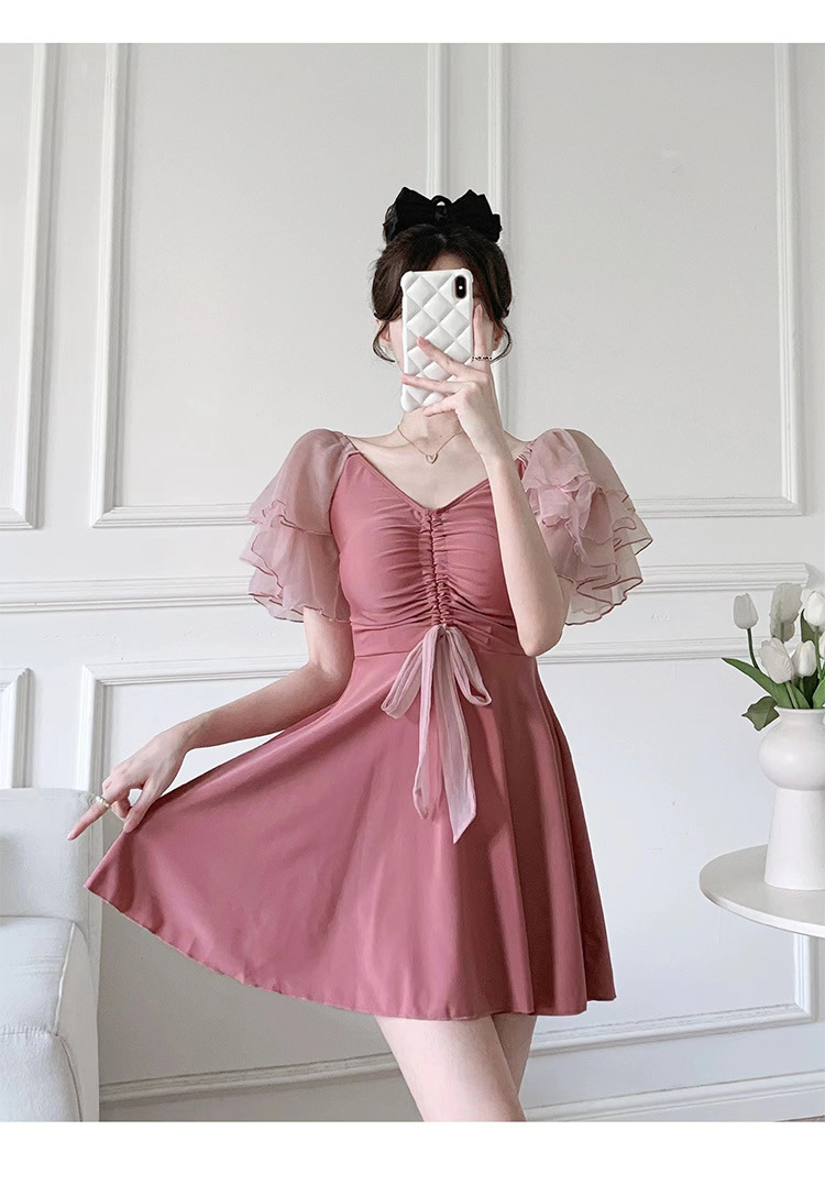 Dispositivo especial de despeje de baño unidireccional conservador para cubrir la piel delgada pecho pequeño reúnido manga de hoja de loto alta sensación de baño falso para mujeres