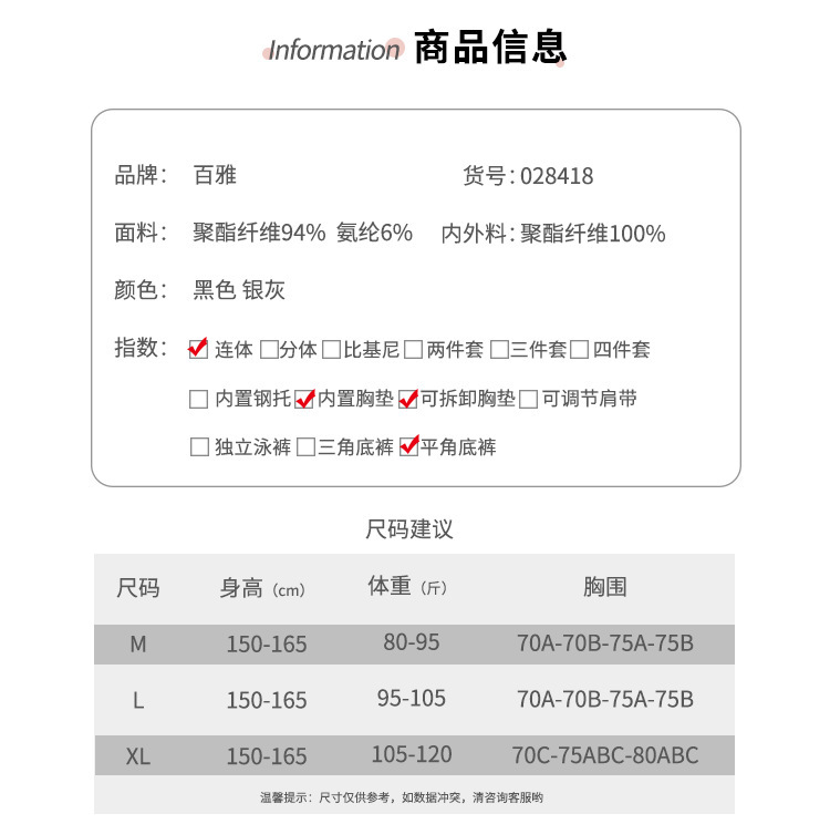 | Color | Juegos de dos piezas de gris plateado, negro, gris plateado [bañador + gorro de baño], juegos de dos piezas de gris plateado [bañador + bolsa de teléfono móvil], juegos de dos piezas de negro [bañador + gorro de baño], juegos de tres piezas de negro [bañador + gorro de baño + gafas de baño], juegos de tres piezas de gris plateado [bañador + gorro de baño + gafas de baño] |