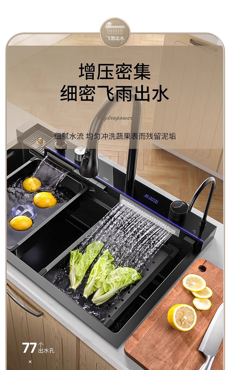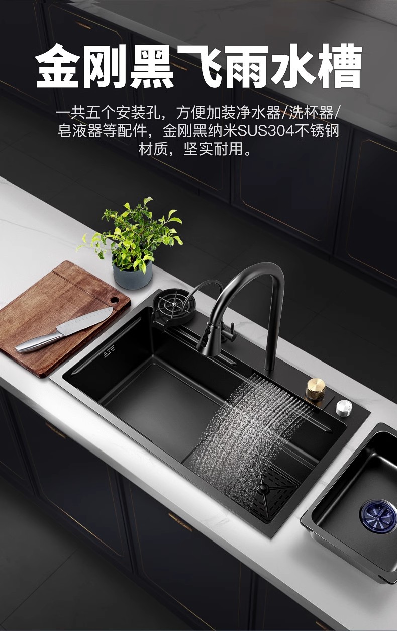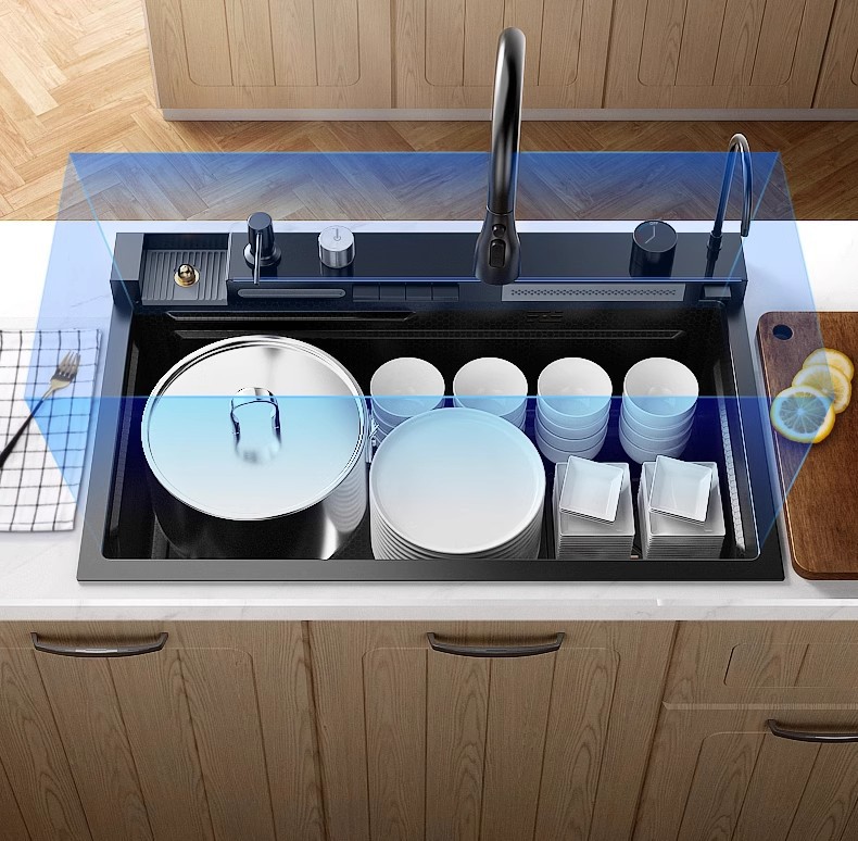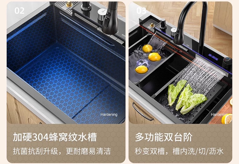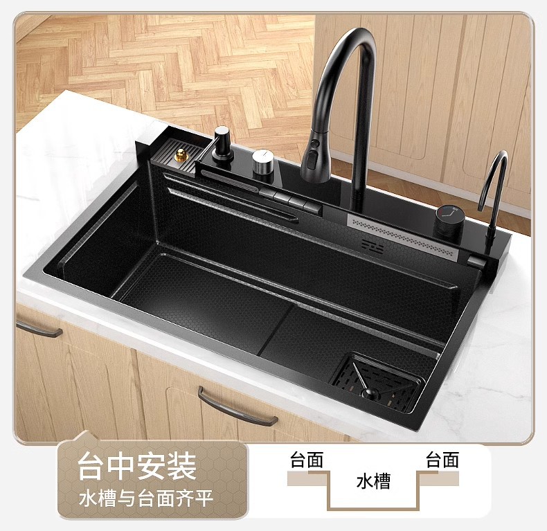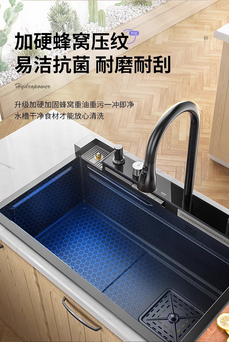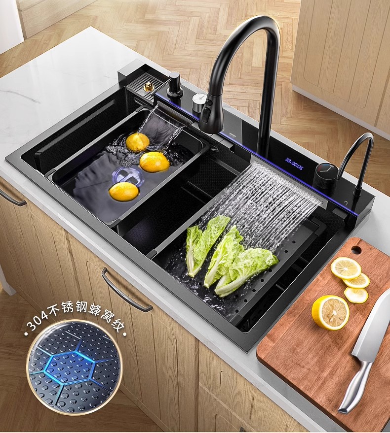 Fregadero de cascada de lluvia de acero inoxidable 304 fregadero de cocina multifuncional pantalla digital para el hogar nido de abeja en relieve gran ranura única