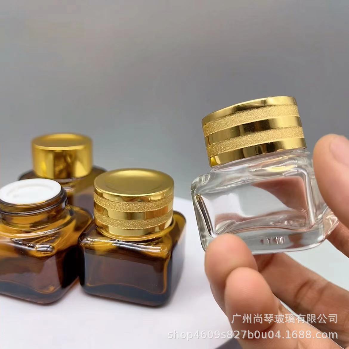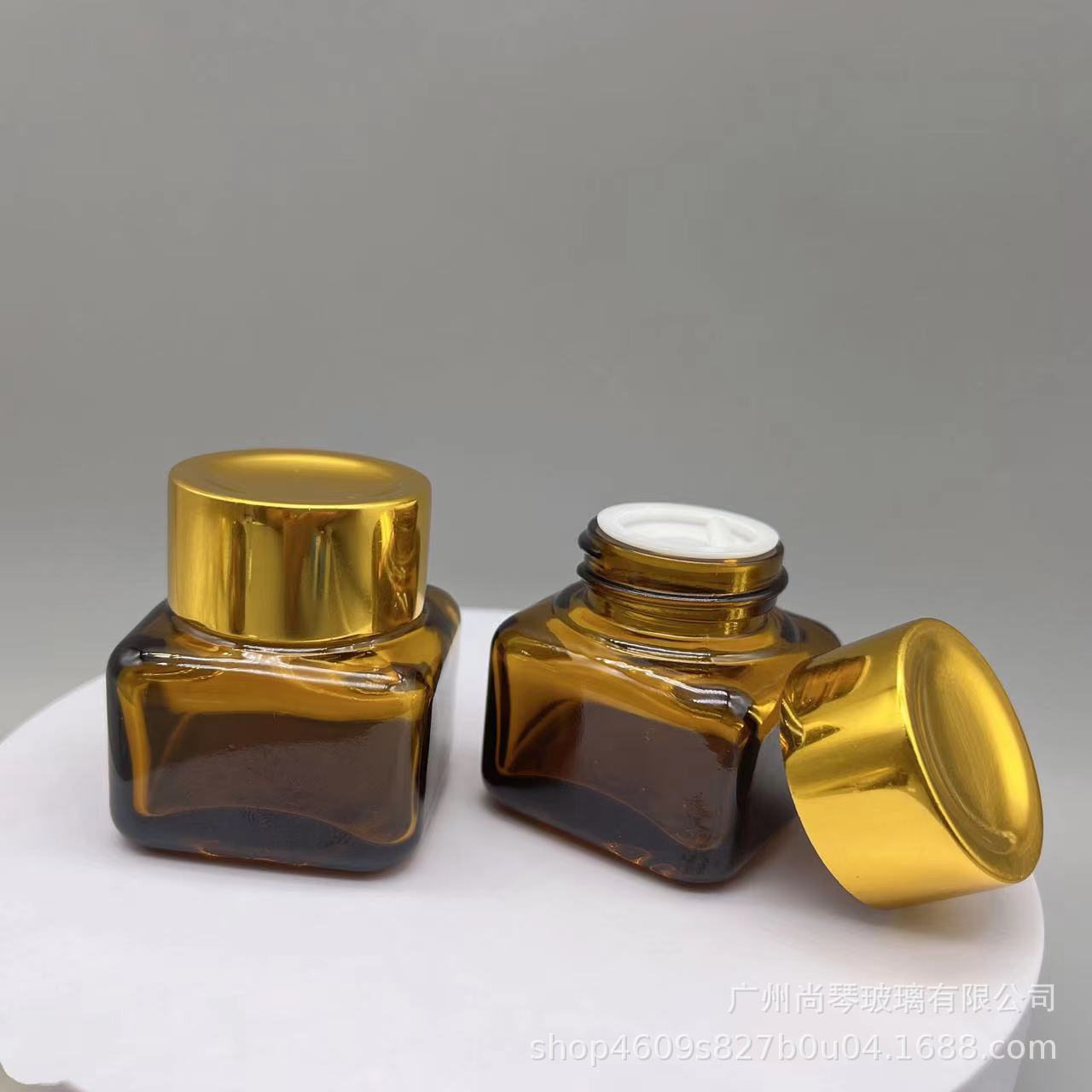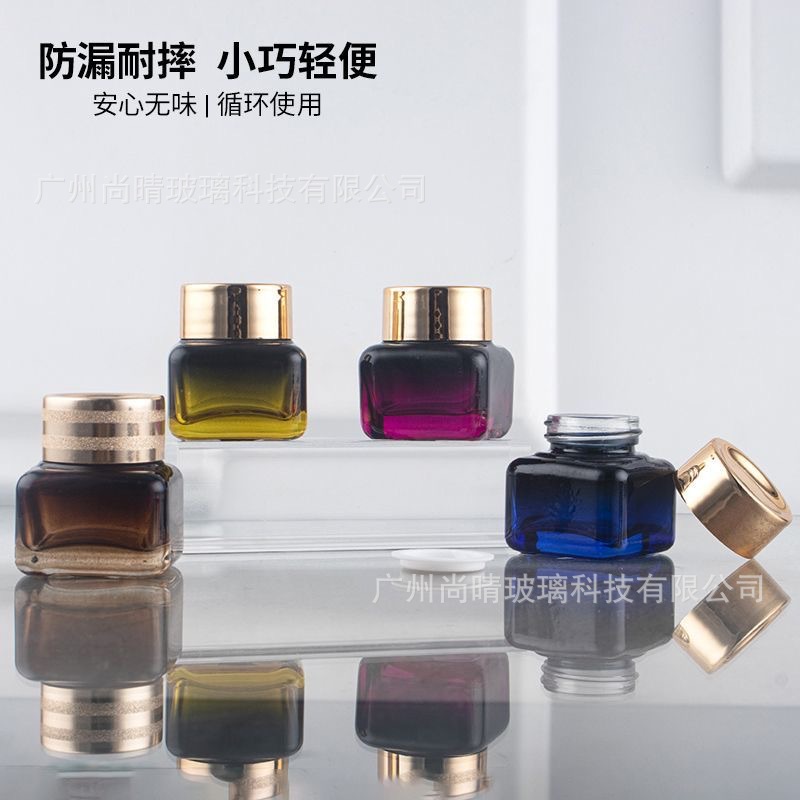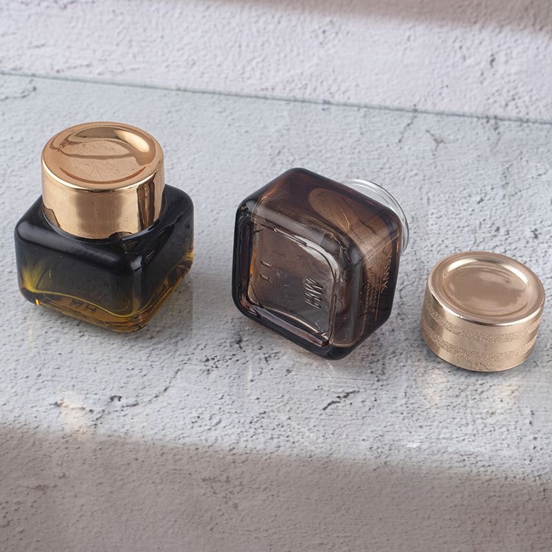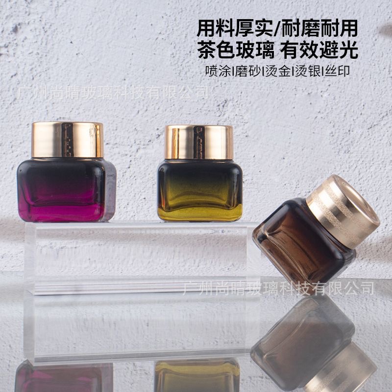 En stock suministro 15g Yashi mismo estilo marrón/transparente cuadrado ojo crema botella de vidrio de fondo grueso botella de vidrio cosméticos sub-embalaje