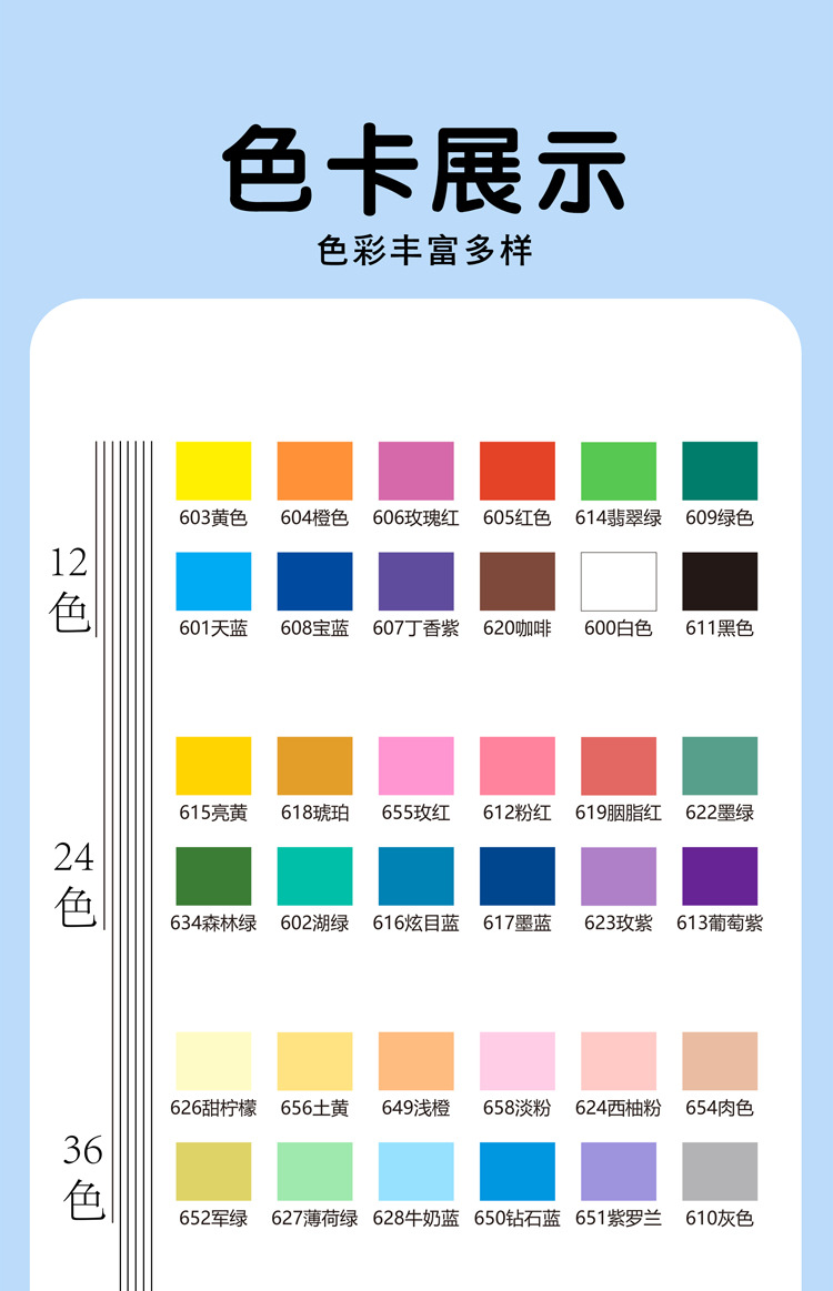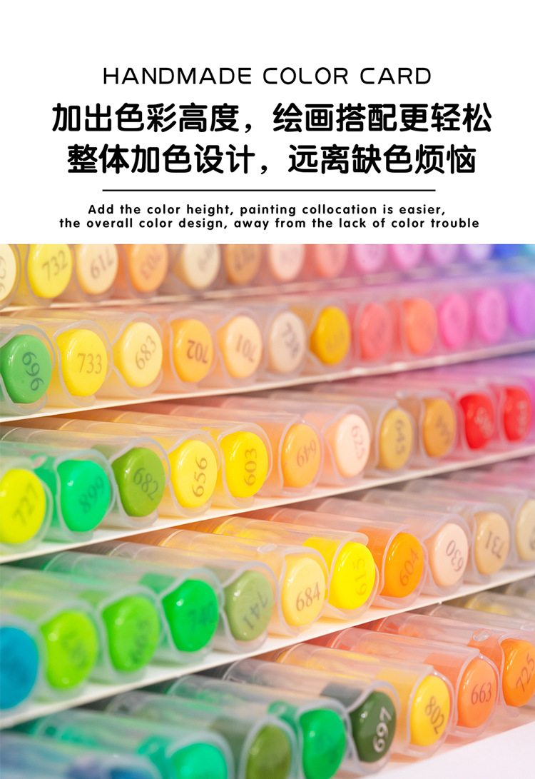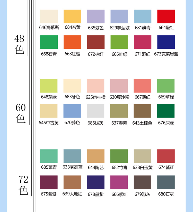 | Especificaciones | 12 colores,24 colores,36 colores,48 colores,60 colores,72 colores,120 colores,168 colores,200 colores,240 colores,Bolsa de tela de 240 colores.,288 colores,Bolsa de tela de 288 colores.,48B color,Negro,Blanco,601-Azul cielo,603-Amarillo,604-Naranja,625-Canela Naranja,626-Limón dulce,628-Leche Azul,635-Púrpura,648-brote verde,650-Azul Diamante,655-rosa roja,664-rojo,665-hoja verde |