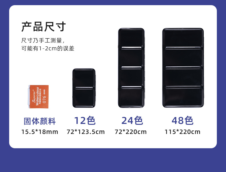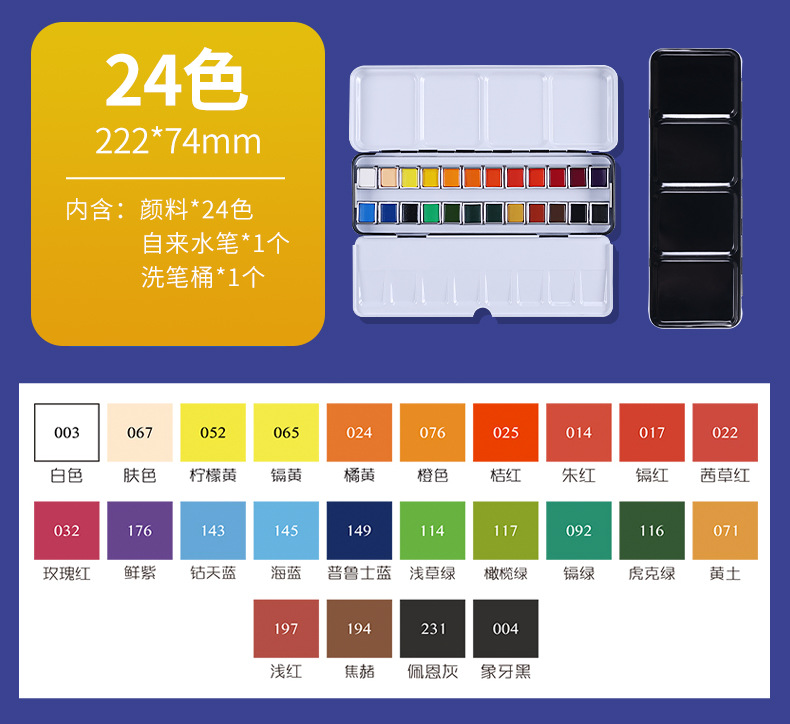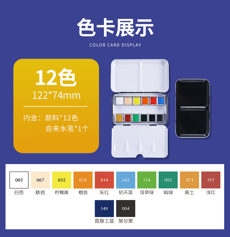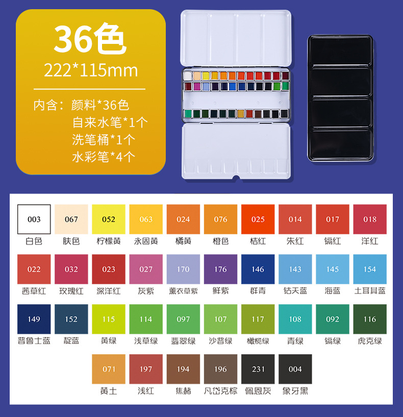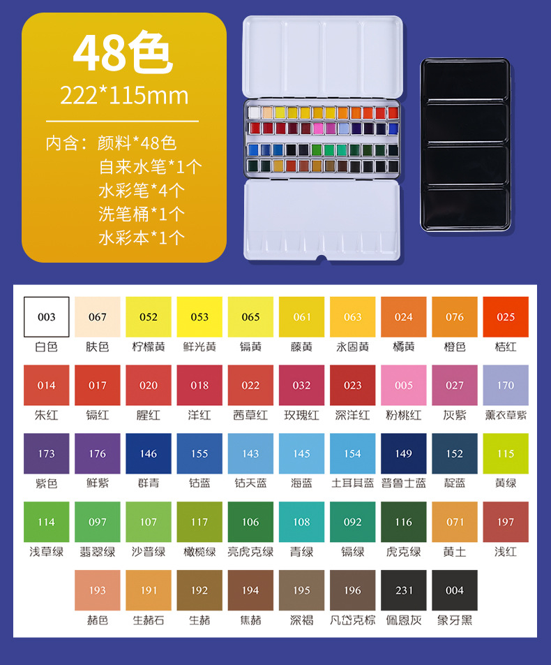 | Color | Caja Hierro Acuarela Sólida-12 Colores,Caja de hierro sólido Acuarela-24 colores,Caja de hierro sólido Acuarela-36 colores,Caja de hierro sólido Acuarela-48 colores |