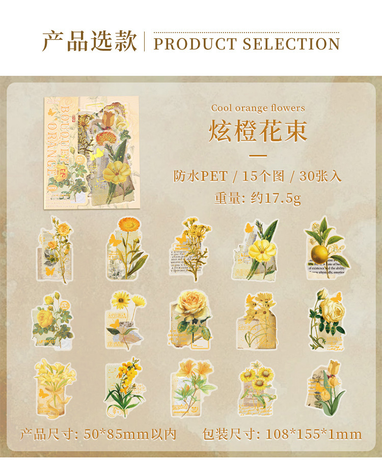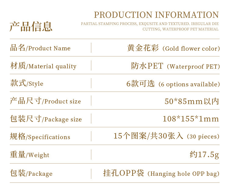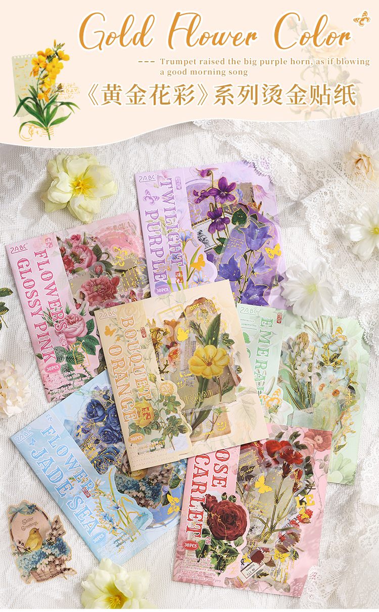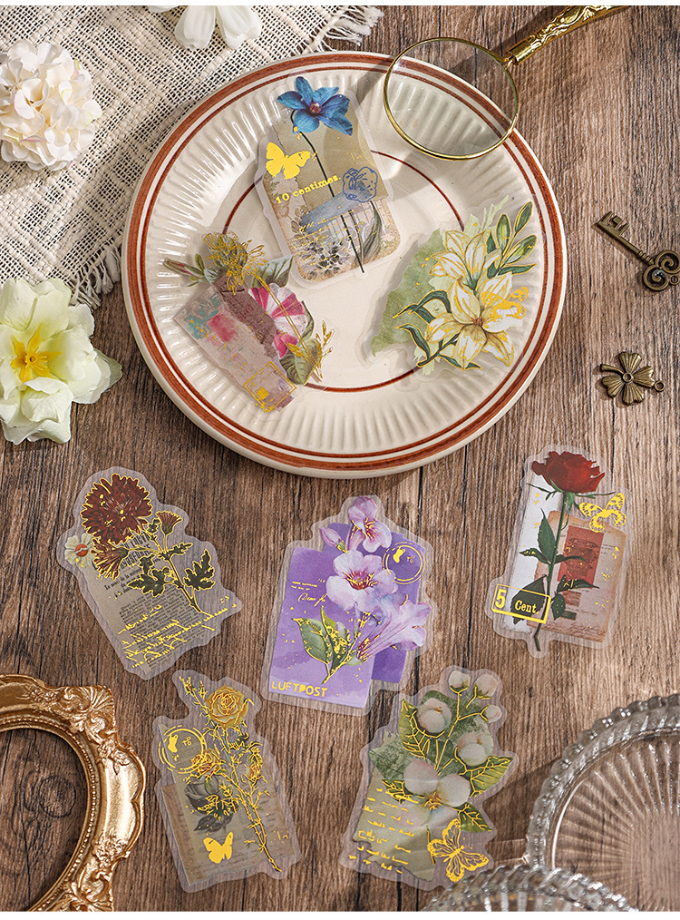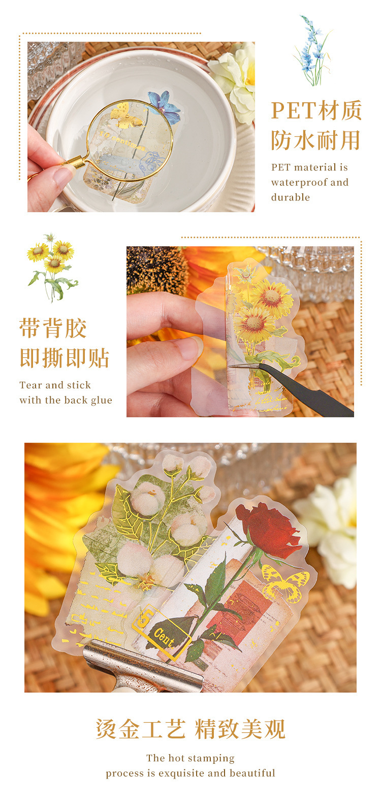 Flor dorada transparente pegatinas impermeables DIY pegatinas de diario pegatinas de flores de plantas estampadas retro transfronterizas