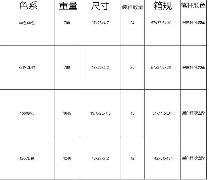 | Color | Embalaje de CD 60 colores, embalaje de CD 72 colores, embalaje de CD 100 colores, embalaje de CD 120 colores |
