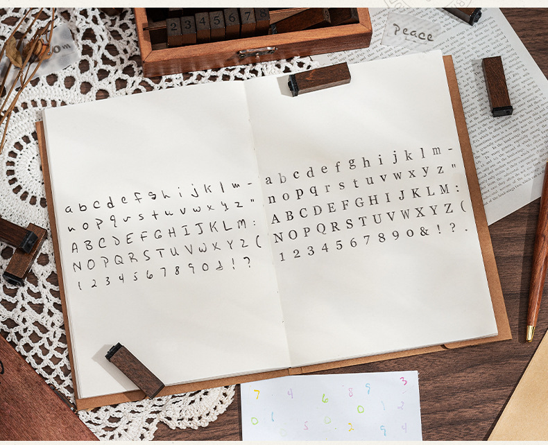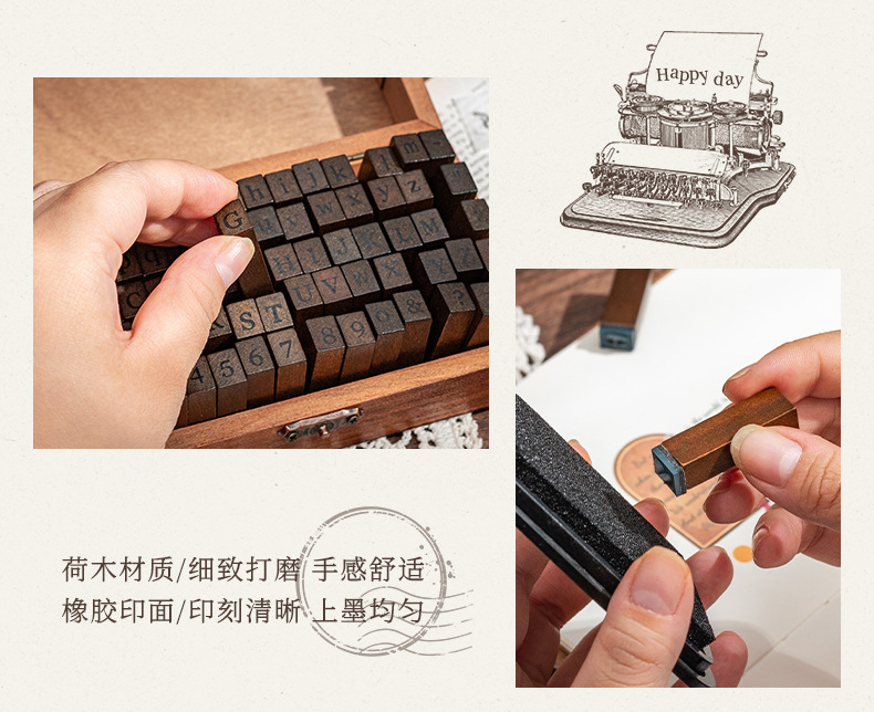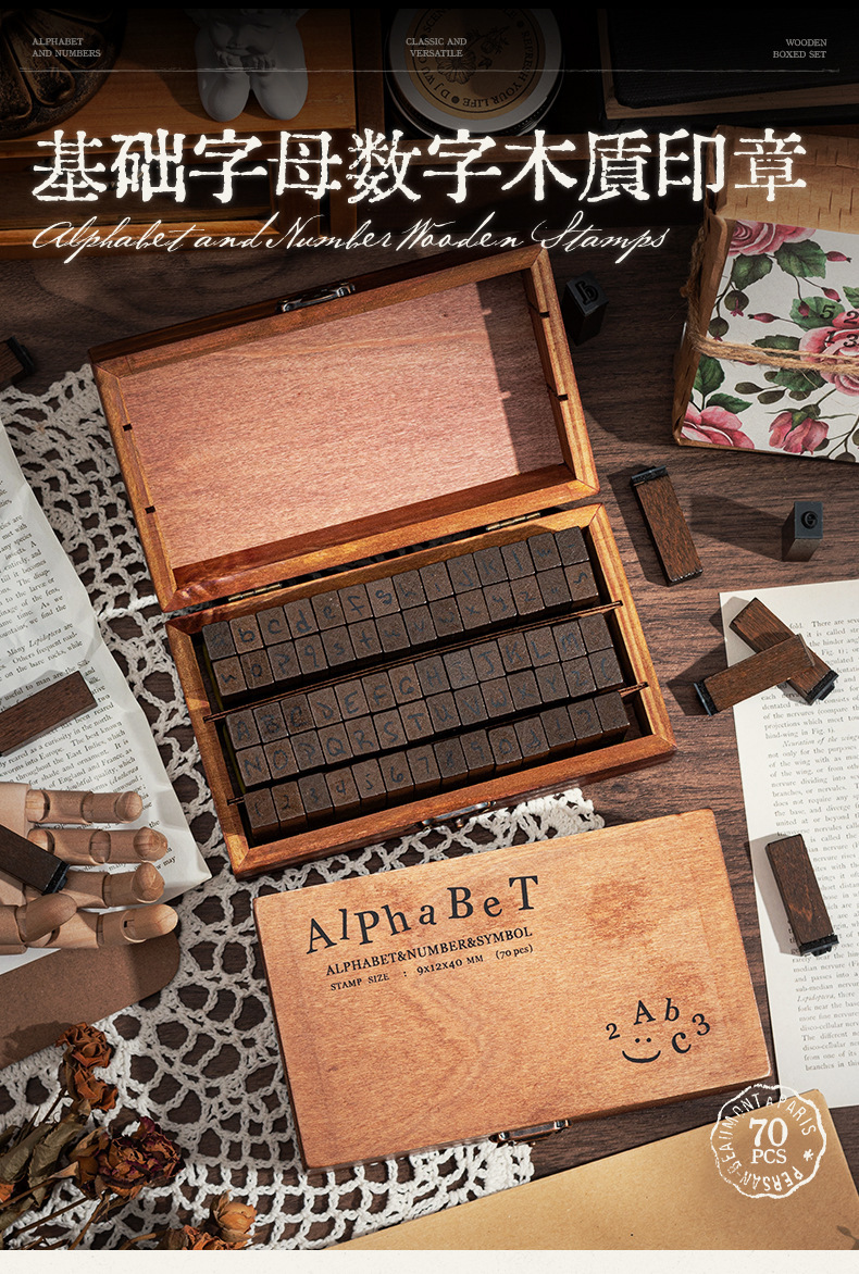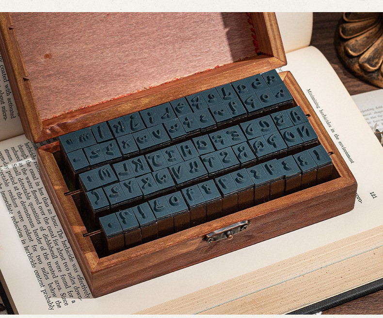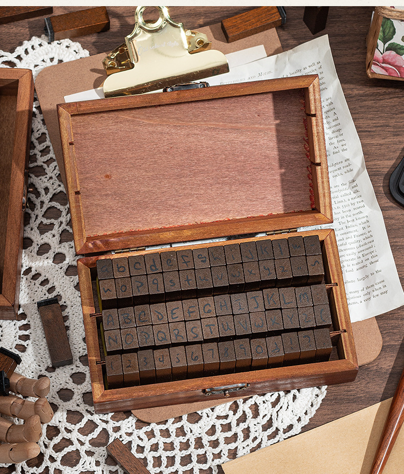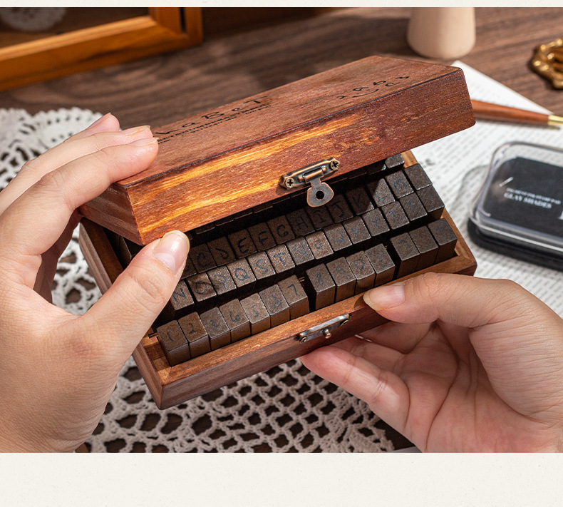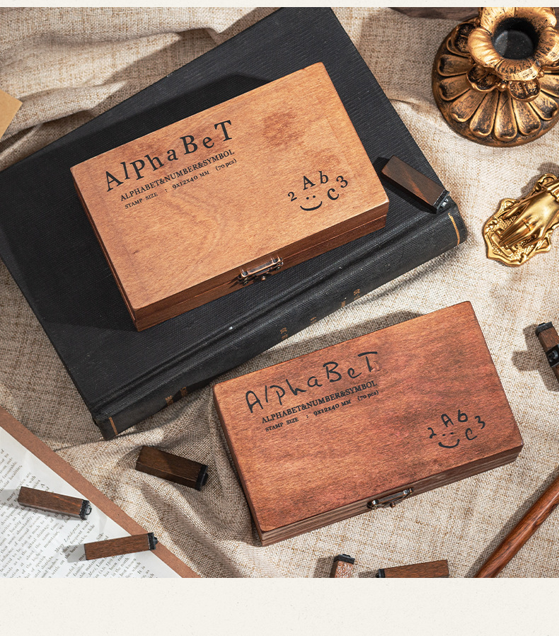 70 retro alfanuméricos caja de madera sello caja caja de letras mayúsculas y minúsculas cuerpo de hierba verdadero sello de libro de mano transfronterizo