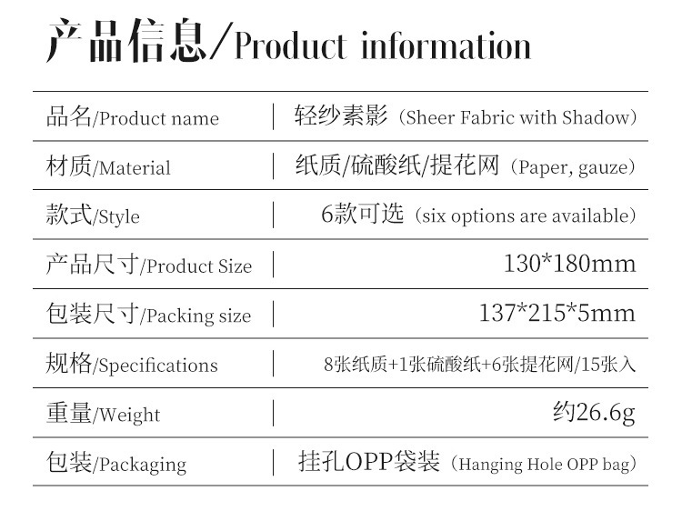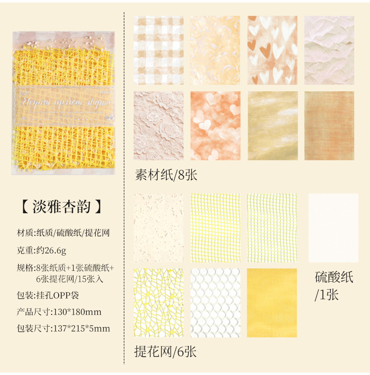 | Color | 1 hilo ligero de pétalos, 2 marcas de cinabrio, 3 impresiones azules suaves, 4 hilo ligero del bosque, 5 encanto de albaricoque elegante, 6 hilo púrpura de ensueño |