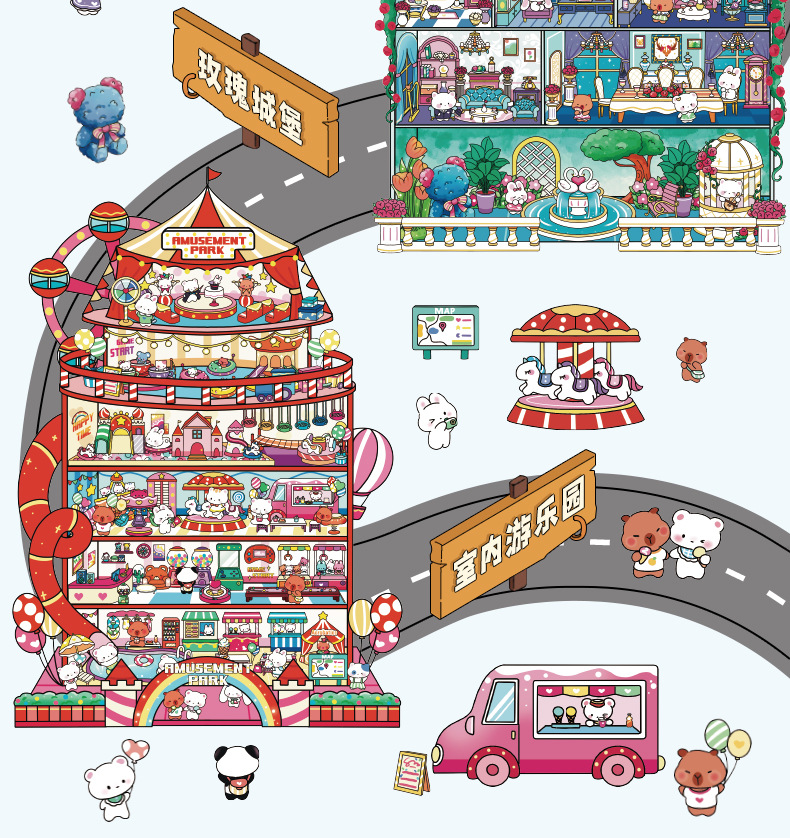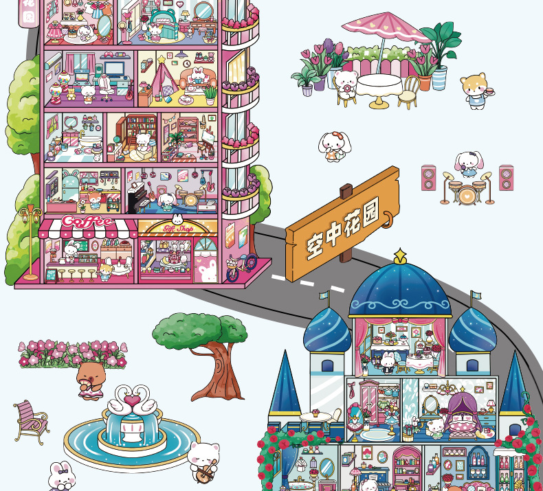 | Colores | 1 villa frente a la playa,2 Jardín del cielo,3 Castillo de las Rosas,4 Parque de atracciones interior |