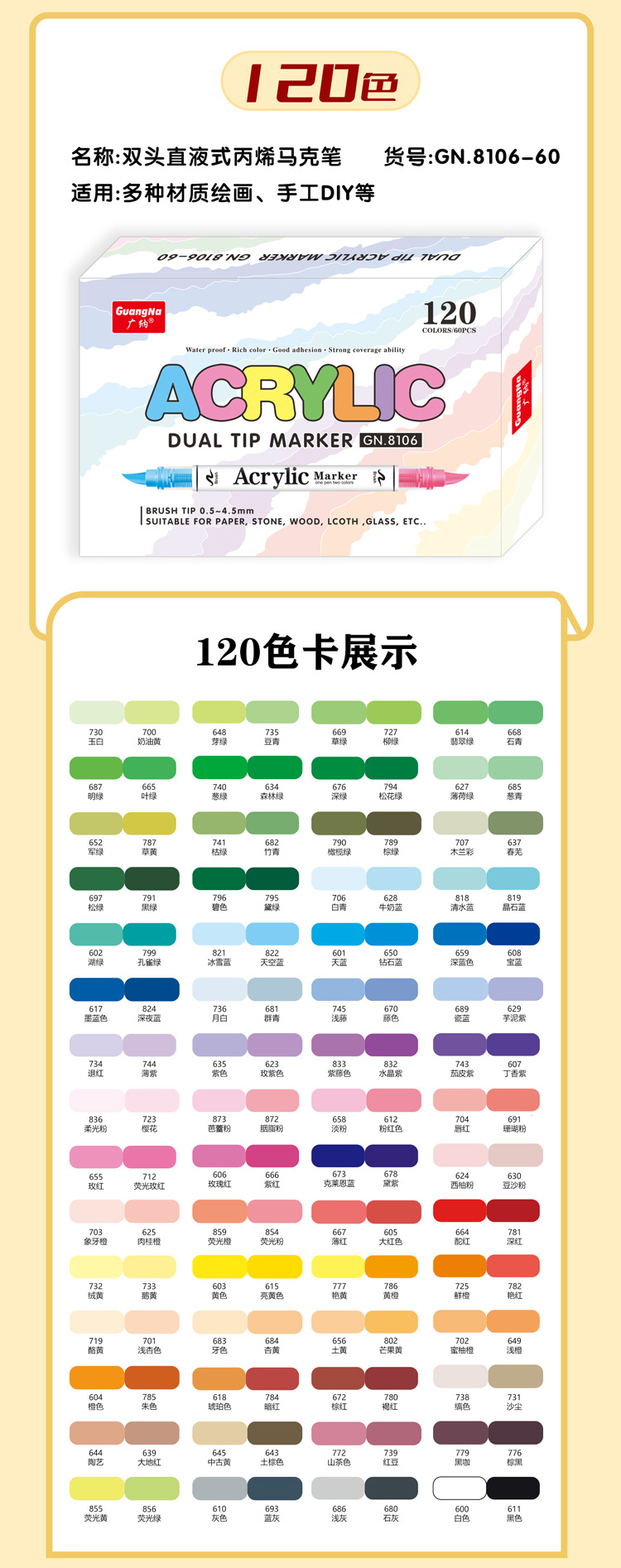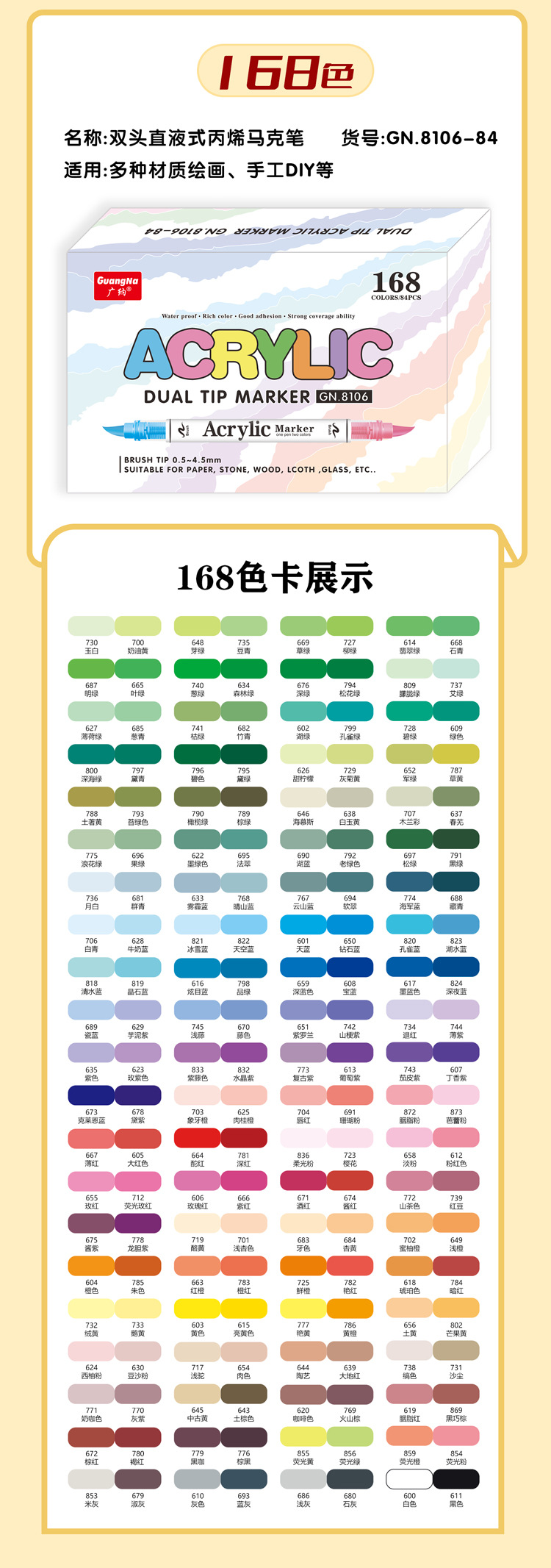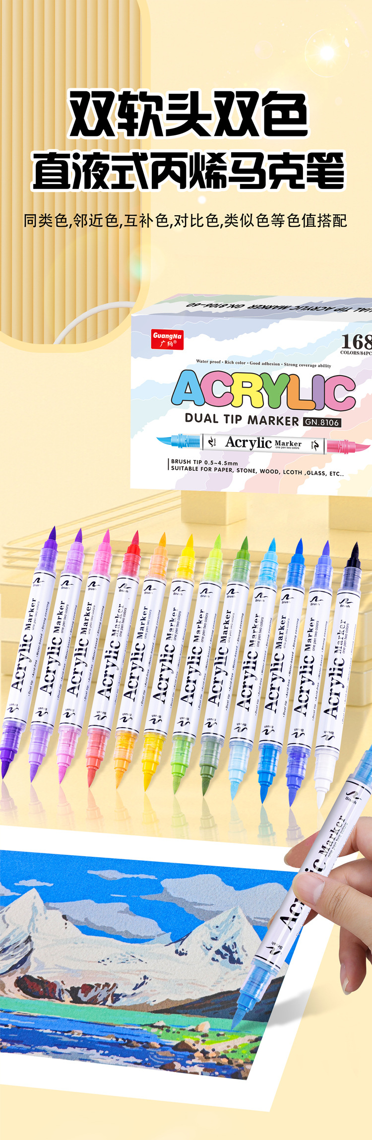 Guangna 8106 doble cabeza suave de doble color líquido directo acrílico marcador de papel opaco 168 color se puede plegar pincel de arte de color