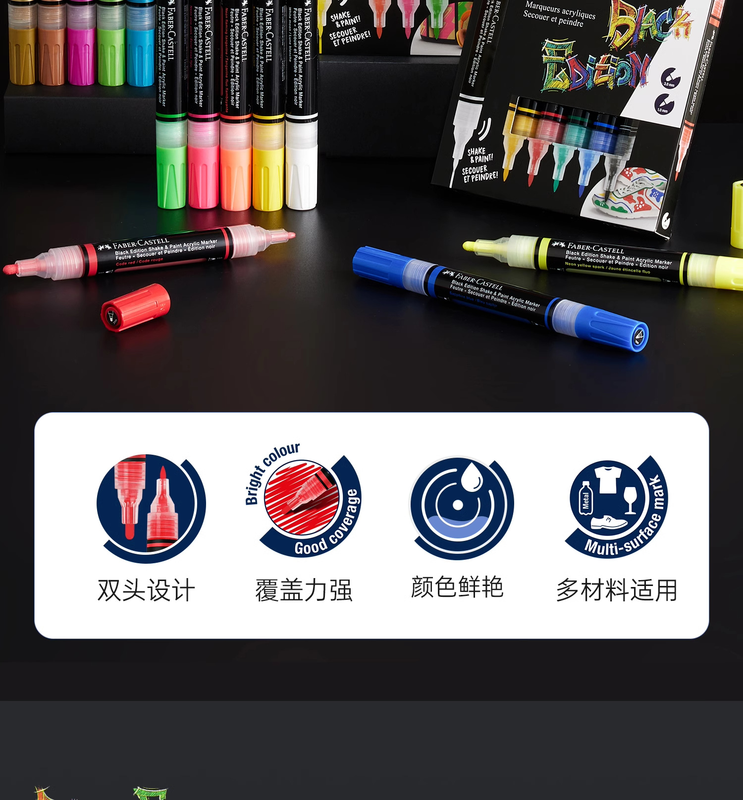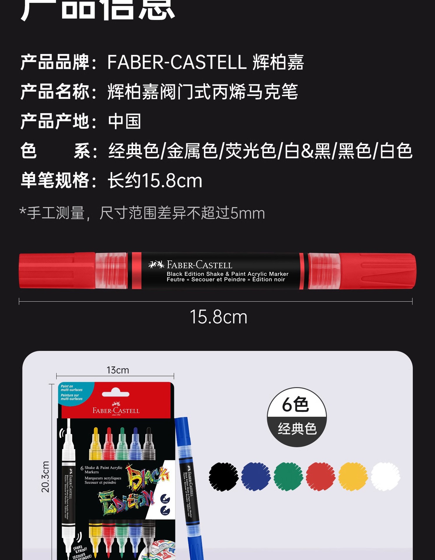| Especificaciones | [6 colores] color clásico, [6 colores] color metálico, [4 colores] color fluorescente, [2 colores] negro / blanco, [monocromático] negro, [monocromático] blanco |