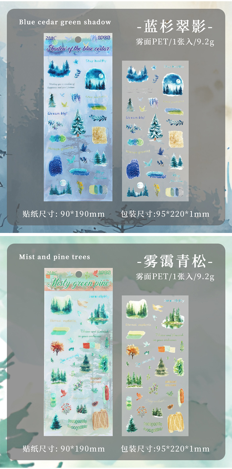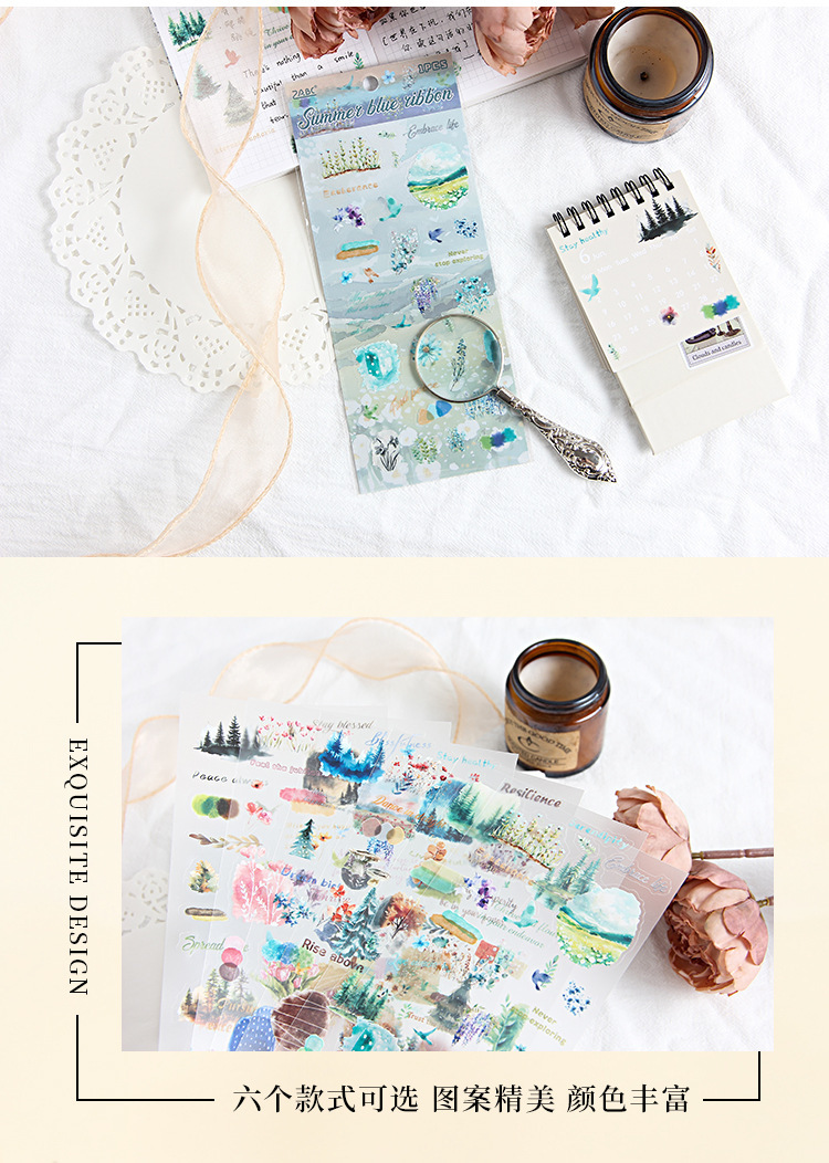 | Color | 1 vegetación y humo, 2 flores florecen en el sendero de cerezo, 3 sombras verdes de abeto azul, 4 cinturones azules de verano, 5 pinos verdes brumosos, 6 y el viento suave |