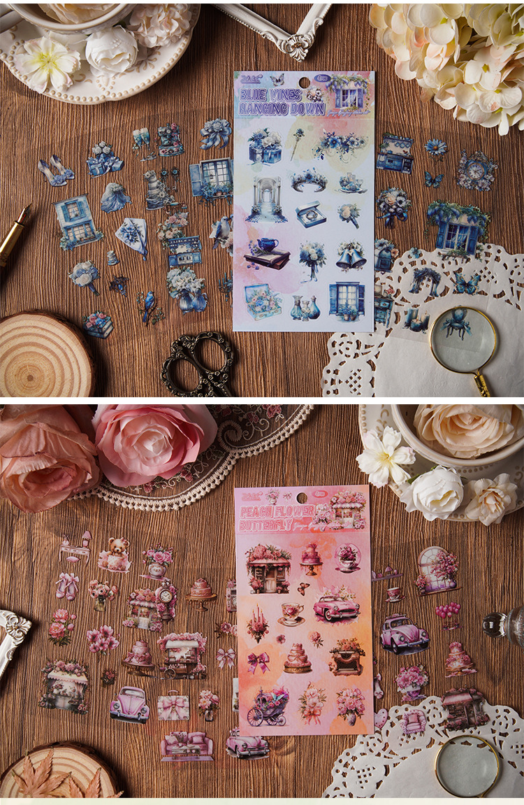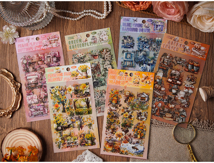 | Colores | 1 flor cae en silencio,2 mariposa melocotón,3 sombra de néctar de abeja,4 hojas de viento otoñal,5 Sombra de mariposa verde,6 Vid azul colgando |