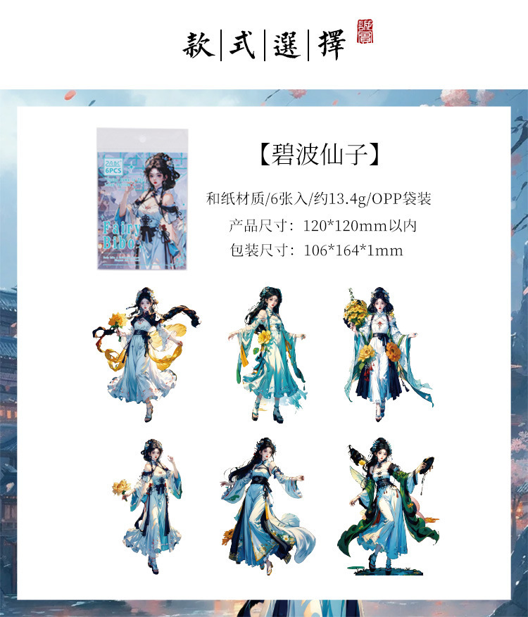 | Color | 1 hada de loto, 2 borlas de nieve, 3 brisa de bambú verde, 4 atardecer dorado, 5 encanto rojo, 6 hadas de olas azules |