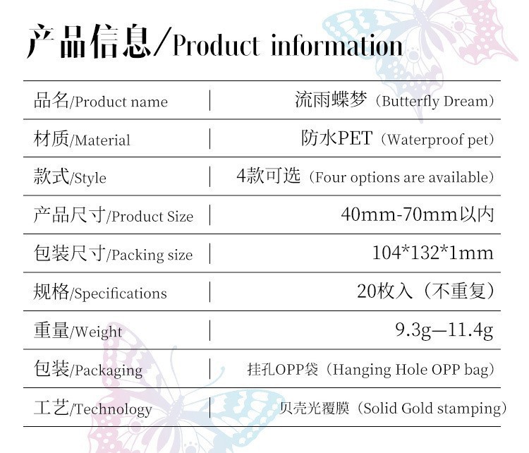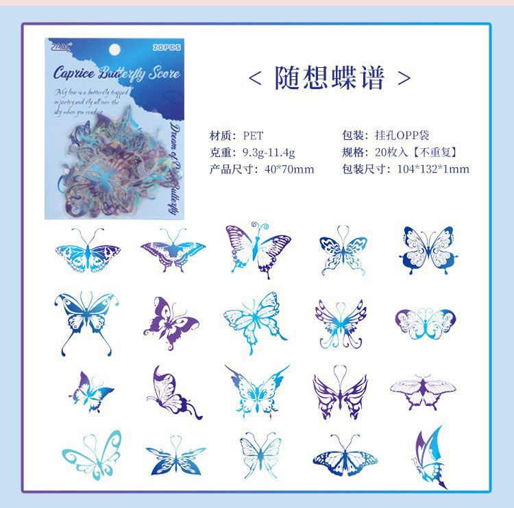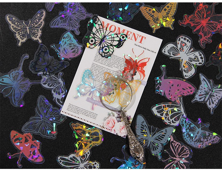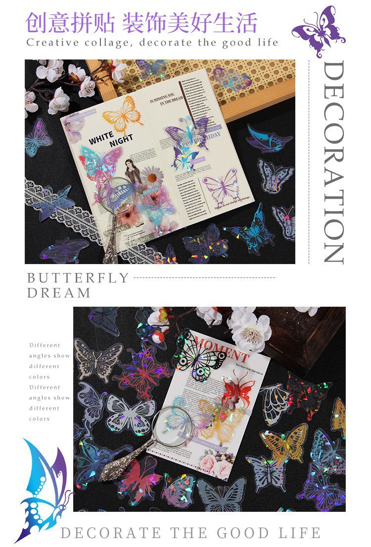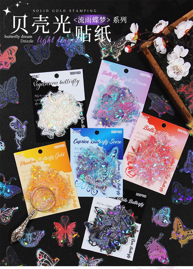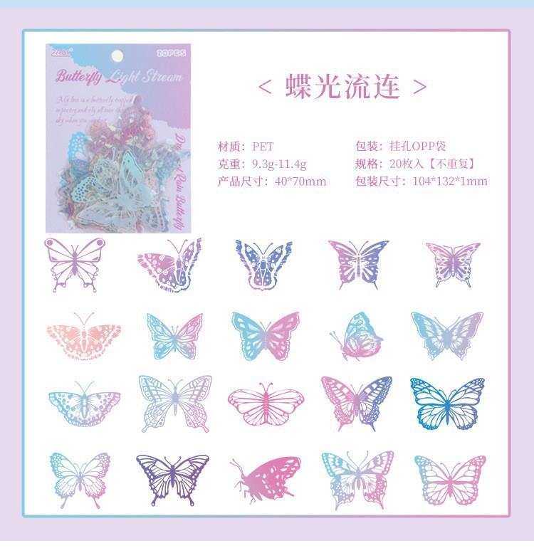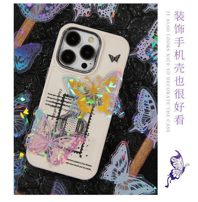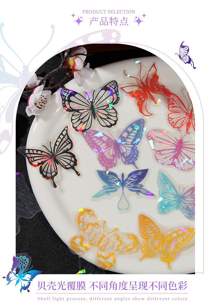 Fluir lluvia mariposa sueño láser transparente pegatinas de mascotas impermeables bolsas DIY cuaderno diario material decorativo pegatinas mariposa hueco