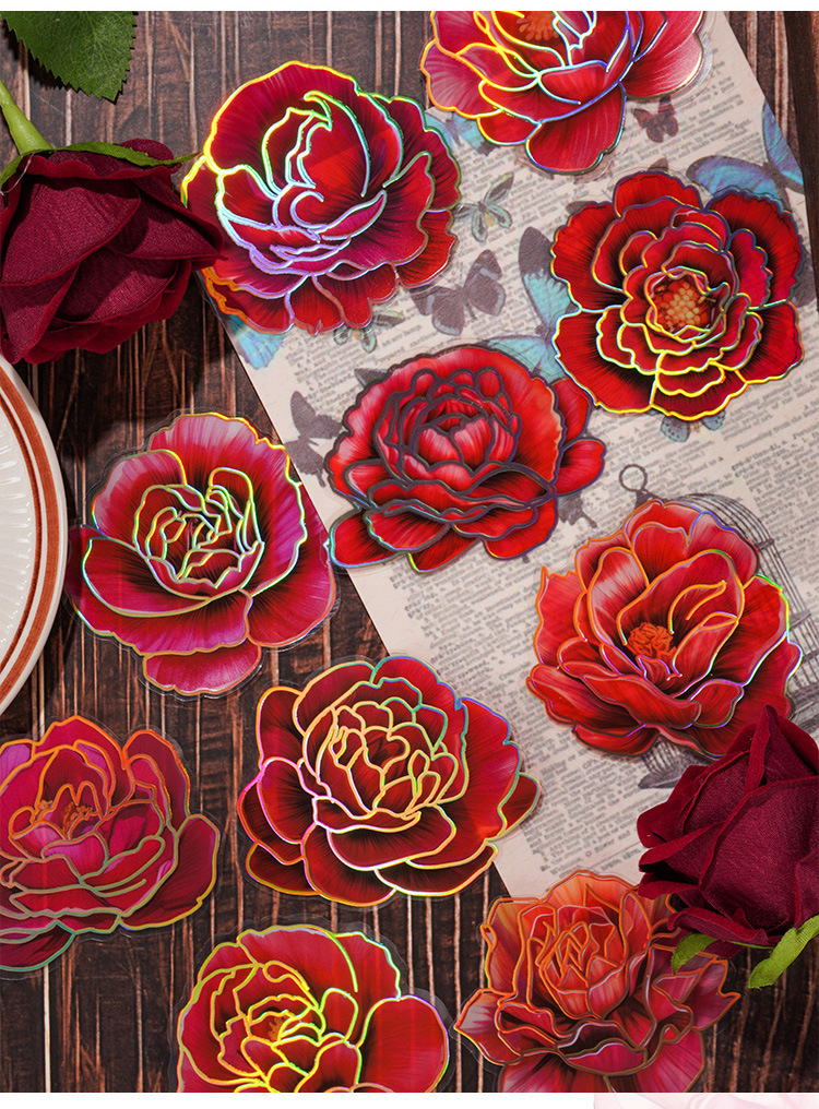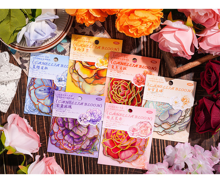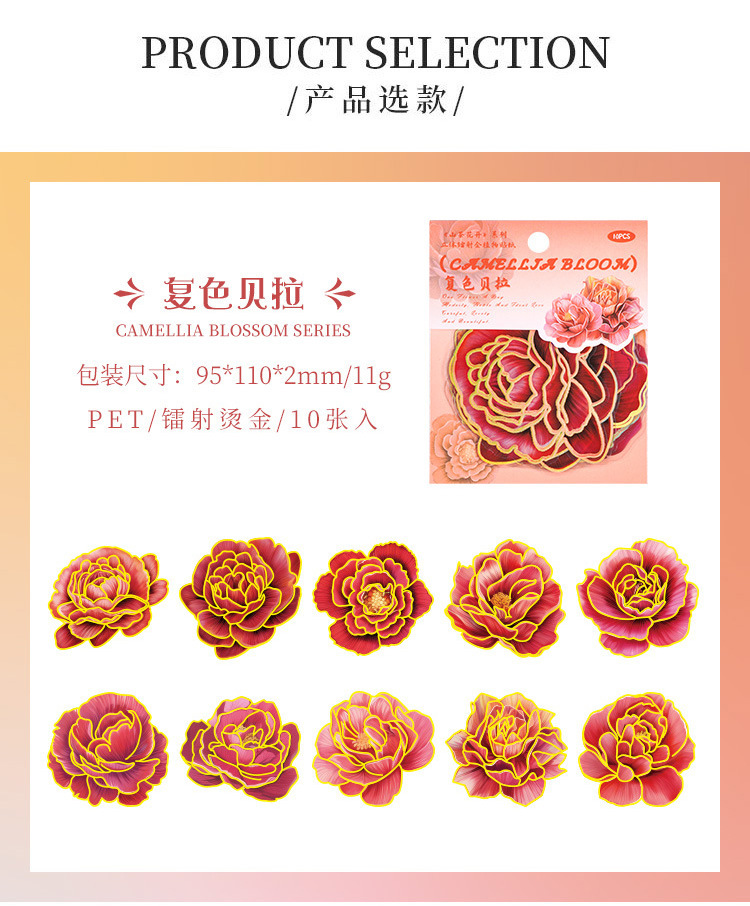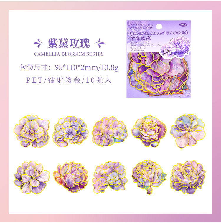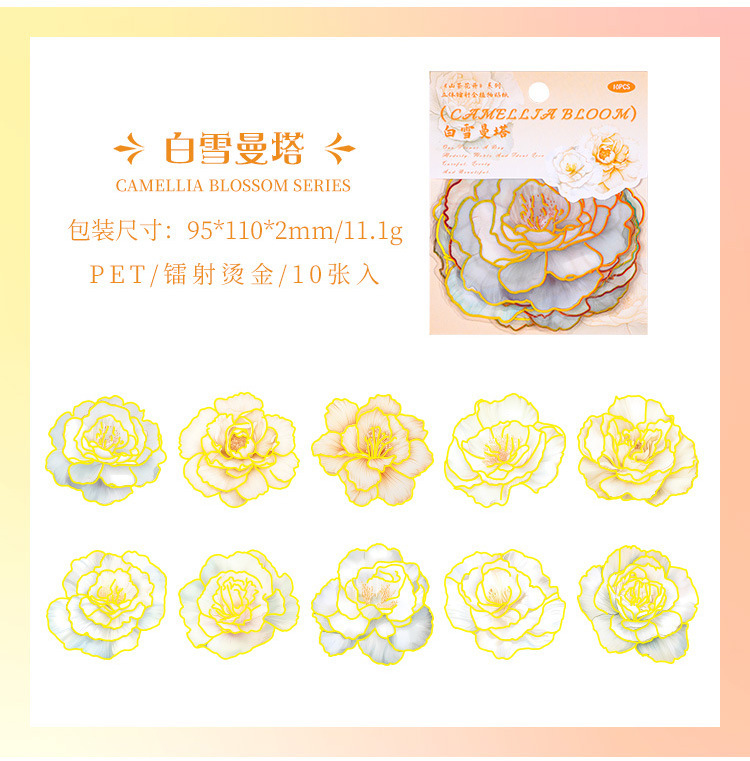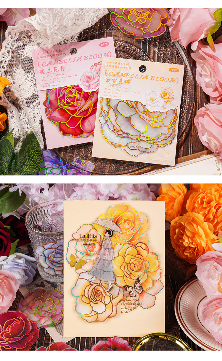 Camelia flor abierta Diario PVC etiqueta impermeable bolsa de papel retro tridimensional dorado pegatinas de flores lindo Diario Goo tarjeta pegatinas