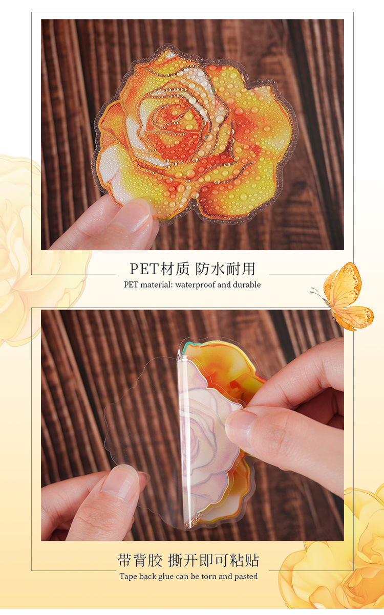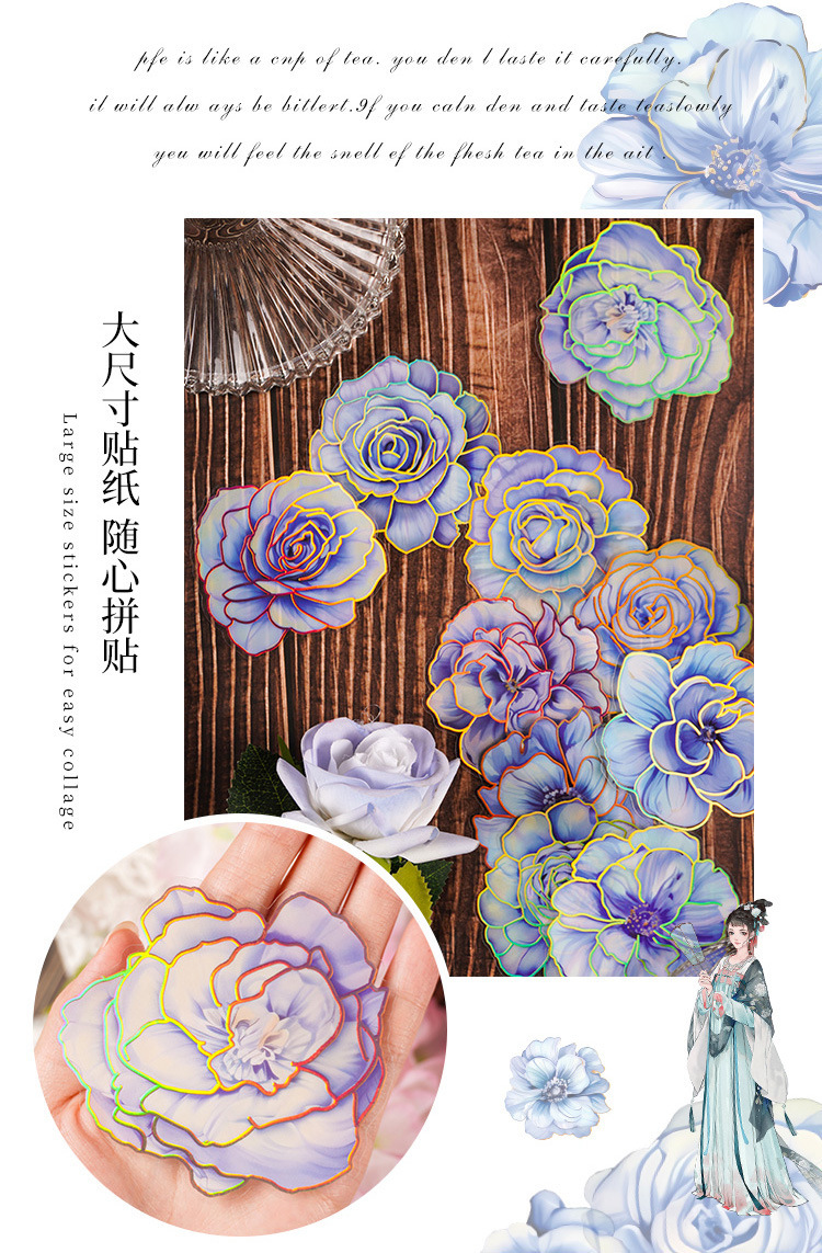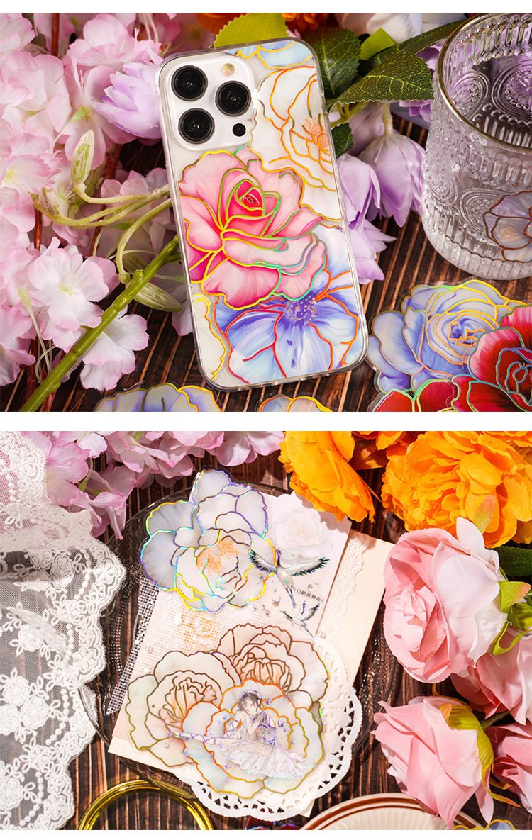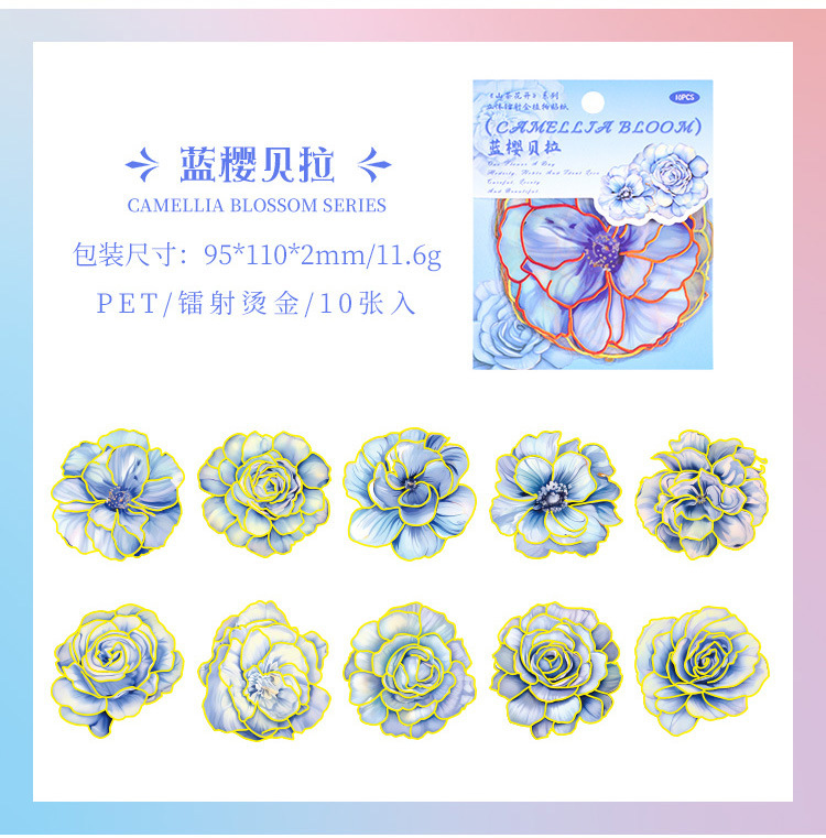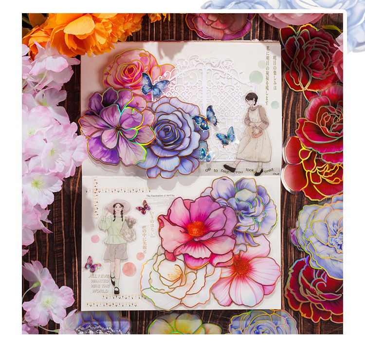 Camelia flor abierta Diario PVC etiqueta impermeable bolsa de papel retro tridimensional dorado pegatinas de flores lindo Diario Goo tarjeta pegatinas