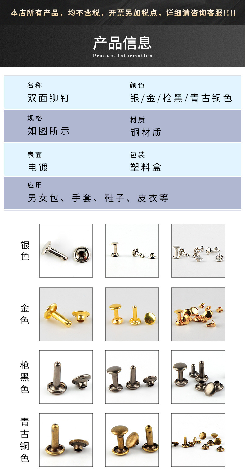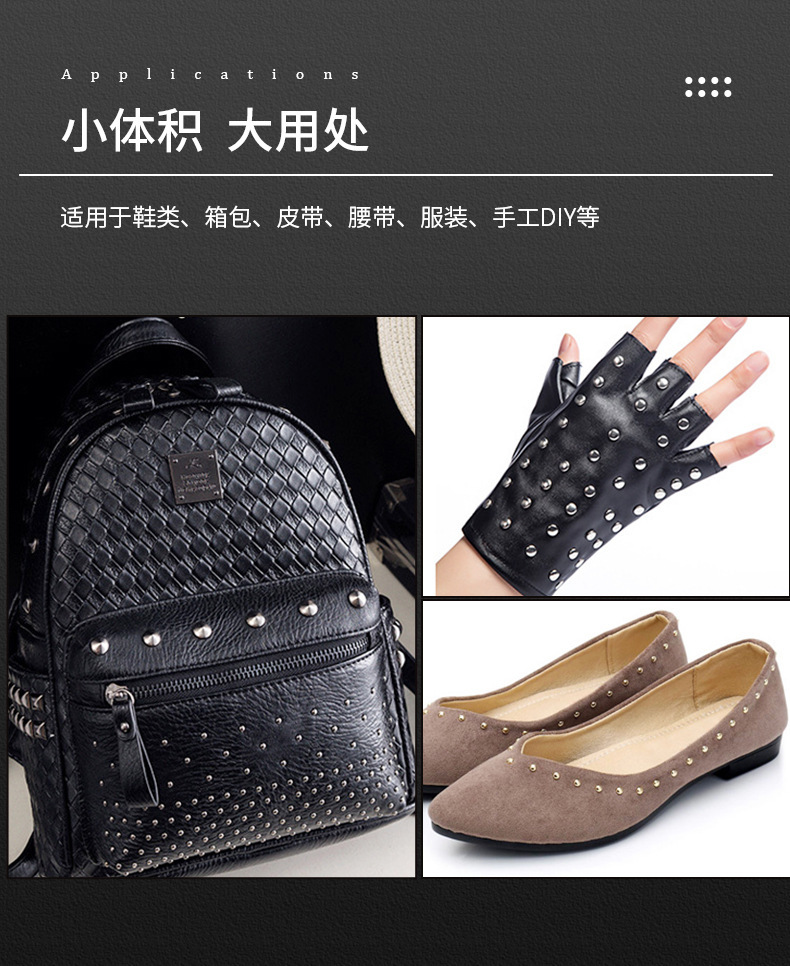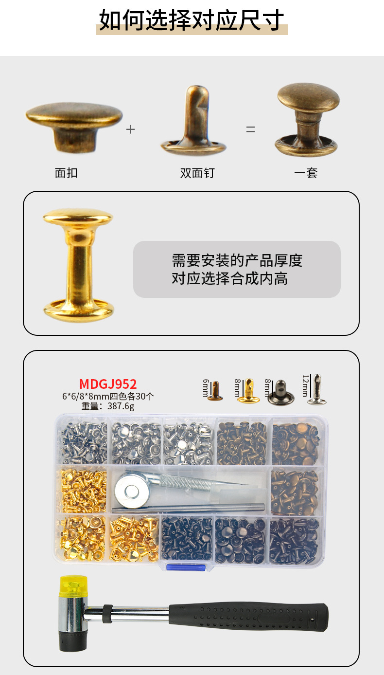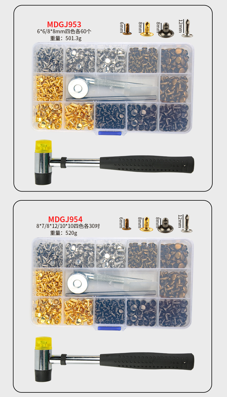 | Modelo de especificación | 831 # 480pcs herramientas * redondo,633 # 480pcs herramientas * redondo,Remache 480pcs herramienta * redondo,Remache 240pcs herramienta * redondo,831 # 480pcs herramientas * redondo * más martillo de montaje,633 # 480pcs herramientas * redondo * más martillo de montaje,Remache 480pcs herramienta * redondo * más martillo de montaje,Remache 240pcs herramienta * redondo * más martillo de montaje,Juego de combinación de hebilla a juego con remaches,Juego de hebilla a juego con cinturón de remaches |