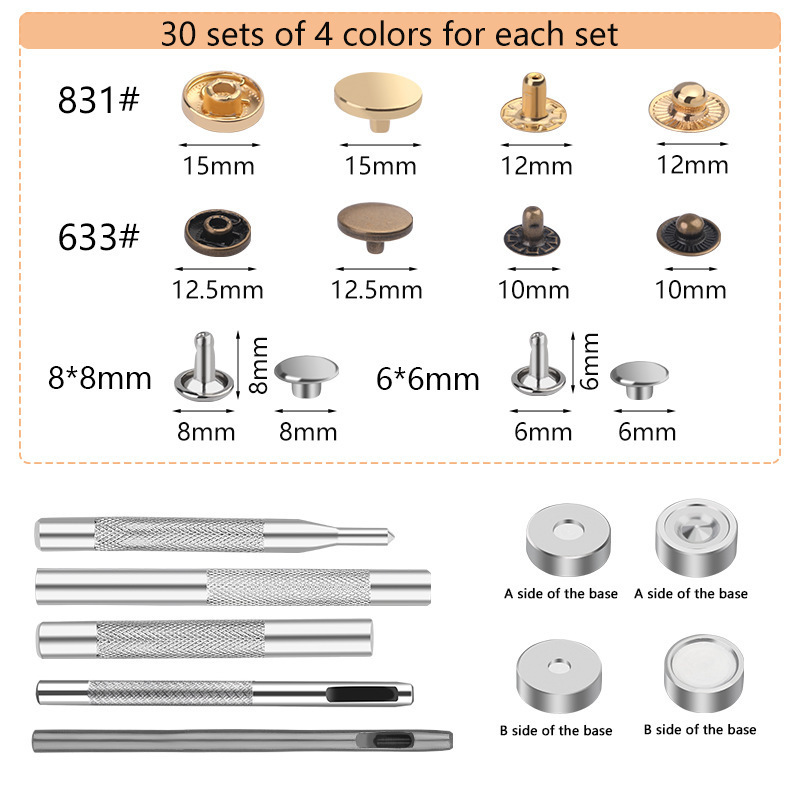 Transfronterizo 633/831 Juego de botones a cuatro bandas en caja Botón redondo de cobre de metal Ropa Botón hembra Accesorios de equipaje