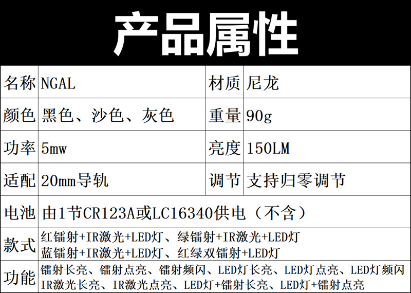 Versión con todas las funciones NGAL-L3 rojo, verde y azul láser IR puntero láser linterna táctica luz LED destello de luz fuerte