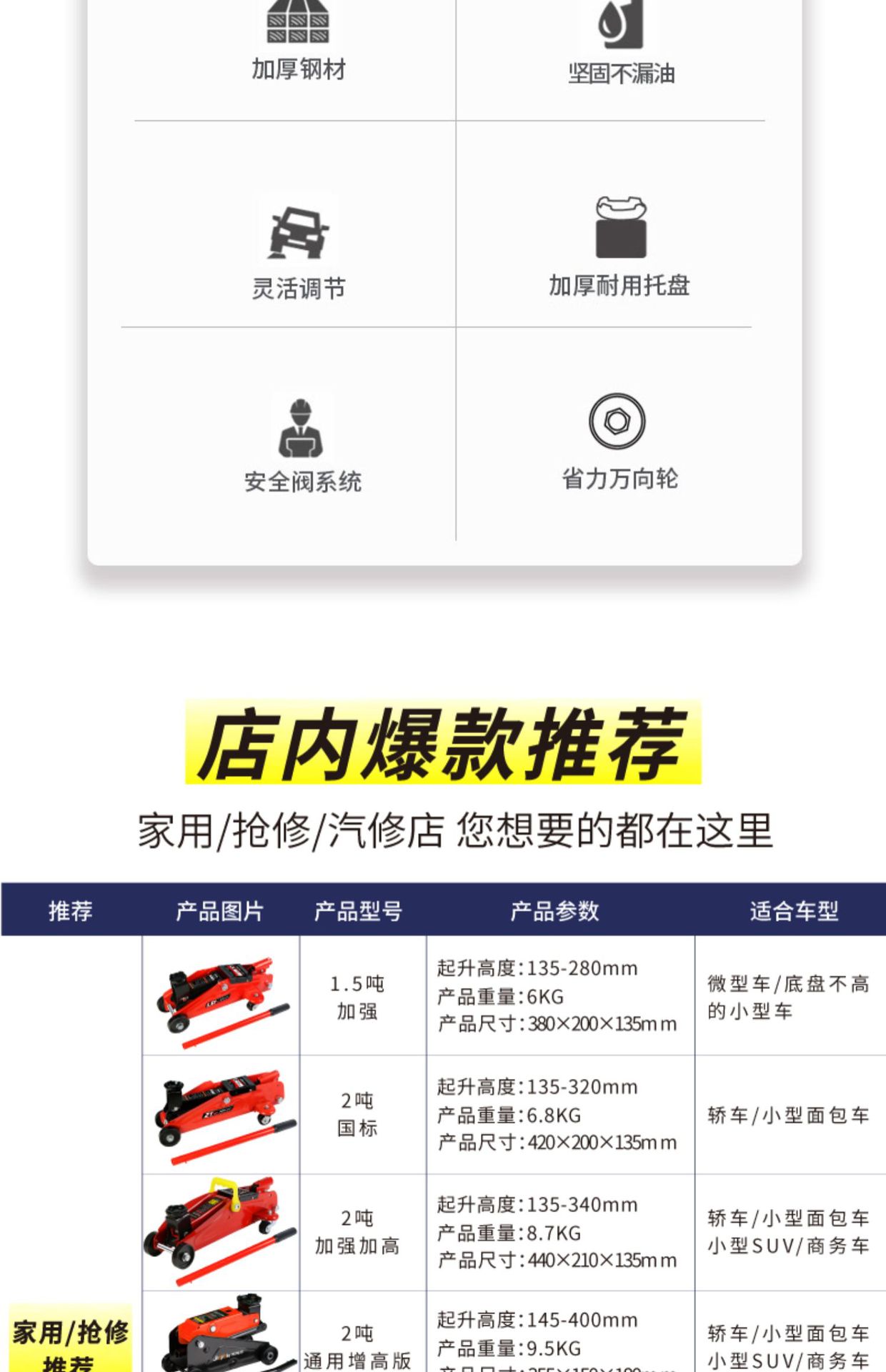 | Modelo | 1,5 toneladas de refuerzo [embalaje de cartón], 1,5 toneladas de refuerzo [embalaje de caja de plástico], 2 toneladas de estándar nacional [embalaje de caja de cartón], 2 toneladas de estándar nacional [embalaje de caja de cartón] + almohadilla de caucho de aumento, 2 toneladas de estándar nacional [embalaje de caja de plástico] + almohadilla de caucho de aumento, 2 toneladas de refuerzo [embalaje de Caja de cartón], 2 toneladas de refuerzo [embalaje de caja de cartón] + almohadilla de caucho de aumento, 2 toneladas de refuerzo [embalaje de caja de plástico], 2 toneladas de refuerzo [embalaje de caja de plástico] + almohadilla de caucho de aumento, 2 toneladas de aumento general [embalaje de caja de cartón], 2 toneladas de aumento general [embalaje de caja de cartón de plástico], 2 toneladas de aumento general [embalaje de caja de cartón de plástico], 2 toneladas de aumento de caja de plástico, 2 toneladas, 2 toneladas de aumento general [2,5 toneladas refuerzo de bajo nivel [embalaje de caja de cartón], refuerzo de bajo nivel [embalaje de caja de plástico], 2,5 toneladas de embalaje integral de bajo nivel [con llave inglesa / barra de presión 360 grados girando con el corazón], 2,5 toneladas de embalaje de caja de cartón de bajo nivel [barra de presión 360 grados girando con el corazón] - embalaje de caja de cartón, 2,5 toneladas de embalaje de almacenamiento de bajo nivel [barra de presión 360 grados girando con el corazón] - embalaje de almacenamiento, 2,5 toneladas de embalaje de almacenamiento de bajo nivel [barra de presión 360 grados girando con el corazón] + embalaje de mantenimiento, Aumento reforzado de 3 toneladas [embalaje de caja de cartón], aumento reforzado de 3 toneladas [embalaje de caja de plástico], versión súper alta de 3 toneladas [embalaje de caja de cartón] [suv grande Recomendación], 3 toneladas de peso pesado [uso común en la tienda de reparación de automóviles], 3,5 toneladas de peso pesado [uso común en la tienda de reparación de automóviles], 3 toneladas de bomba doble súper baja + almohadilla de Goma [uso especial en la tienda de reparación de automóviles], 3 toneladas de bomba doble súper baja [uso especial en la tienda de reparación de automóviles], 4 toneladas de bomba doble súper baja [uso especial en la tienda de reparación de automóviles], 5 toneladas de bomba doble baja [uso especial en la tienda de reparación de automóviles], 1,5 toneladas de refuerzo [embalaje en caja de cartón] + llave inglesa, 2 toneladas de estándar nacional [embalaje en caja de cartón] + llave inglesa, 2 toneladas de refuerzo en caja de cartón] + llave inglesa, 2 toneladas de refuerzo en caja de cartón [embalaje de cartón] + llave inglesa, 2 toneladas de refuerzo en caja de cartón, 2 toneladas de refuerzo aumentar [caja de plástico] + llave inglesa, 2 toneladas de aumento general [caja de cartón] + llave inglesa, 2 toneladas de aumento general [caja de plástico] + llave inglesa, 2,5 toneladas de refuerzo súper bajo [caja de cartón] + llave inglesa, 2,5 toneladas de refuerzo súper bajo [caja de plástico] + llave inglesa, 3 toneladas de refuerzo [caja de cartón] + llave inglesa, 3 toneladas de refuerzo [caja de plástico] + llave inglesa, Versión súper alta de 3 toneladas [caja de cartón] [recomendación de SUV grandes] + llave inglesa, 1,5 toneladas de refuerzo [caja de cartón] [robo limitado], 1,5 toneladas de refuerzo [paquete de almacenamiento] [robo limitado] |