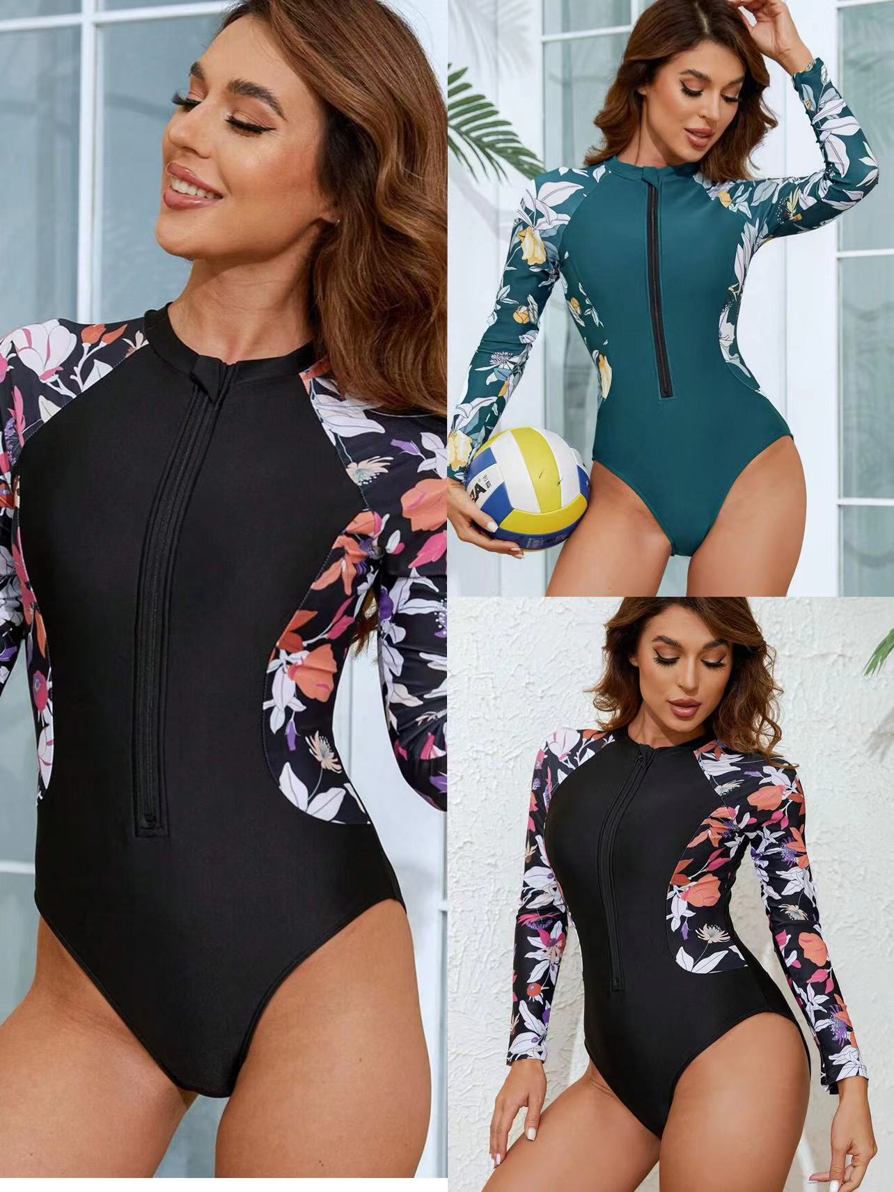 Trajes de baño de una sola pieza de manga larga conservadora impresión de abdomen protector solar bikini mujeres 2024 comercio exterior transfronterizo