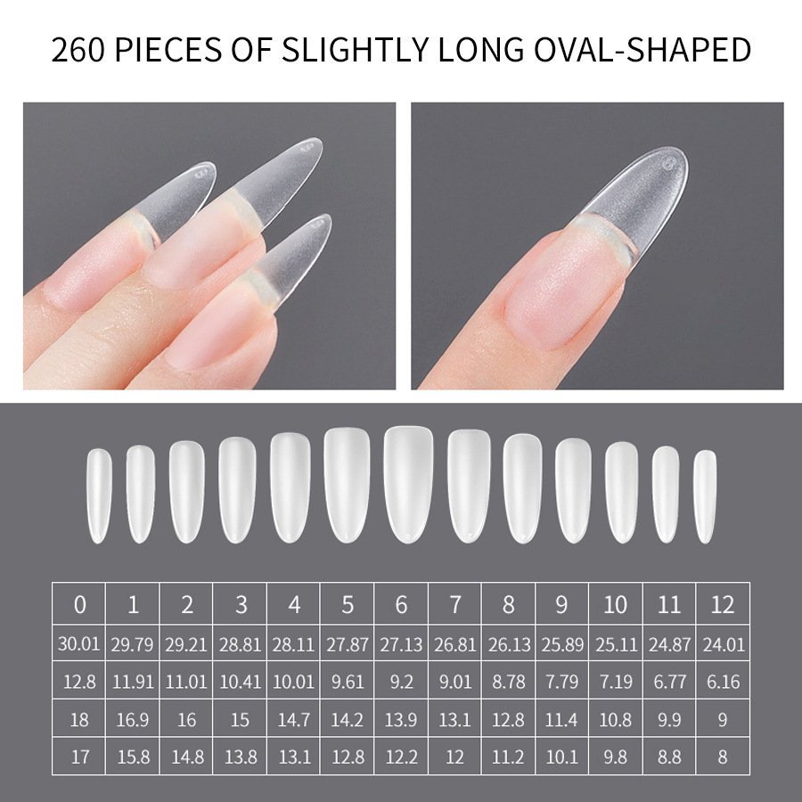 | Color | 260 piezas largas de uñas esmeriladas ovaladas |