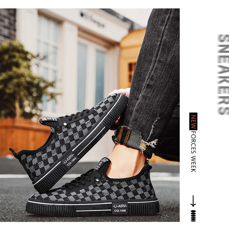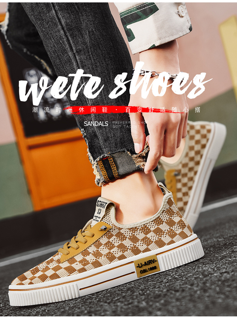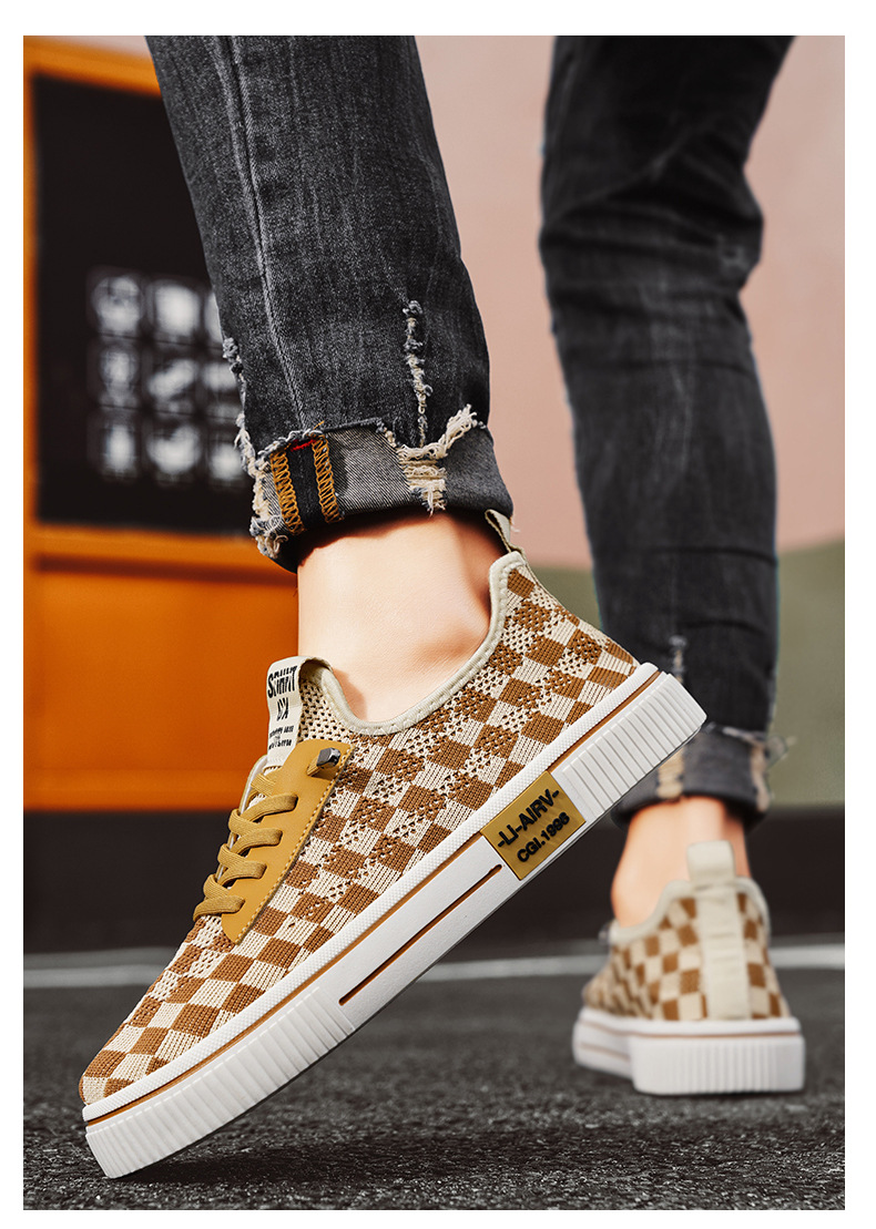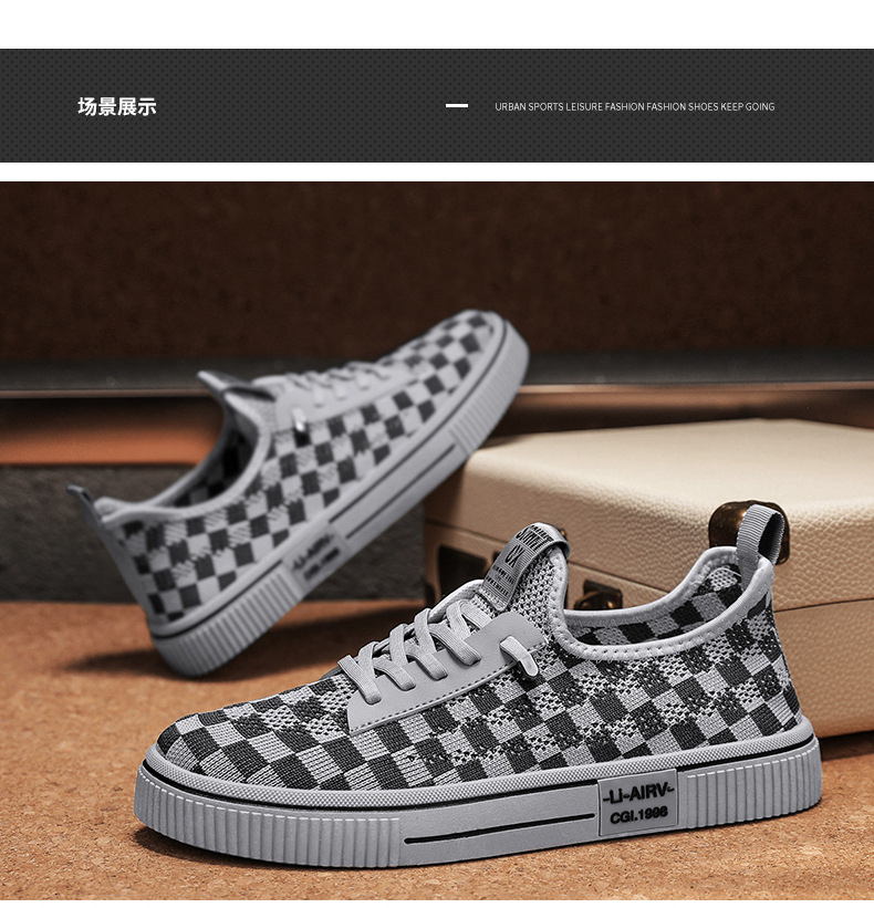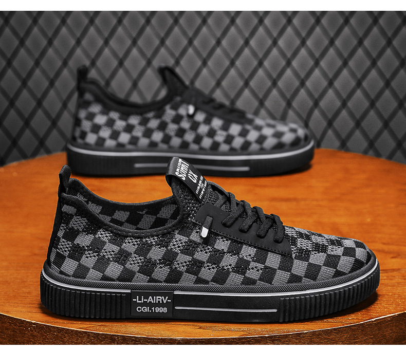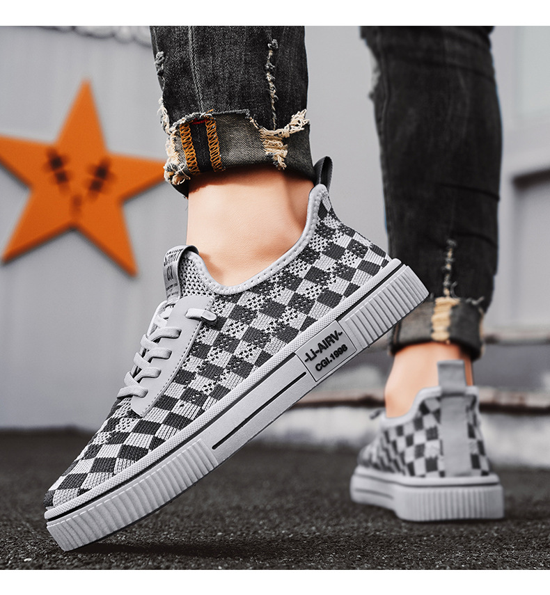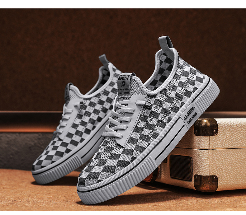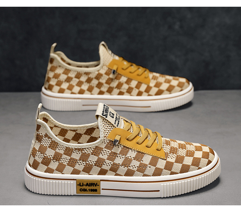 Zapatillas transpirables tejidas voladoras deportivas de verano de diseño, ligeras, de ojos grandes, zapatos de música en vivo para hombre a cuadros al aire libre