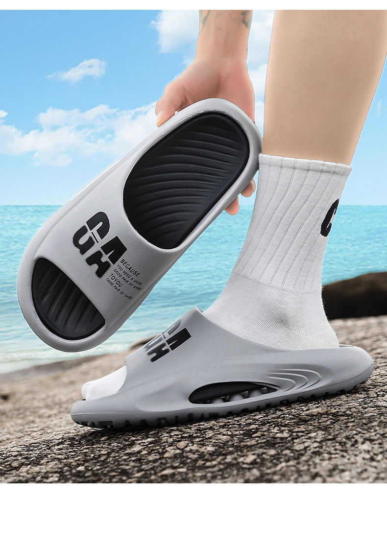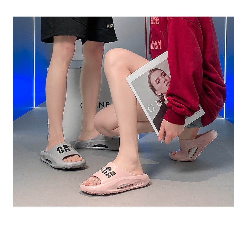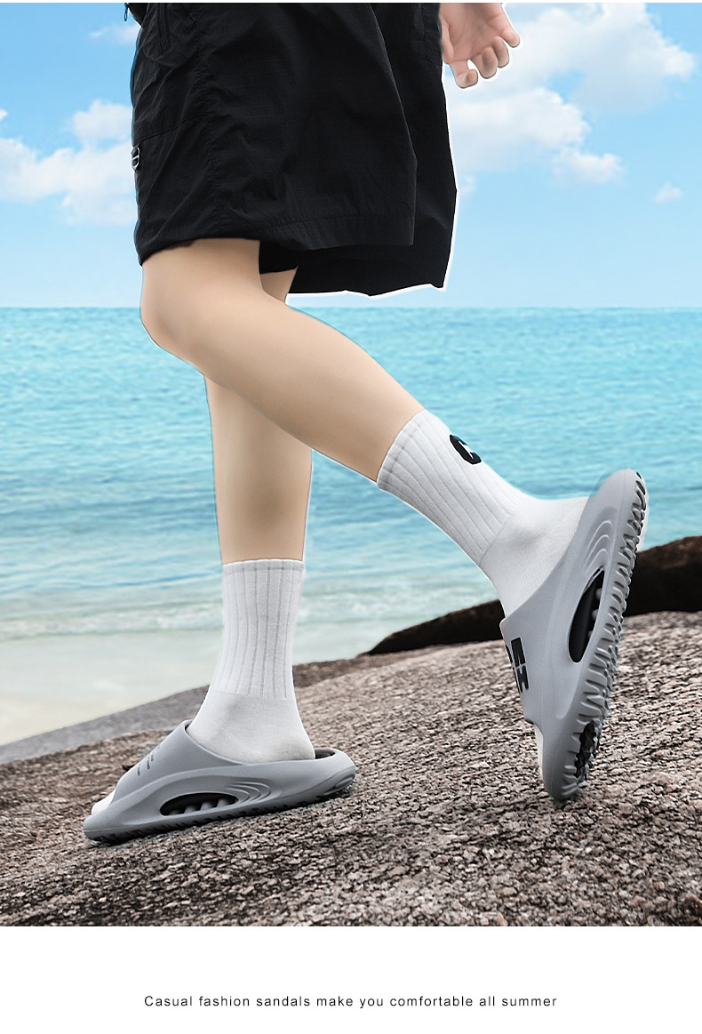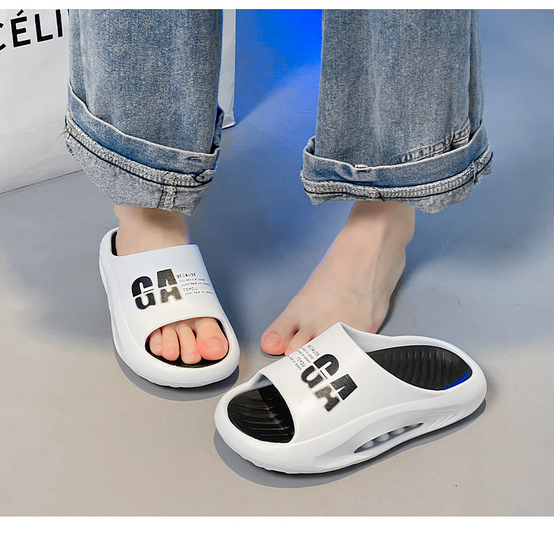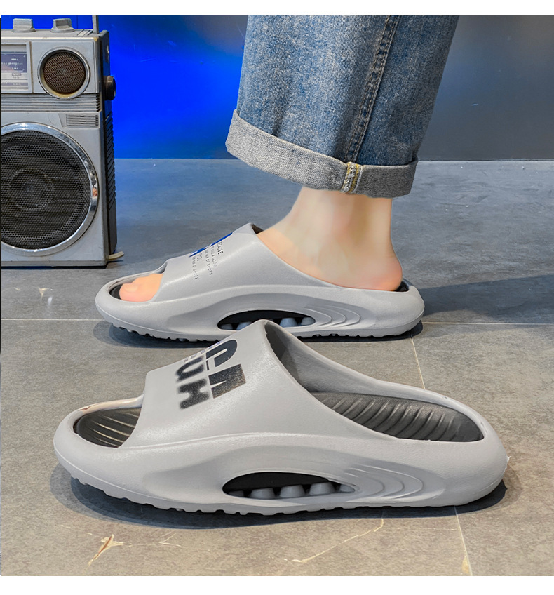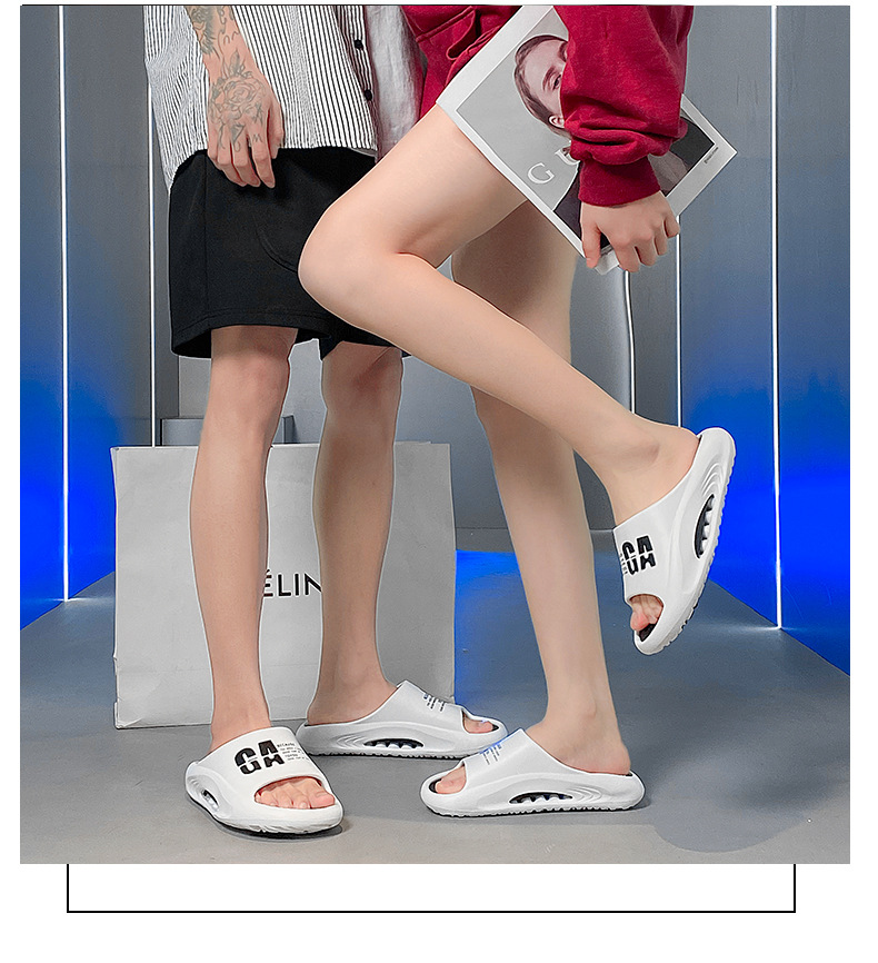 Los hombres de verano se ponen cómodos en el hogar, zapatillas de callejera para parejas.