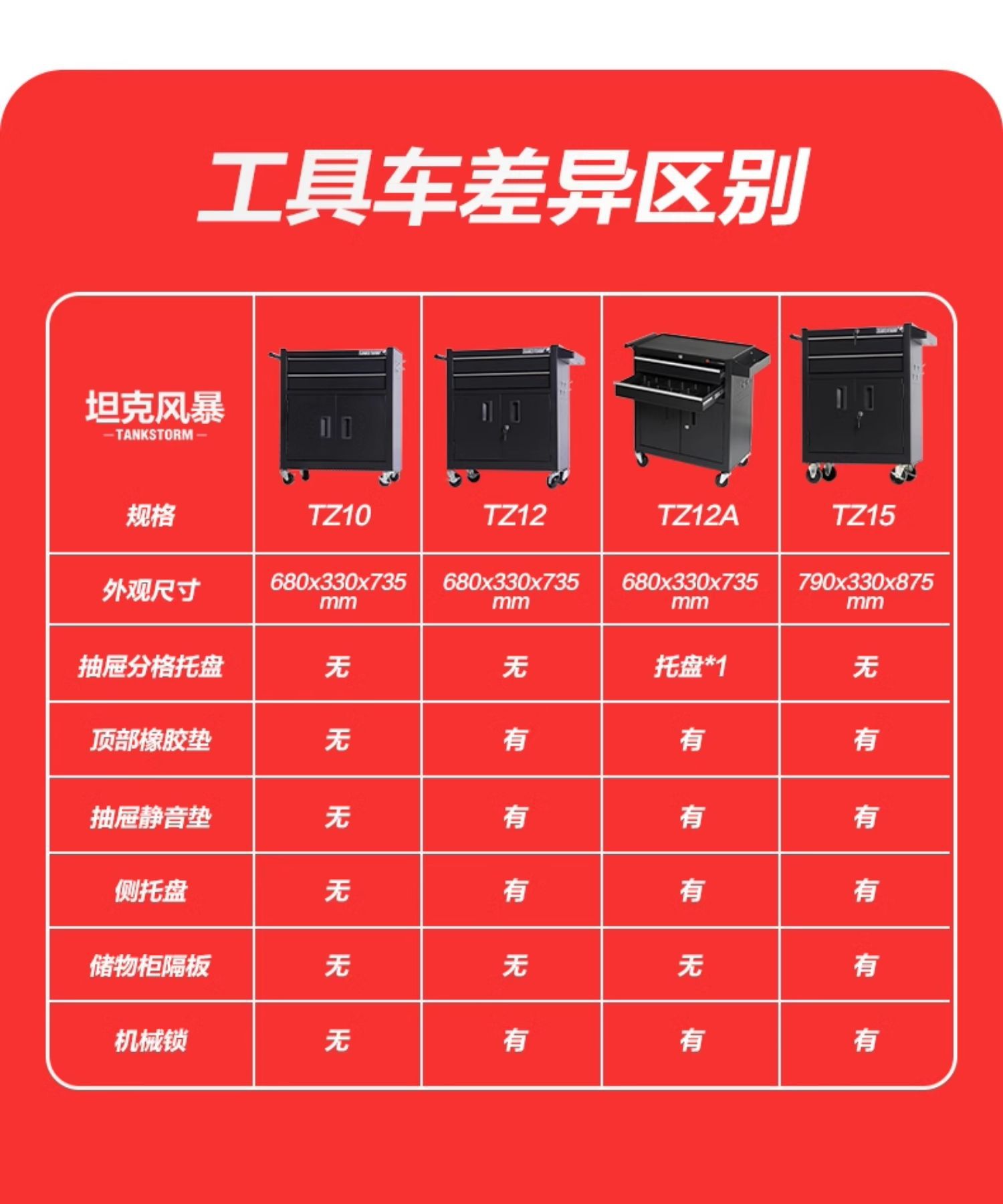 | Modelo | TZ8 negro [división de un solo extractor + cerradura de la puerta del gabinete], TZ10 negro [dos extractores + rueda silenciosa de doble freno], TZ12 negro [dos extractores + rueda silenciosa de doble freno + cerradura del gabinete], TZ12 rojo [dos extractores + rueda silenciosa de doble freno + cerradura del gabinete], TZ12 negro y amarillo [dos extractores + rueda silenciosa de doble freno + cerradura del gabinete], TZ12 azul [dos extractores + rueda silenciosa de doble freno + cerradura del gabinete], TZ12 negro [dos extractores + caja de plástico roja], TZ201 negro cinco cajones + armario, TZ220 negro ocho cajones + armario, TZ12A negro [bloqueo del cajón + cerradura de la puerta del gabinete + bandeja del cajón], TZ10 paquete de tatuaje negro, TZ12 paquete de tatuaje negro, TZ12W negro [tatuaje], TZ15 negro [doble cajón más alto + partición + cerradura del gabinete], TZ10 negro + paquete A, TZ12 negro + paquete A, TZ15 negro + paquete A, TZ64H negro [industrial más grueso cuatro cajones], TZ363 negro [industrial más alto tres cajones], TZ12 doble cajón negro + conjunto de 123 piezas, TZ12 doble juego negro + 128 piezas, X - 73 negro [buque insignia de tres extractores + gabinete de doble puerta], B - 883 [buque insignia de tres extractores + gabinete de doble puerta] |