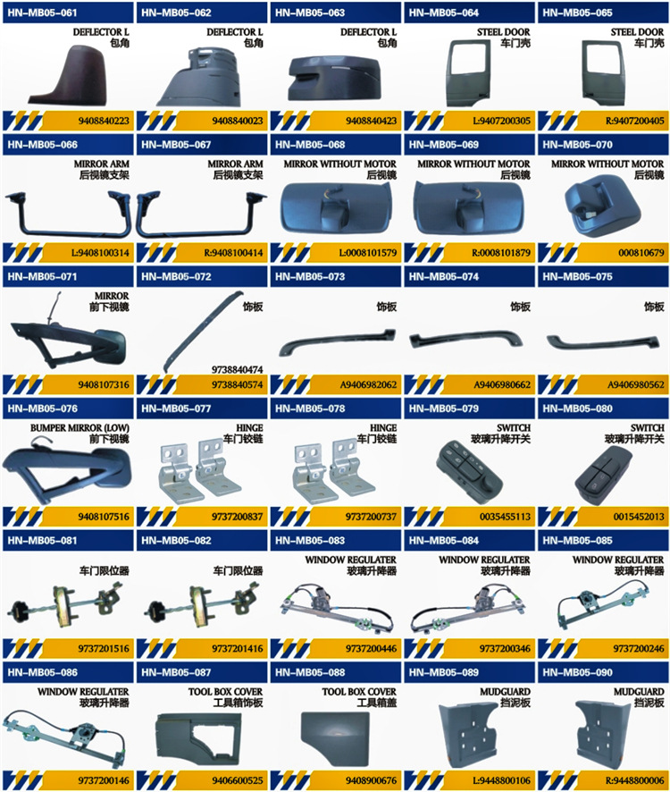 | Color | bisagras, malla central 9448800085, malla central 9408880223, placa de acabado 9738840574, ángulo de envoltura 9448840222, ángulo de envoltura 9448840322, placa de acabado 9448840422, placa de acabado 9448840522, ángulo de envoltura 9448840122, ángulo de envoltura 9448840022, ángulo de envoltura 9408840323, ángulo de envoltura 9408840223, Ángulo de envoltura 9408840123, Ángulo de envoltura 9408840023, Ángulo de envoltura 9408840523, Ángulo de envoltura 9408840423, Carcasa de la puerta 9407200305, Carcasa de la puerta 9407200405, Soporte del espejo retrovisor 9408100314, Soporte del espejo retrovisor 9408100414, Espejo retrovisor 0008101579, Espejo retrovisor 0008101879 Espejo retrovisor cuadrado 000810679, Espejo frontal inferior 9408107316 |