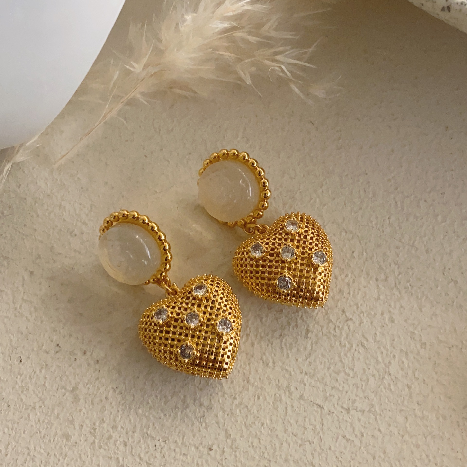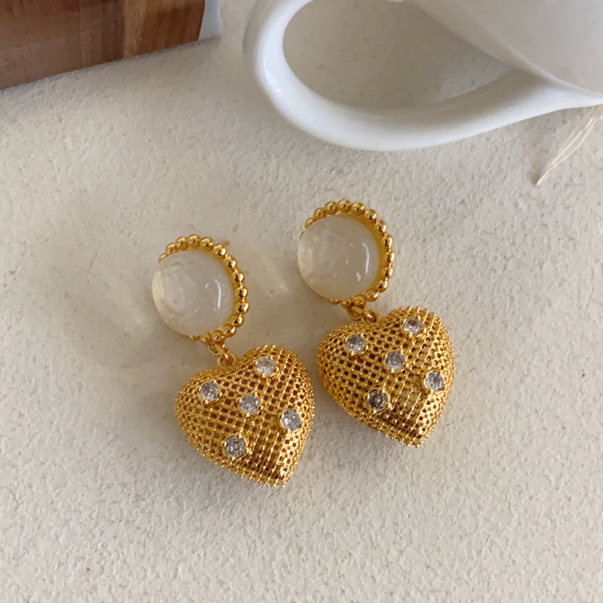 Oro tejido corazón ZIRCON colgante pendientes cóncavo-convexo textura elegante pendientes corte francés estilo retro alto sentido