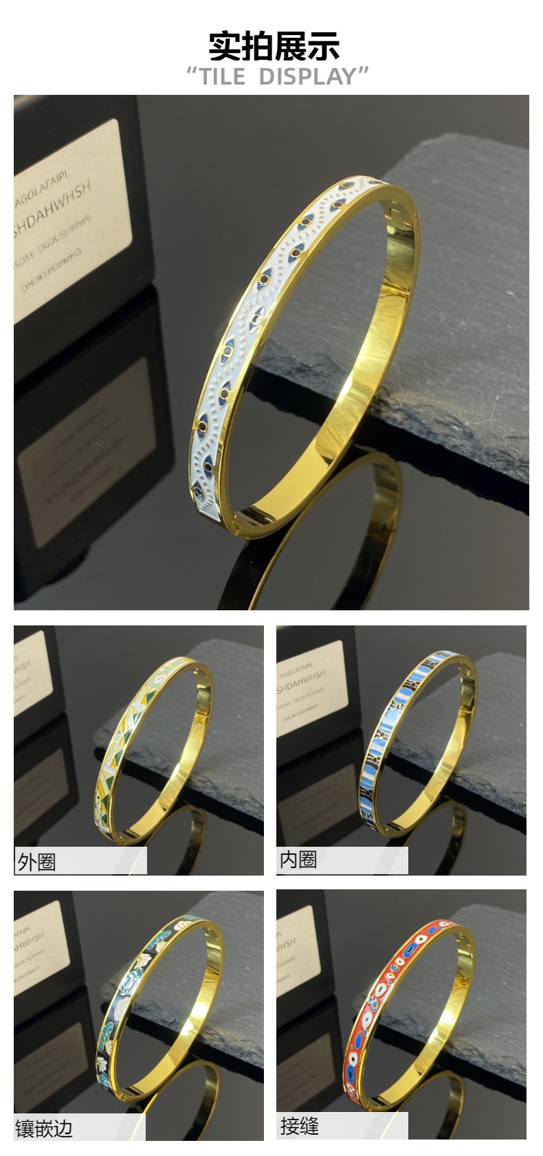 | Color | [4173] brazalete de oro blanco con ojos, [4182] brazalete de oro negro con ojos, [4172] brazalete de oro ondulado con agua, [4175] brazalete de oro de flores y hojas, [4176] brazalete de oro rojo-azul, [4174] brazalete de oro de arroz geométrico, [4183] brazalete de oro negro-azul geométrico |