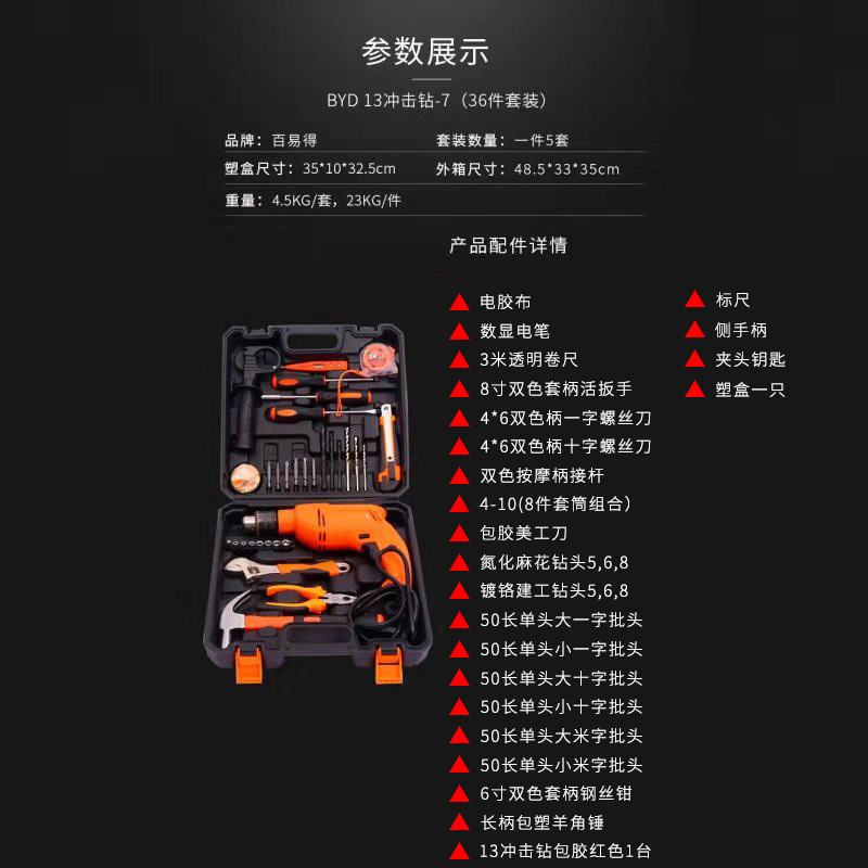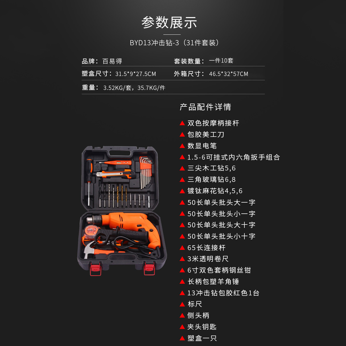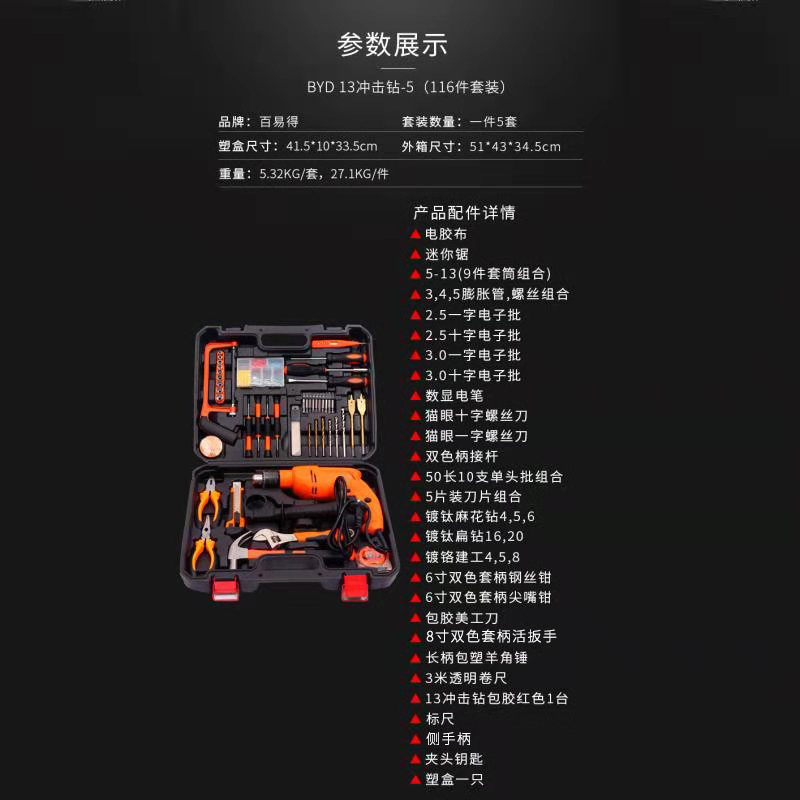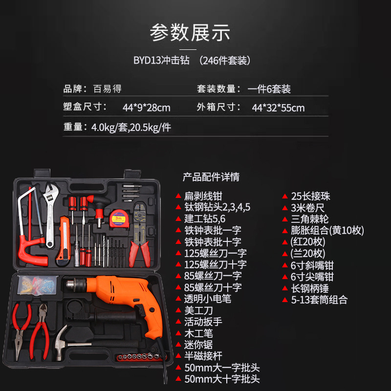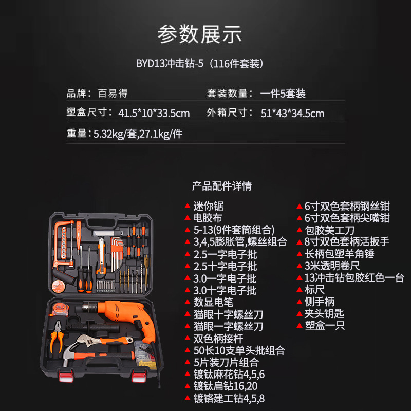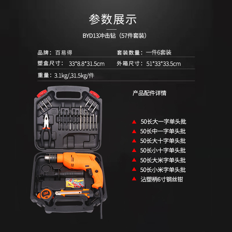 | Modelo | 28-piece impacto taladro conjunto,Taladro de impacto de 31 piezas,Taladro de impacto 35-piece Set,Taladro de impacto Juego de 36 piezas,Juego de 47 piezas Taladro de impacto,Juego de brocas de impacto de 57 piezas,Conjunto de taladro de impacto de 85 piezas,Taladro de impacto 101-piece Set,Juego de brocas de impacto de 106 piezas,113-piece juego de taladro de impacto,Juego de 116 piezas Taladro de impacto,Taladro de impacto 118-piece Set,Juego de 122 piezas Taladro de impacto,Juego de brocas de impacto de 124 piezas,Juego de perforación de impacto de 128 piezas,Juego de taladro de impacto de 246 piezas,Mini martillo eléctrico (con llave universal),Mini martillo eléctrico (con multímetro),Conjunto de tres piezas Big Mac |