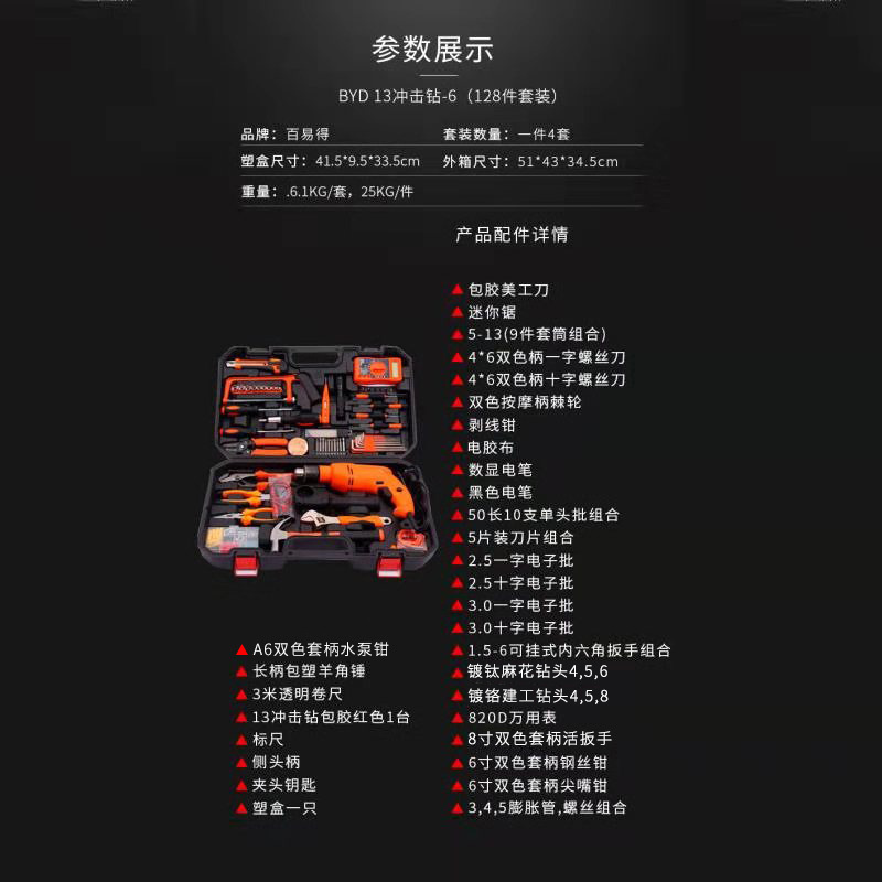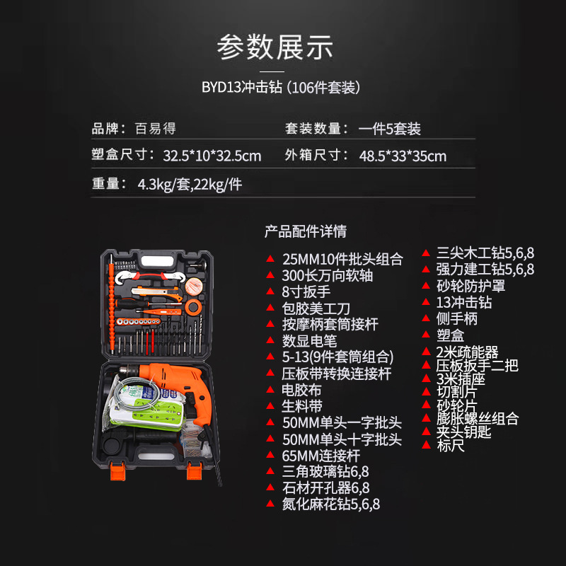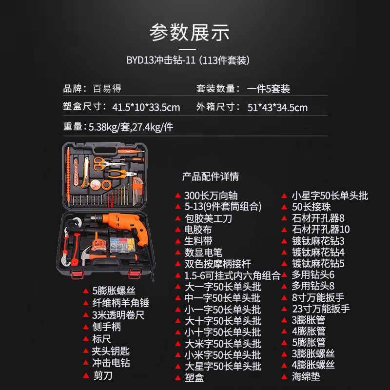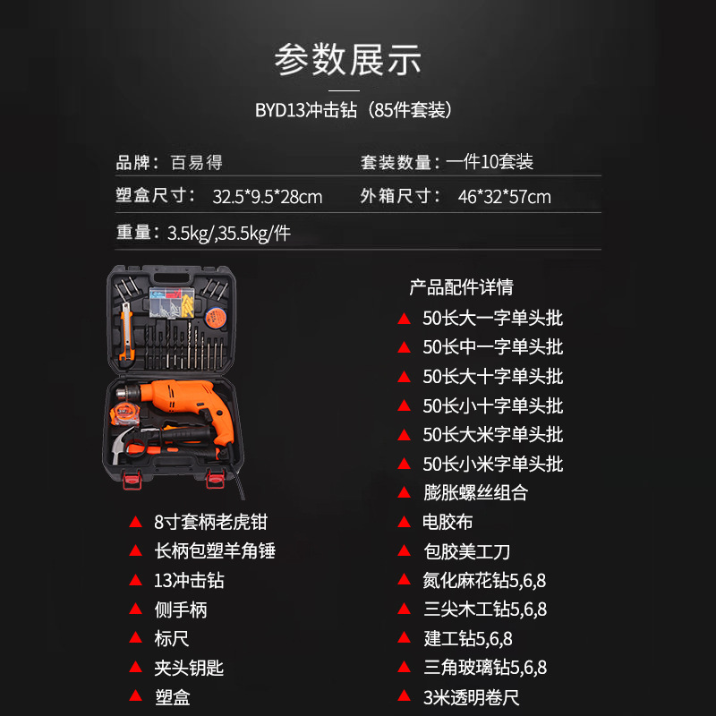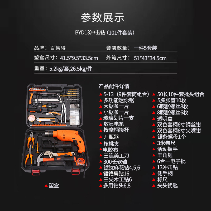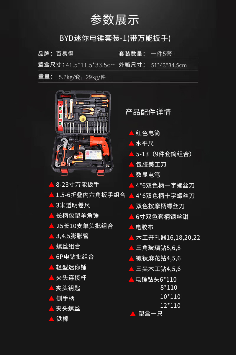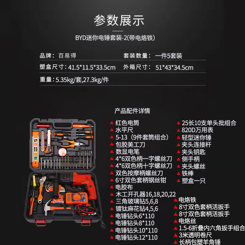 | Modelo | 28-piece impacto taladro conjunto,Taladro de impacto de 31 piezas,Taladro de impacto 35-piece Set,Taladro de impacto Juego de 36 piezas,Juego de 47 piezas Taladro de impacto,Juego de brocas de impacto de 57 piezas,Conjunto de taladro de impacto de 85 piezas,Taladro de impacto 101-piece Set,Juego de brocas de impacto de 106 piezas,113-piece juego de taladro de impacto,Juego de 116 piezas Taladro de impacto,Taladro de impacto 118-piece Set,Juego de 122 piezas Taladro de impacto,Juego de brocas de impacto de 124 piezas,Juego de perforación de impacto de 128 piezas,Juego de taladro de impacto de 246 piezas,Mini martillo eléctrico (con llave universal),Mini martillo eléctrico (con multímetro),Conjunto de tres piezas Big Mac |